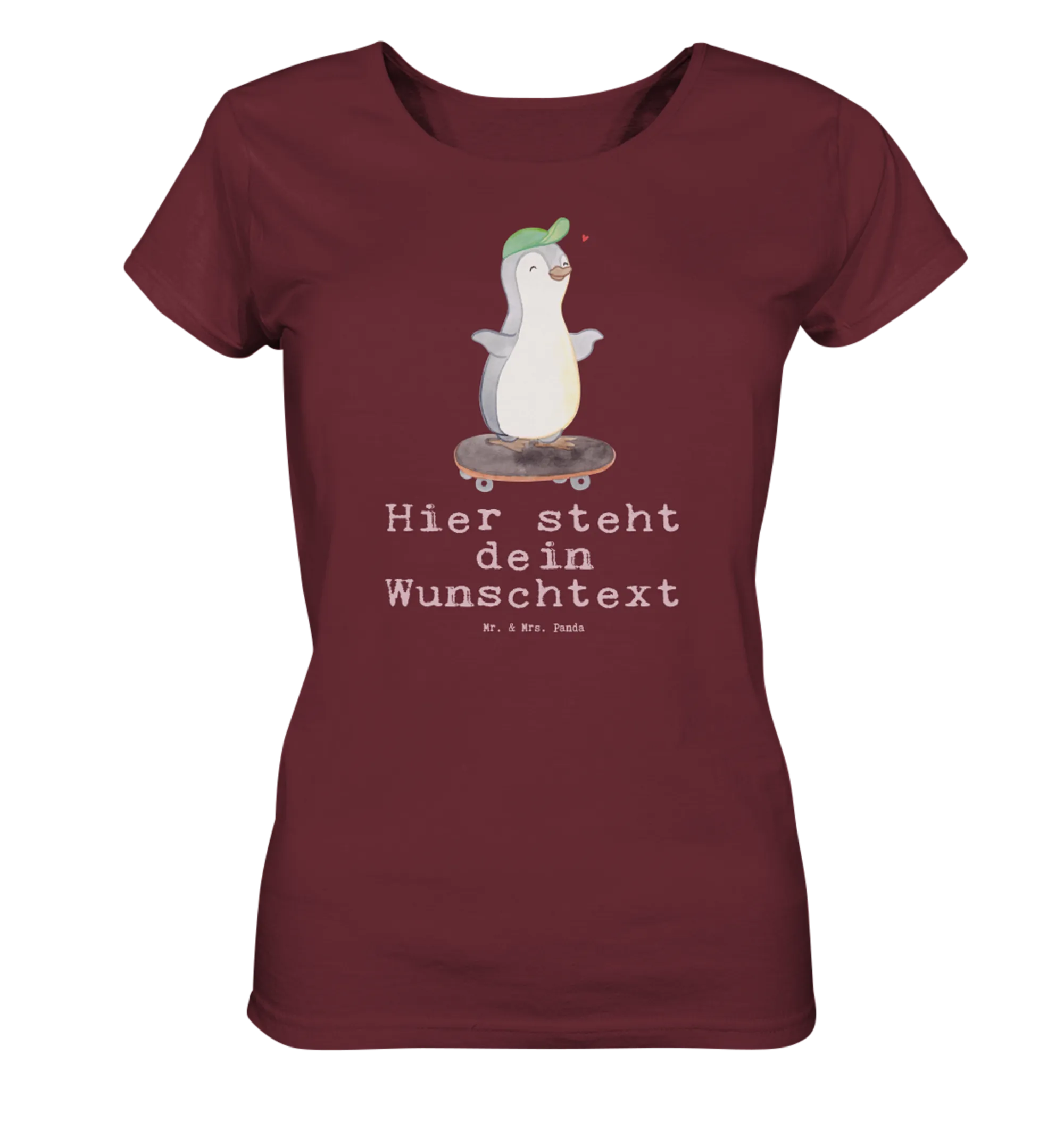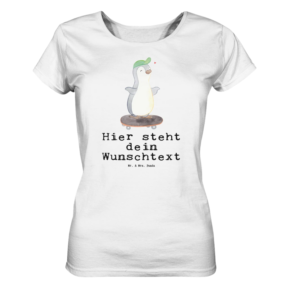 Das personalisierte Shirt Damen mit dem süßen Pinguin, der begeistert mit seinem Skateboard in ein Käppi auf dem Kopf durch die Welt rollt, ist das perfekte Geschenk für alle Sport- und Skate-Begeisterten! Egal, ob für den nächsten Junggesellenabschied, einen Geburtstag oder um einfach "Danke" zu sagen, dieses T-Shirt ist ein echter Hingucker und bringt garantiert gute Laune.