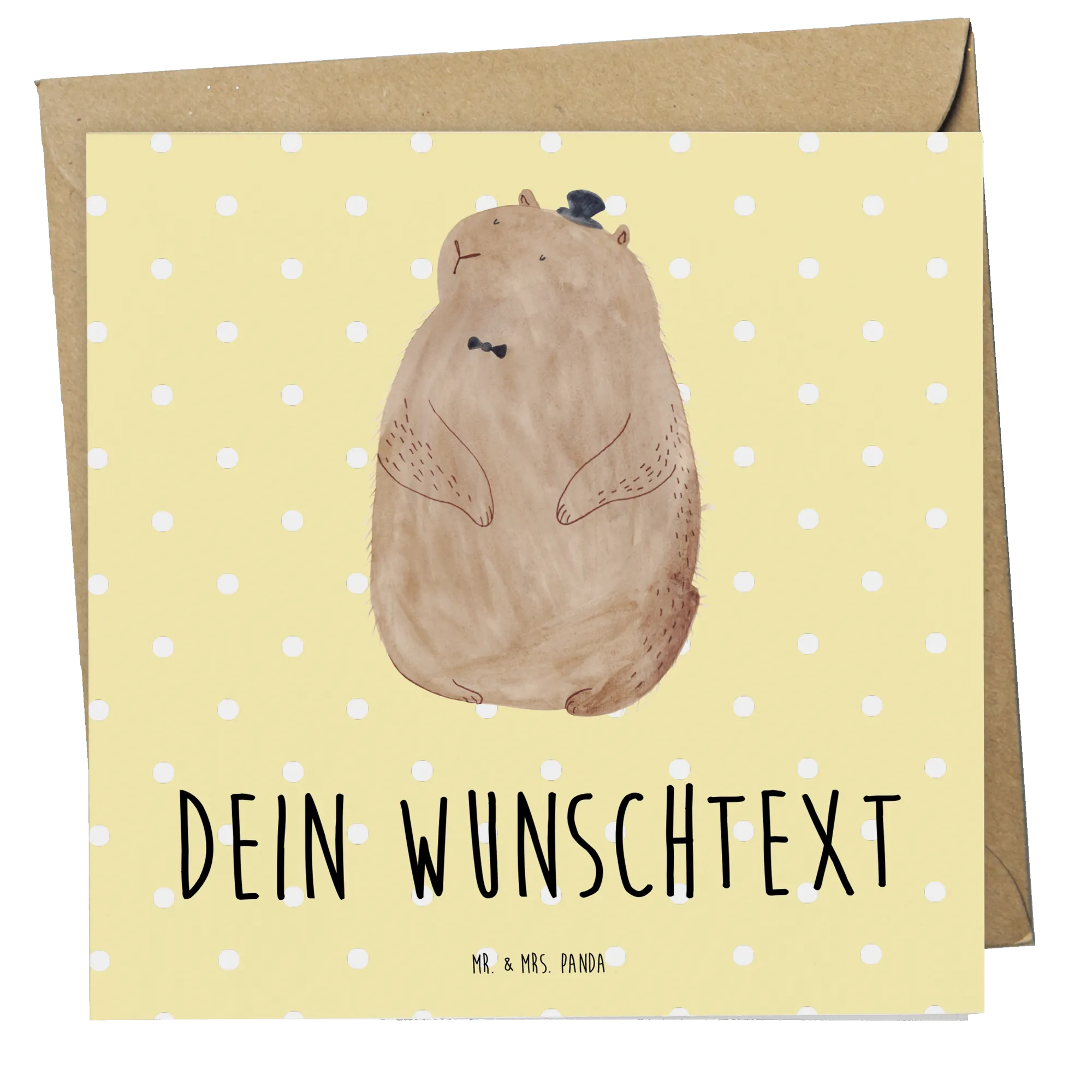Unsere liebevoll gestaltete, personalisierte Grußkarte mit dem charmanten Murmeltier ist das ideale Geschenk für alle, die Freundlichkeit, Anstand und gute Laune wertschätzen. Das handgezeichnete Aquarell-Motiv von Mrs. Panda zeigt ein flauschiges Murmeltier mit kleinem Zylinder – ein echter Blickfang, der zum Schmunzeln einlädt. 😊