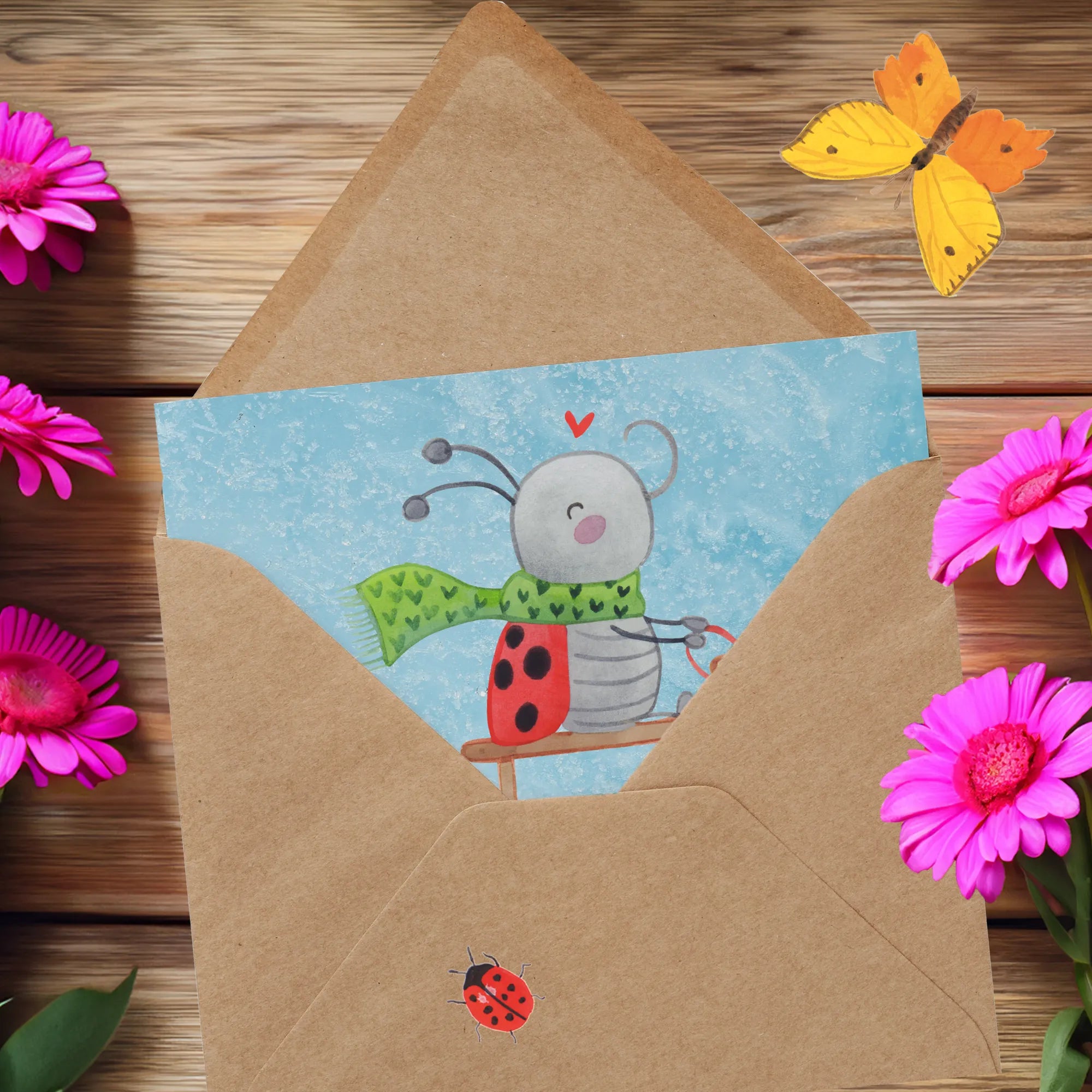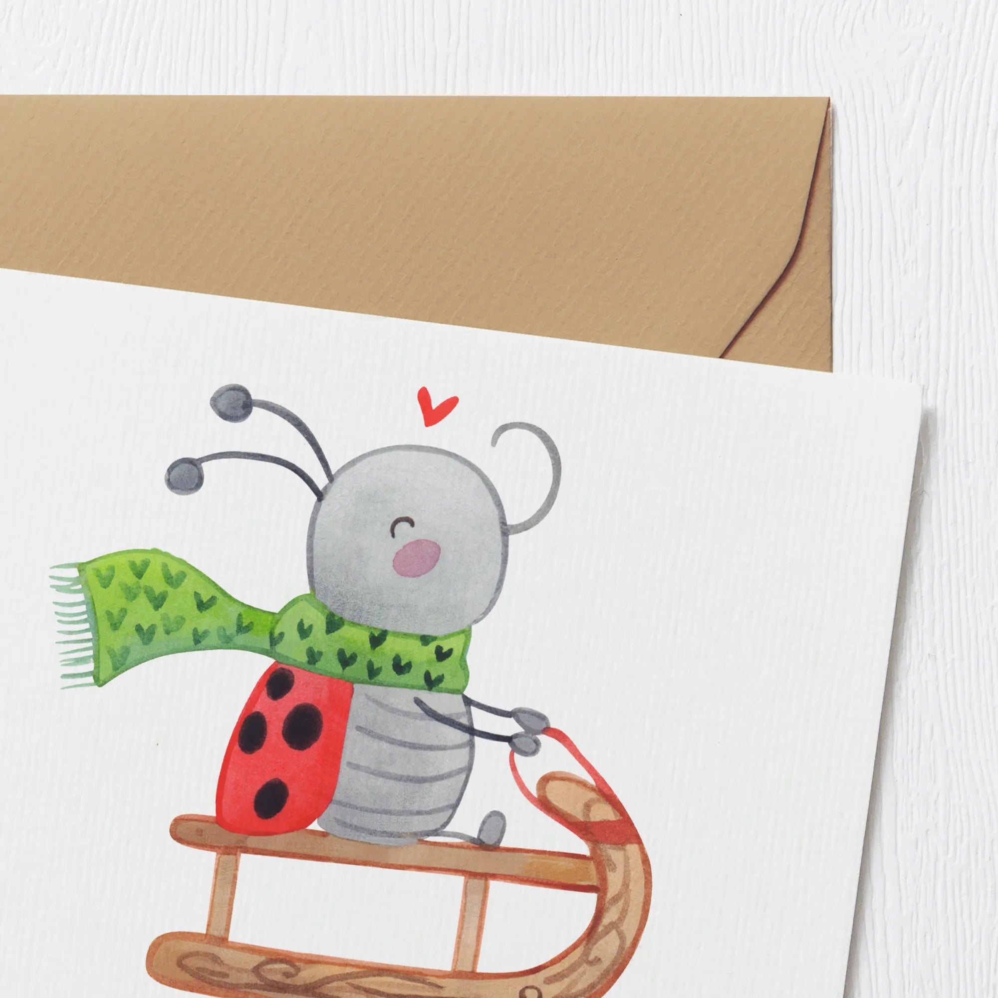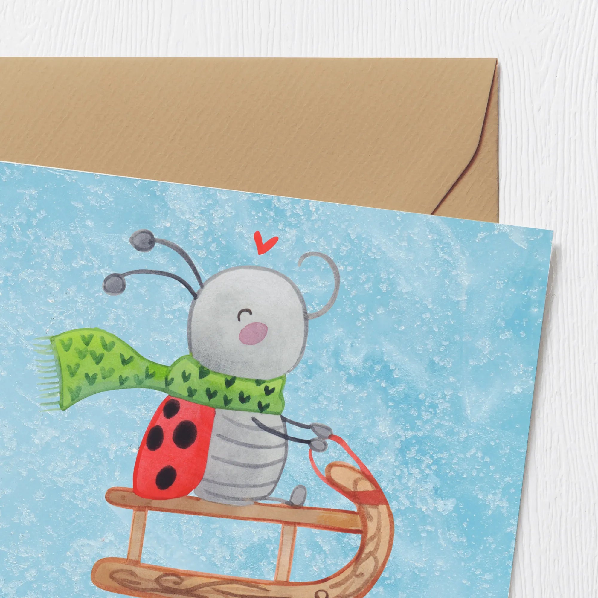 Mit einem zuckersüßen Marienkäfer, der auf einem Schlitten sitzt und fröhlich durch die verschneite Landschaft saust, zieht das Motiv sofort alle Blicke auf sich. Der kleine Smörle mit seinem grünen Schal strahlt pure Lebensfreude aus und lädt dich ein, die winterliche Freude zu genießen.