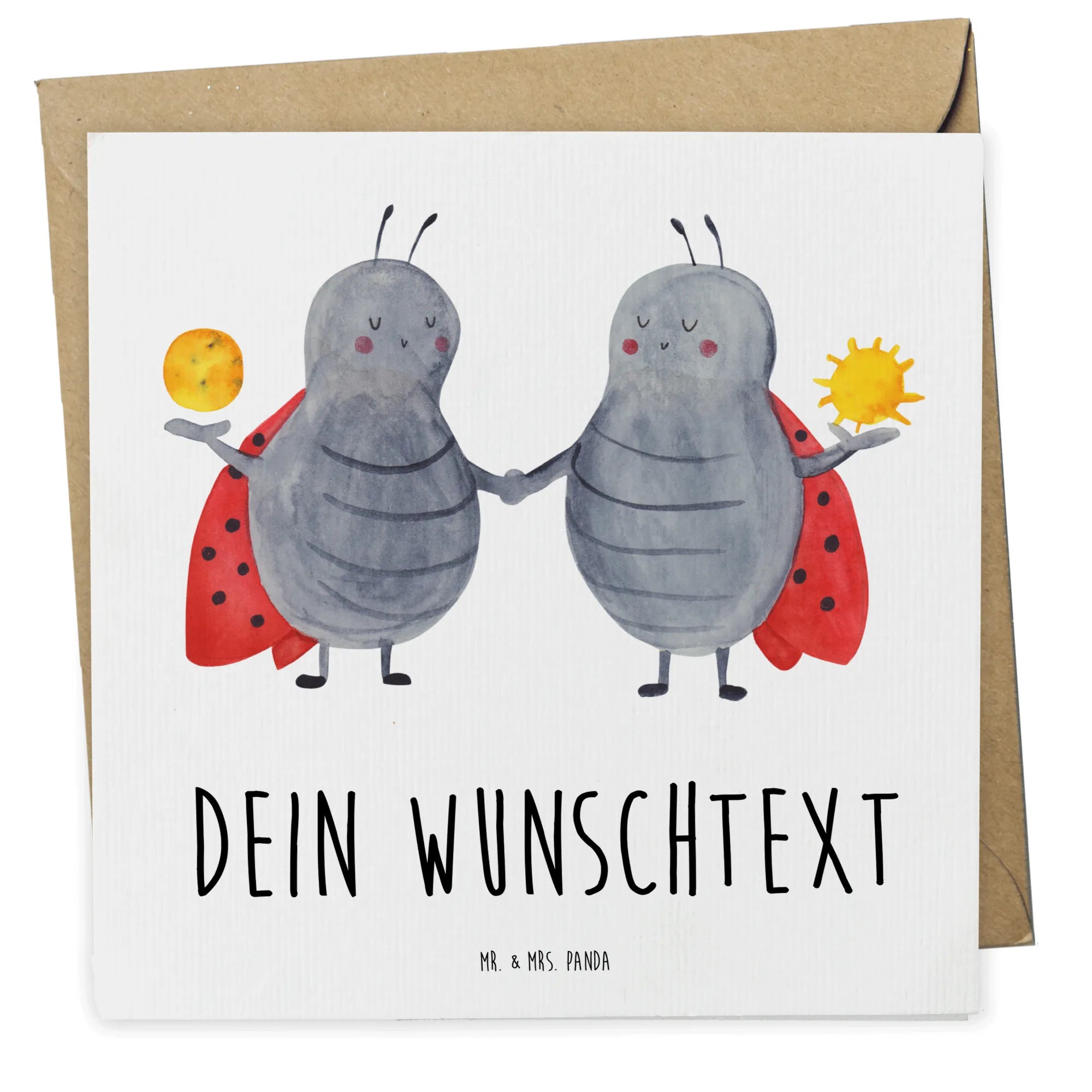 Die personalisierte Deluxe Karte mit dem Motiv Sternzeichen Zwilling von Mr. & Mrs. Panda ist das perfekte Geschenk für echte Zwillinge und ihre Liebsten. Mit dem liebevoll handgezeichneten Design von zwei süßen Marienkäfern und dem charmanten Slogan "Aufgeschlossen und begeistert wie ein Zwilling" zaubert sie sofort ein Lächeln ins Gesicht.