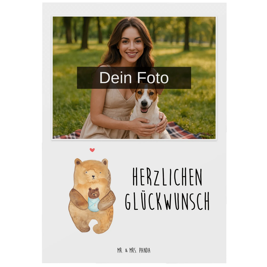 Die zarten und niedlichen Motive von Mr. & Mrs. Panda, unter anderem ein süßer Bär, der seinen kleinen Bären in der Hand hält, verleihen der Karte einen ganz besonderen Charme. Sie lässt sich mit Deinem persönlichen Foto und einem Wunschtext individuell gestalten, weshalb sie sich hervorragend für liebevolle Botschaften an Eltern, Großeltern oder als Glückwunsch an Nichten und Neffen eignet.