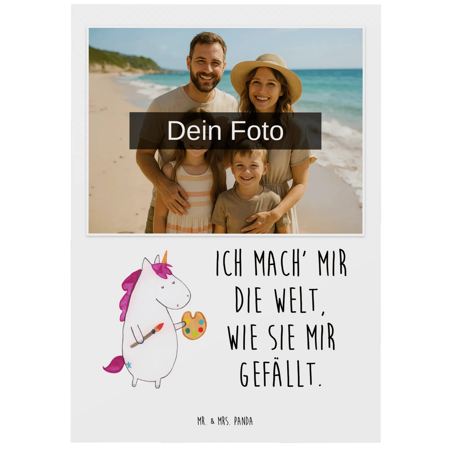 Die personalisierte Foto Postkarte "Einhorn Künstler" von Mr. & Mrs. Panda ist das perfekte Geschenk für kreative Köpfe und Einhornliebhaber! Mit einem bezaubernden Einhorn, das an einer Staffelei malt, wird diese Postkarte zur idealen Möglichkeit, seine persönliche Note einzubringen.
