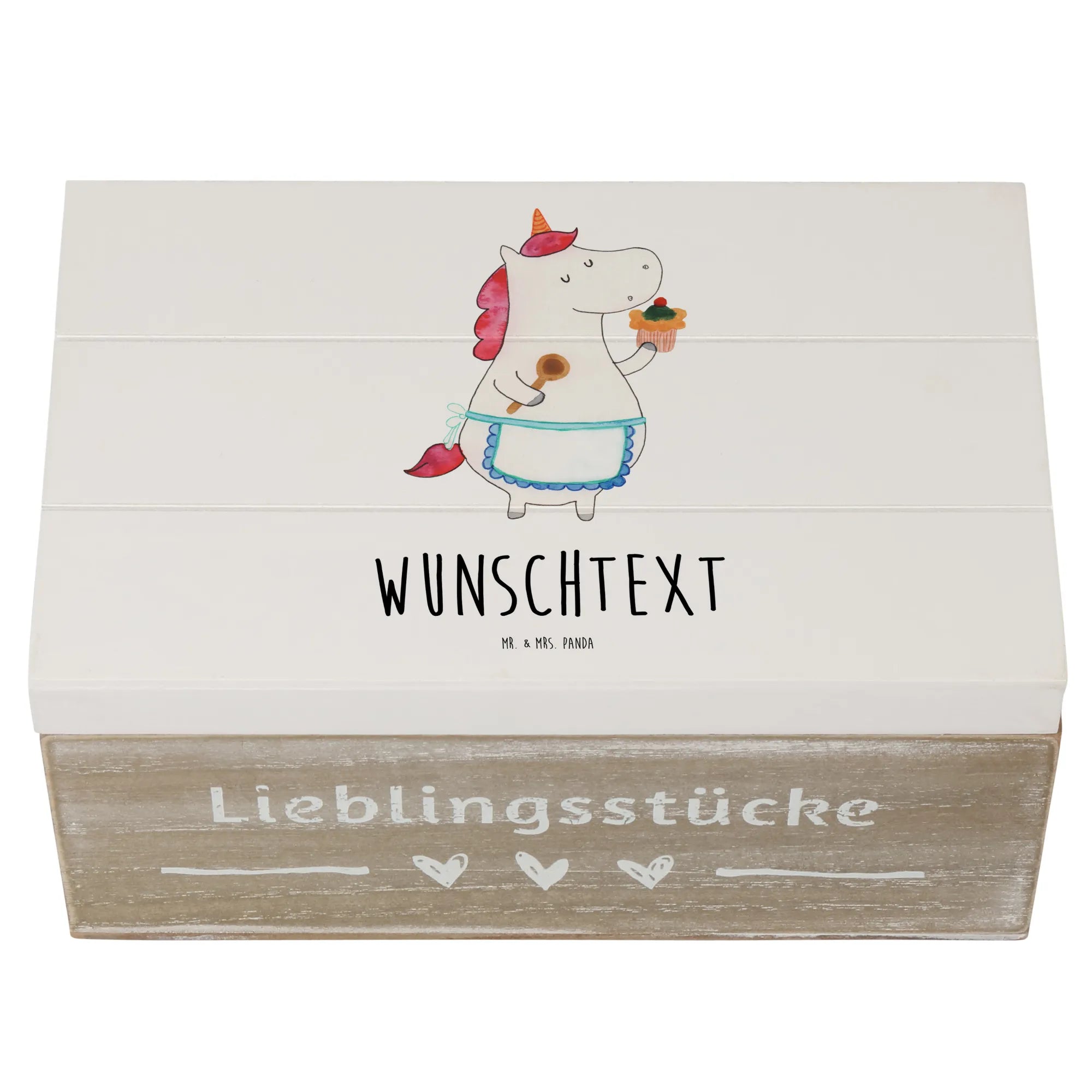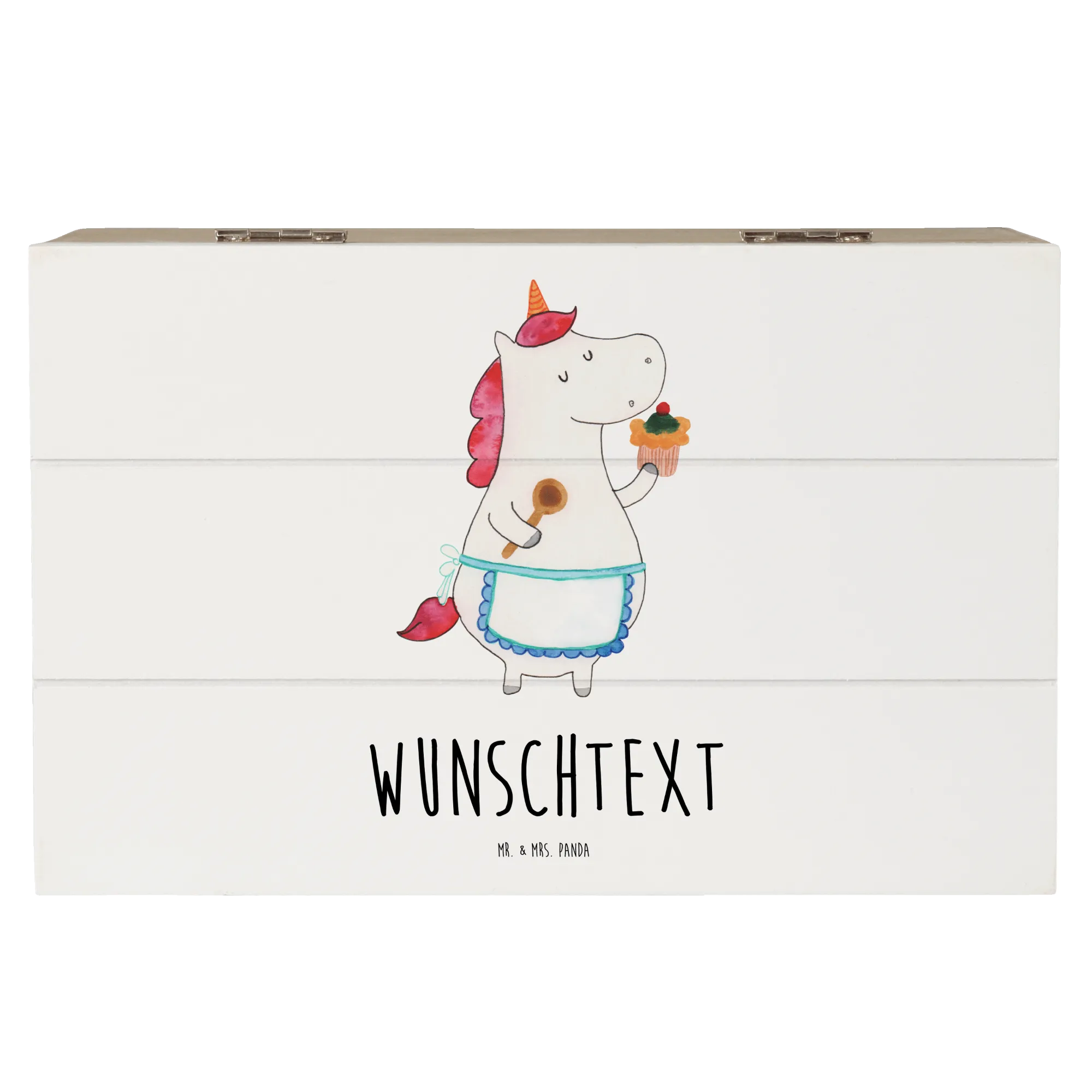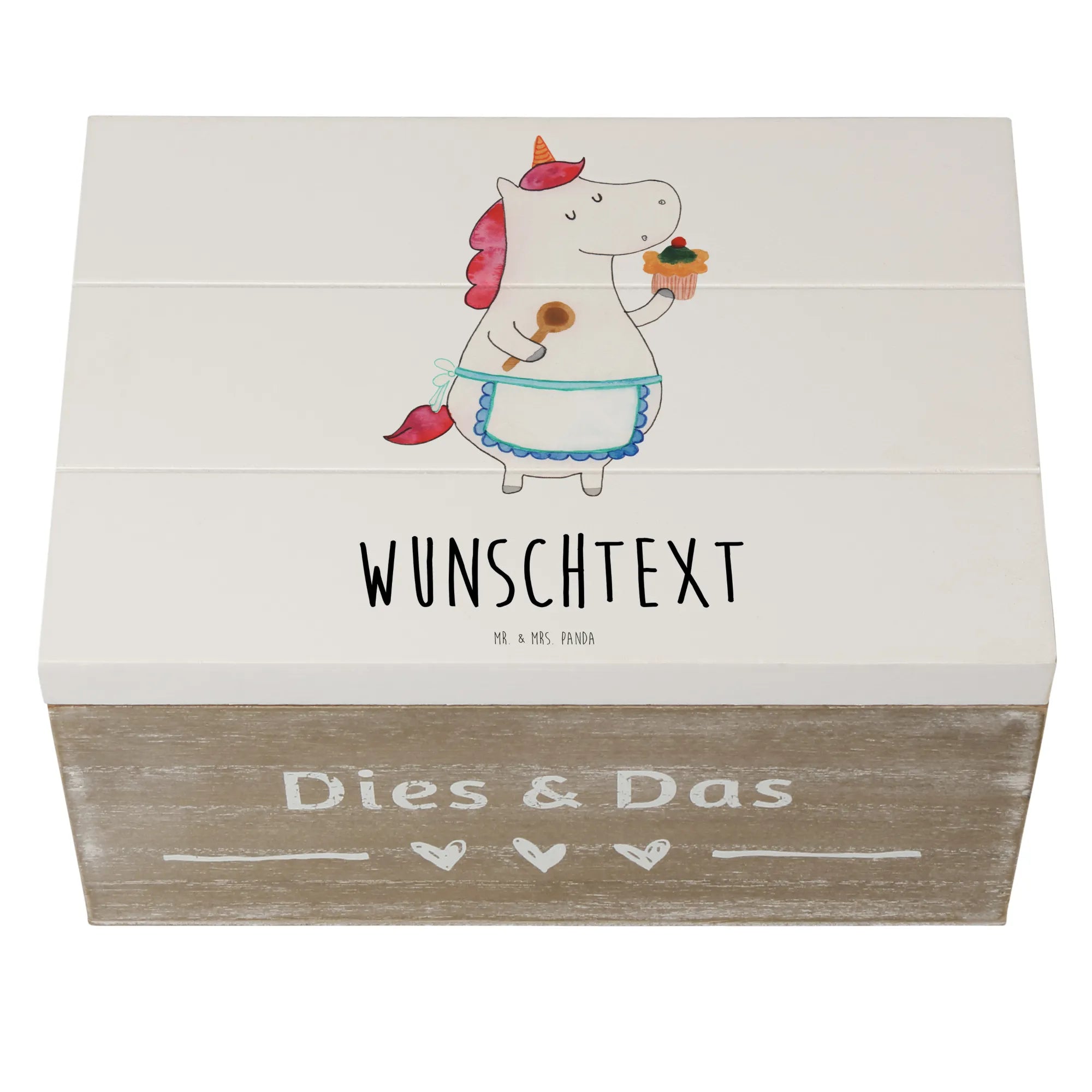 Die personalisierte Holzkiste "Einhorn Küchenfee" von Mr. & Mrs. Panda ist der perfekte Aufbewahrungsort für all deine wertvollen Schätze. Egal, ob du Erinnerungen aus der Kindheit, Fotos von besonderen Anlässen oder einfach nur deine Lieblingsrezepte aufbewahren möchtest, diese Kiste ist ein wahrer Alleskönner! Mit einem zarten Einhorn-Motiv, das von Hand gezeichnet wurde, und dem liebevollen Slogan "Cupcakes sind Muffins, die an Wunder glaubten", bringt unsere Kiste ein bisschen Magie in jeden Raum.