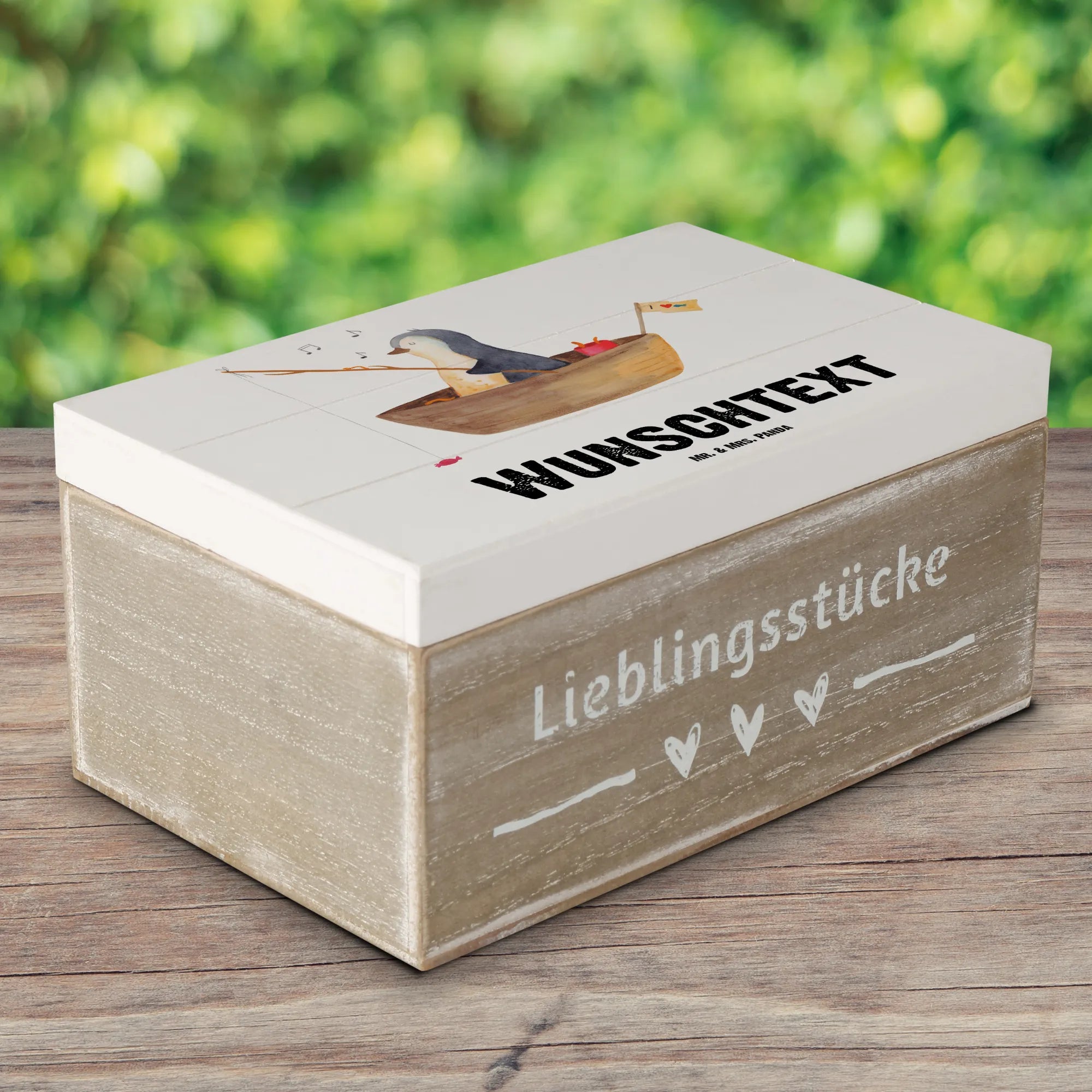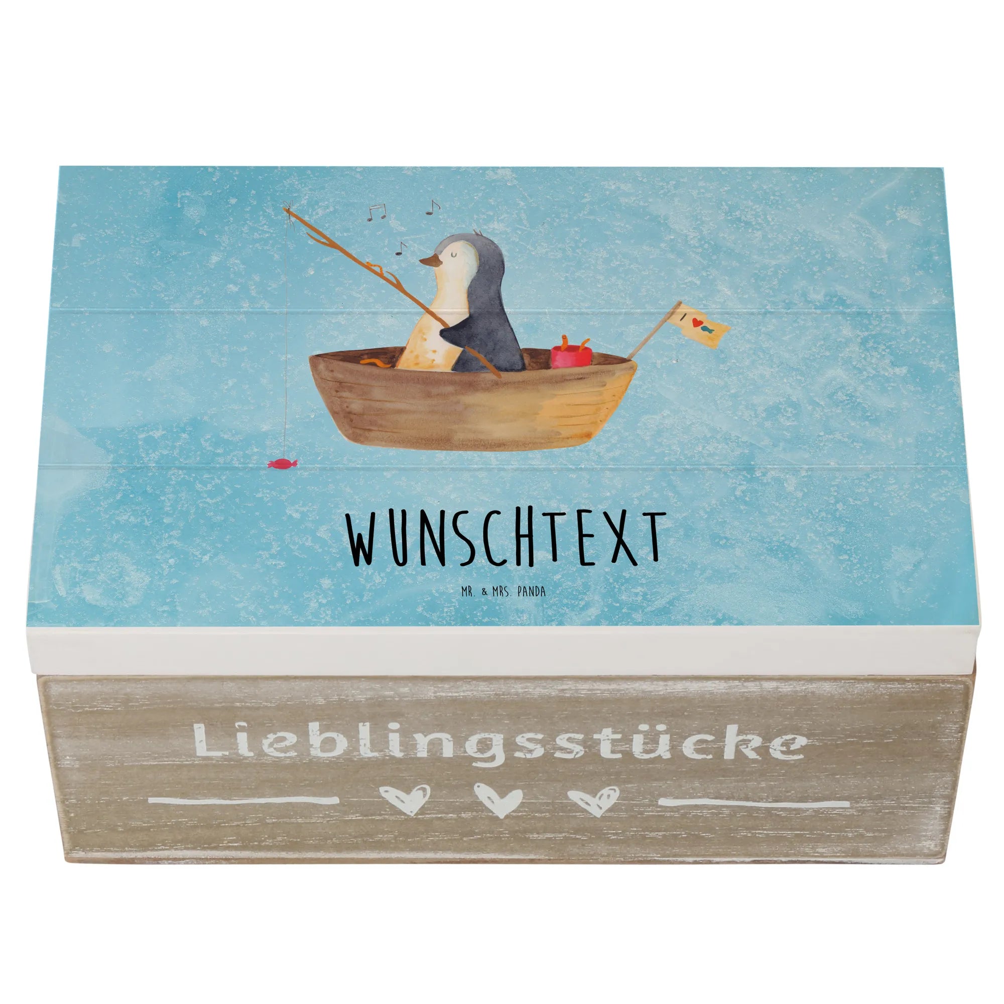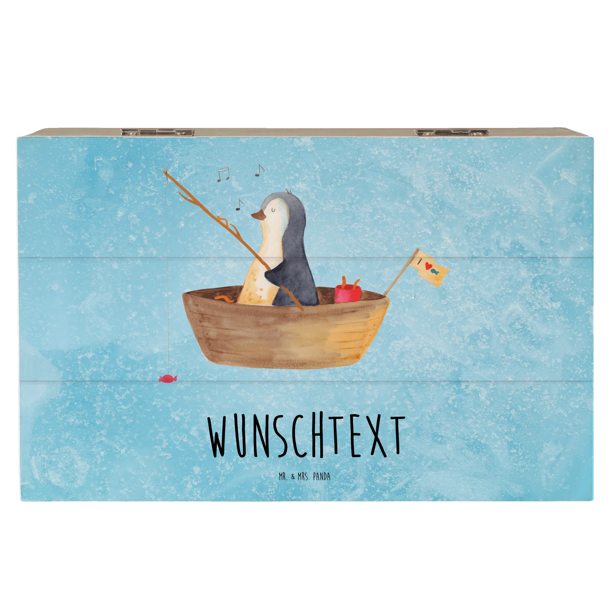Personalizowane drewniane pudełko pingwin łódka wędkarska - 25 x 18 cm - lodowoniebieski