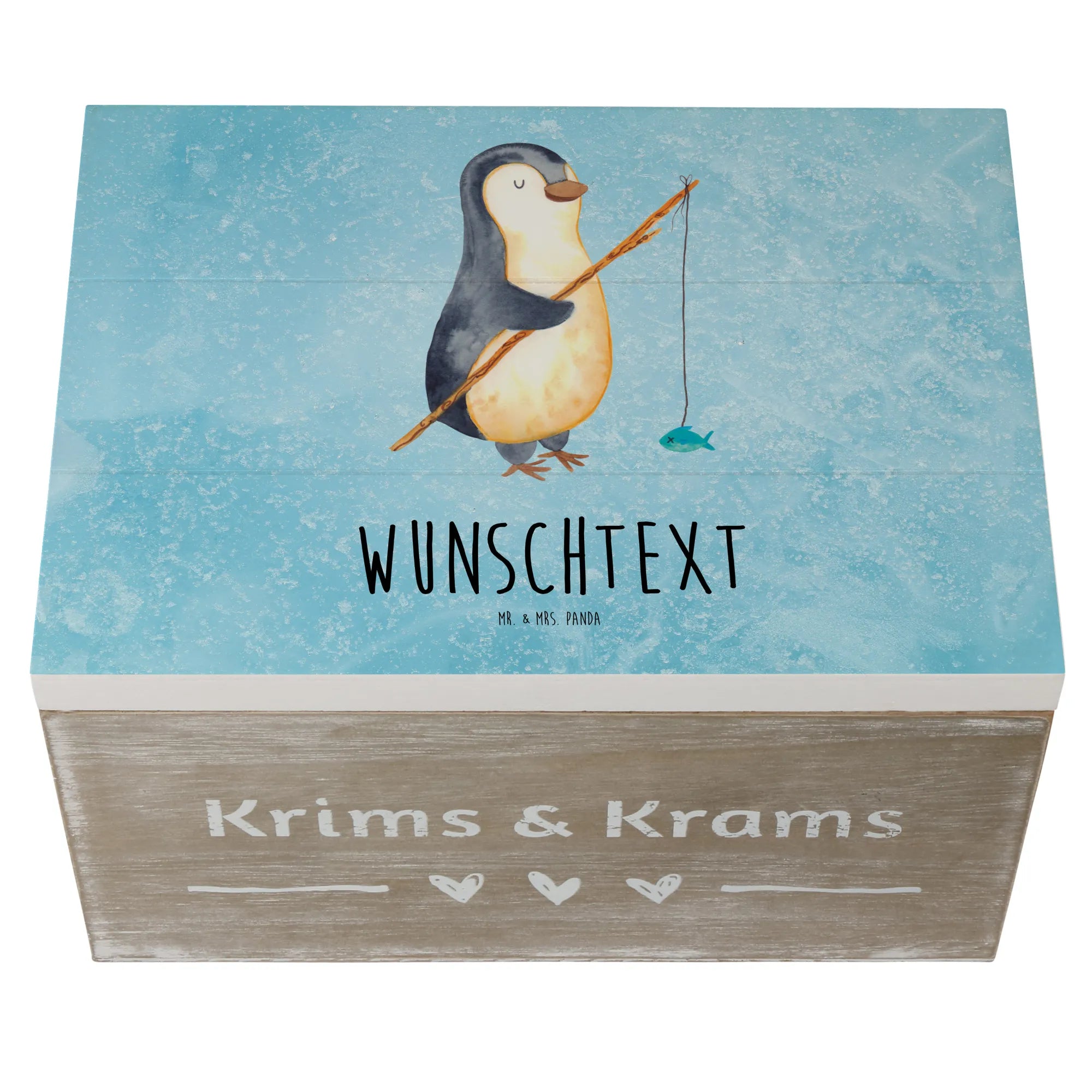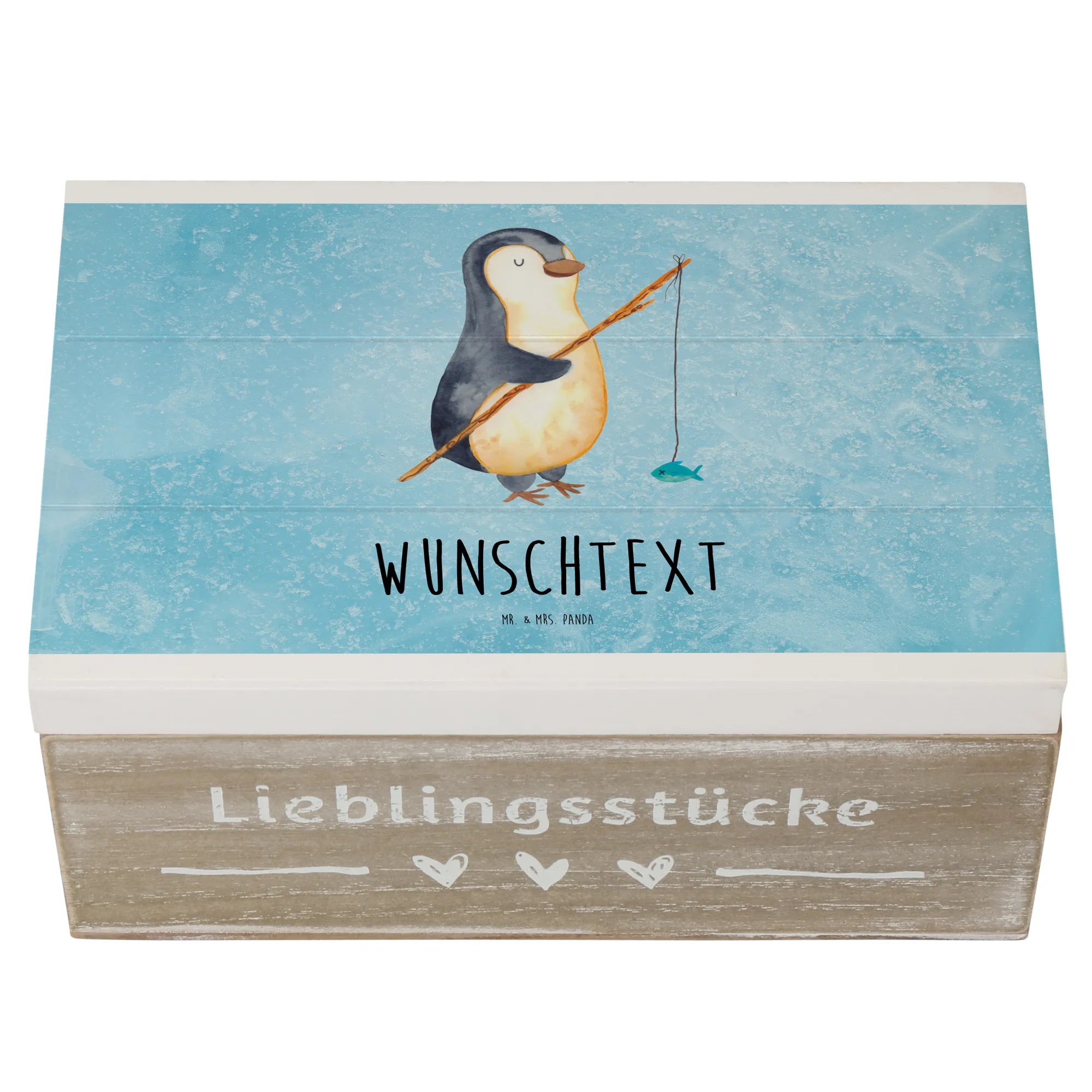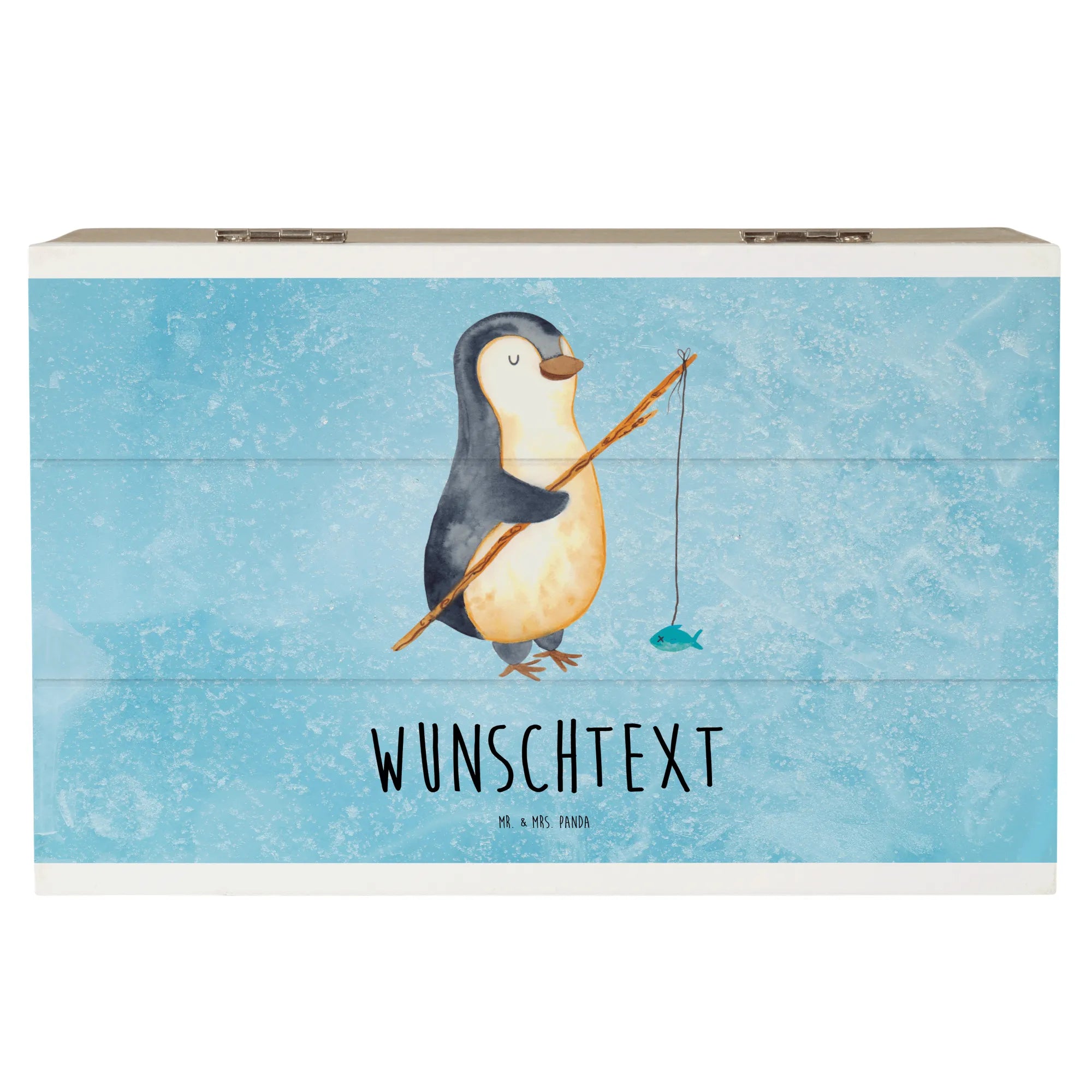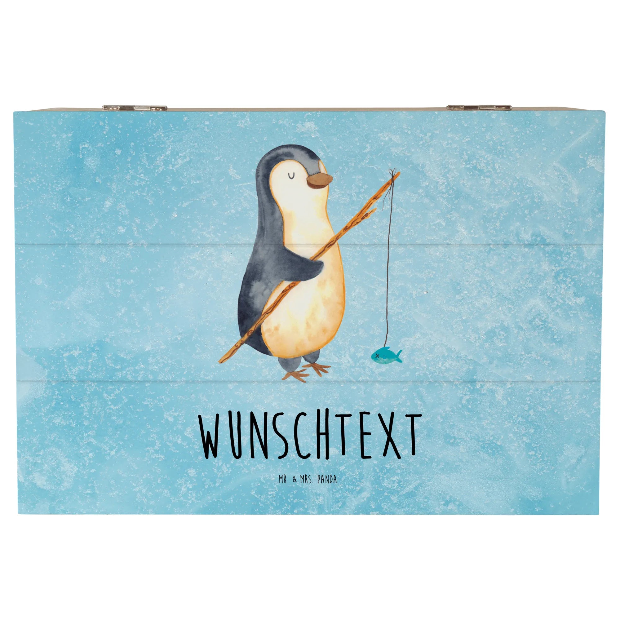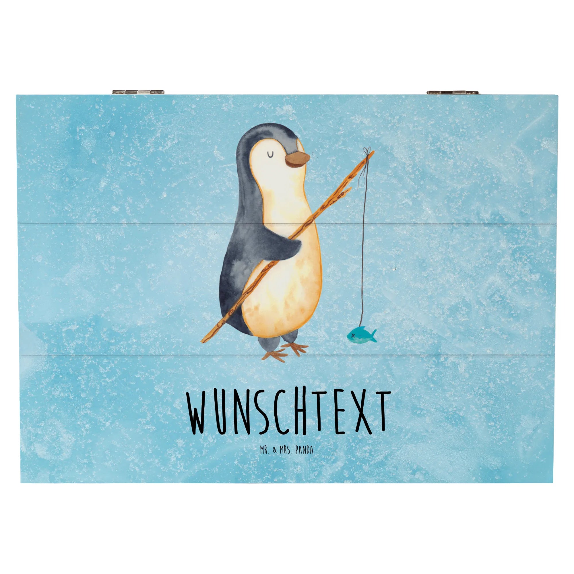 Personalizowane drewniane pudełko Pingwin Wędkarz - 25 x 18 cm - lodowoniebieski