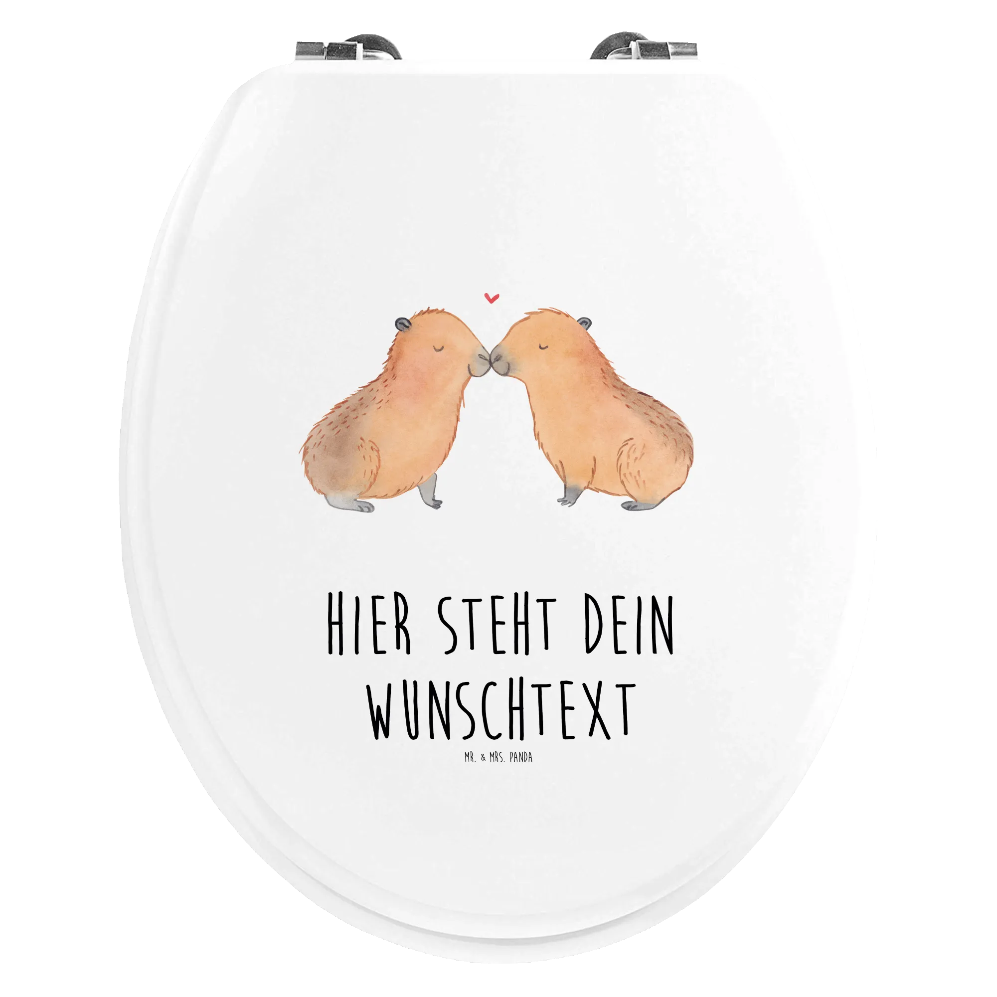 Du suchst nach dem perfekten Geschenk für deinen Partner? Dann ist der personalisierte WC Sitz mit dem süßen Motiv "Capybara Liebe" von Mr. & Mrs. Panda genau das richtige Geschenk für dich! Dieses handgezeichnete Kunstwerk zeigt ein verliebtes Capybara-Paar, das sich zärtlich an der Nase berührt. Über ihnen schwebt ein kleines rotes Herz, das ihre große Zuneigung symbolisiert. Der Toilettendeckel ist nicht nur ein echter Hingucker, sondern bringt auch viel Freude und Romantik in dein Badezimmer. So wird das alltägliche Ritual des Toilettengangs ein wenig bunter und glücklicher!