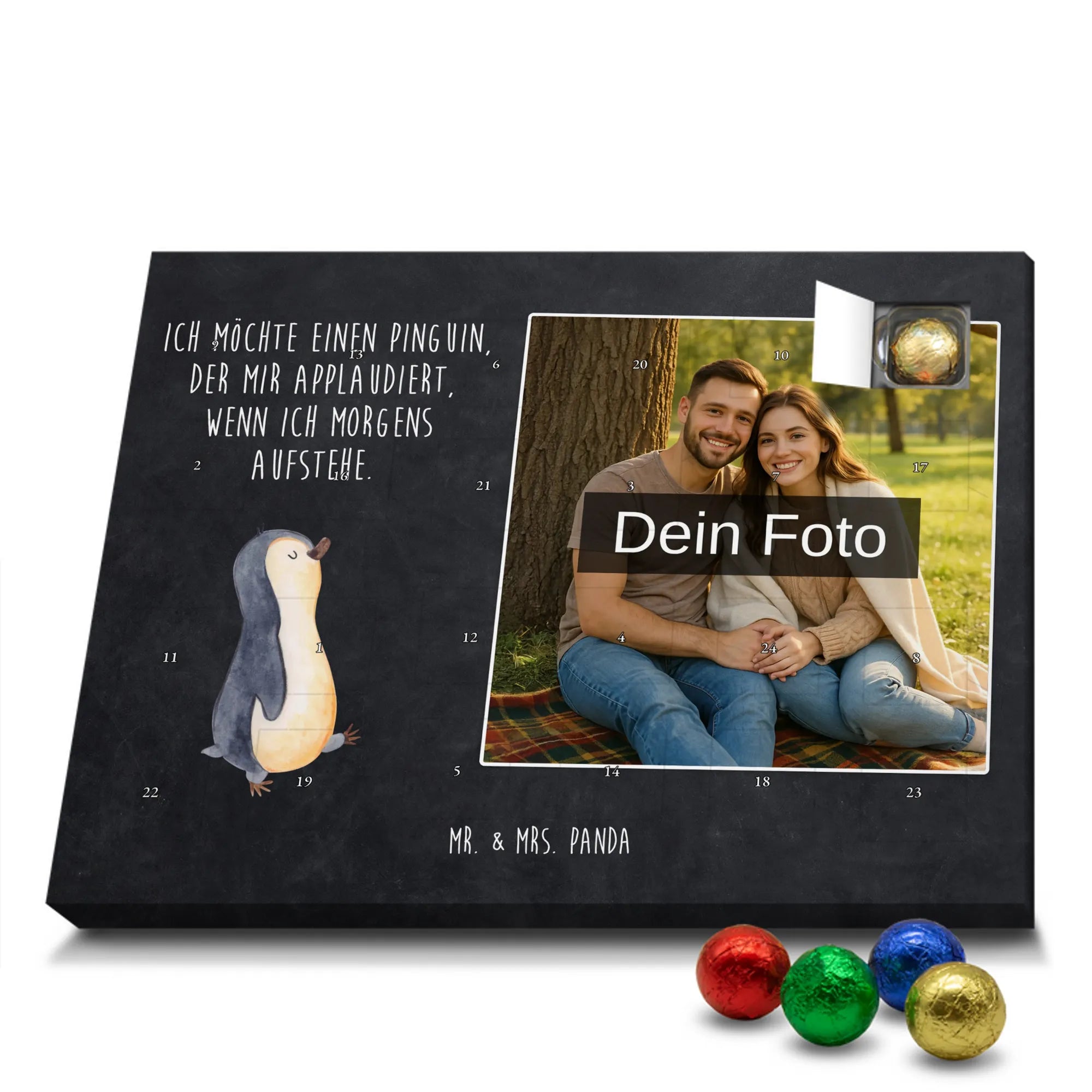Personalisierter Schoko Foto Adventskalender „Pinguin marschierend“ – von Mr. & Mrs. Panda, liebevoll gestaltet für zauberhafte Dezember-Momente. Dieser Adventskalender kombiniert dein persönliches Foto mit dem fröhlichen Pinguin-Motiv unserer Pinguin - Kollektion. Der kleine marschierende Pinguin wirkt verspielt und ein wenig tollpatschig – ein garantierter Blickfang auf deinem Frühstückstisch oder als Geschenk unter dem Baum. 😊