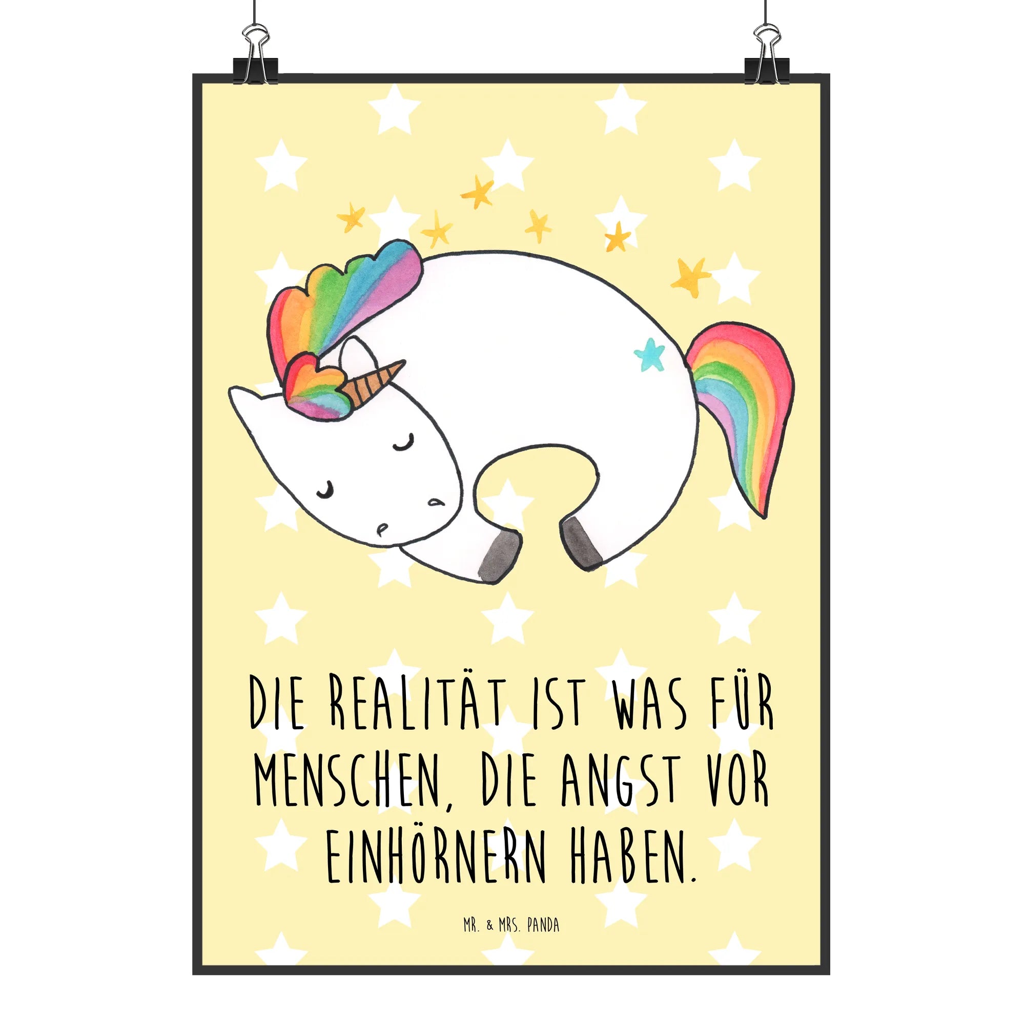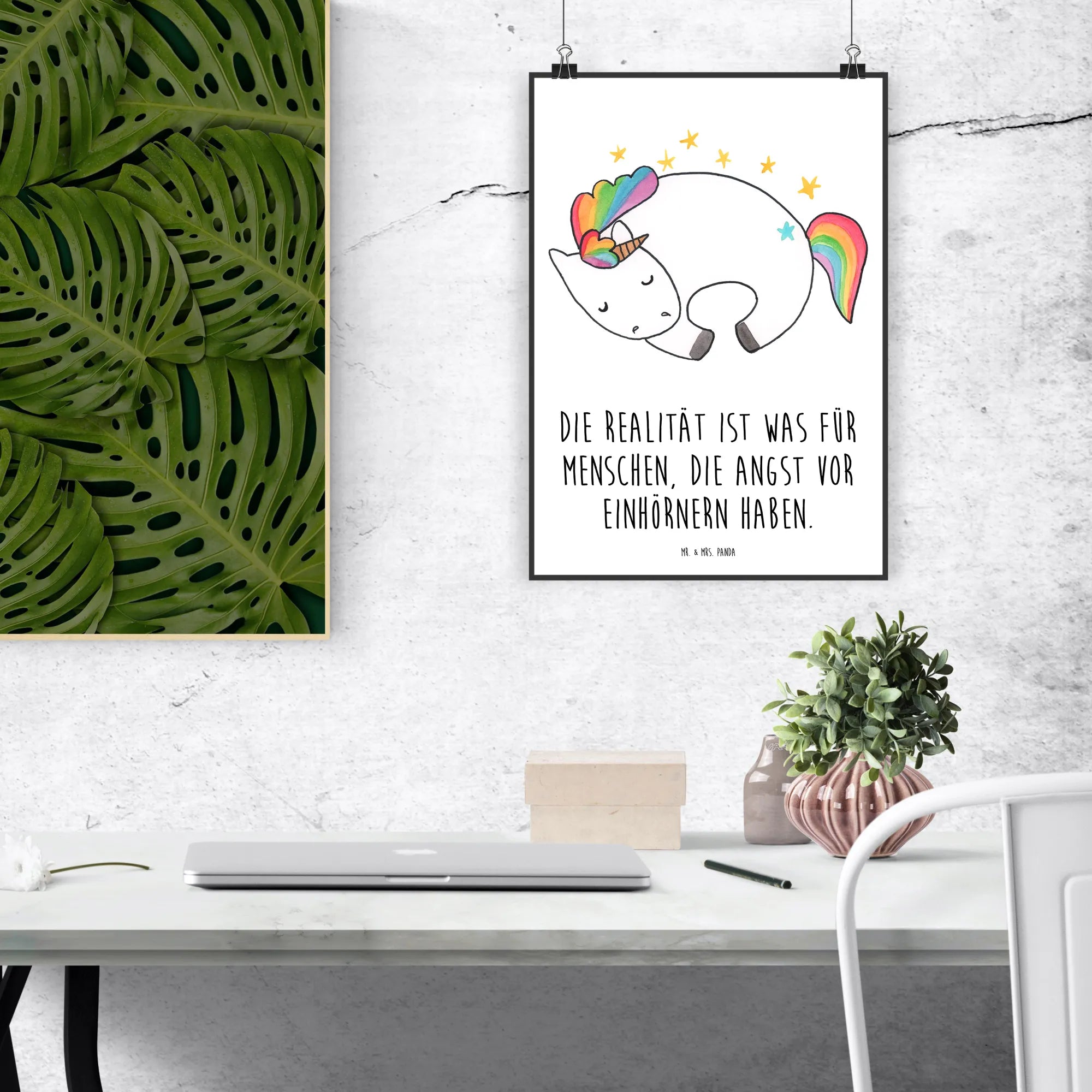 Träum dich fort mit unserem liebevoll gestalteten Einhorn Poster! Das schlafende Einhorn vor sanftem Pastellgelb und der witzige Spruch „Die Realität ist was für Menschen, die Angst vor Einhörnern haben.“ zaubern sofort ein Lächeln an jede Wand. Pssst... nicht so laut, sonst weckt ihr mein Einhorn!