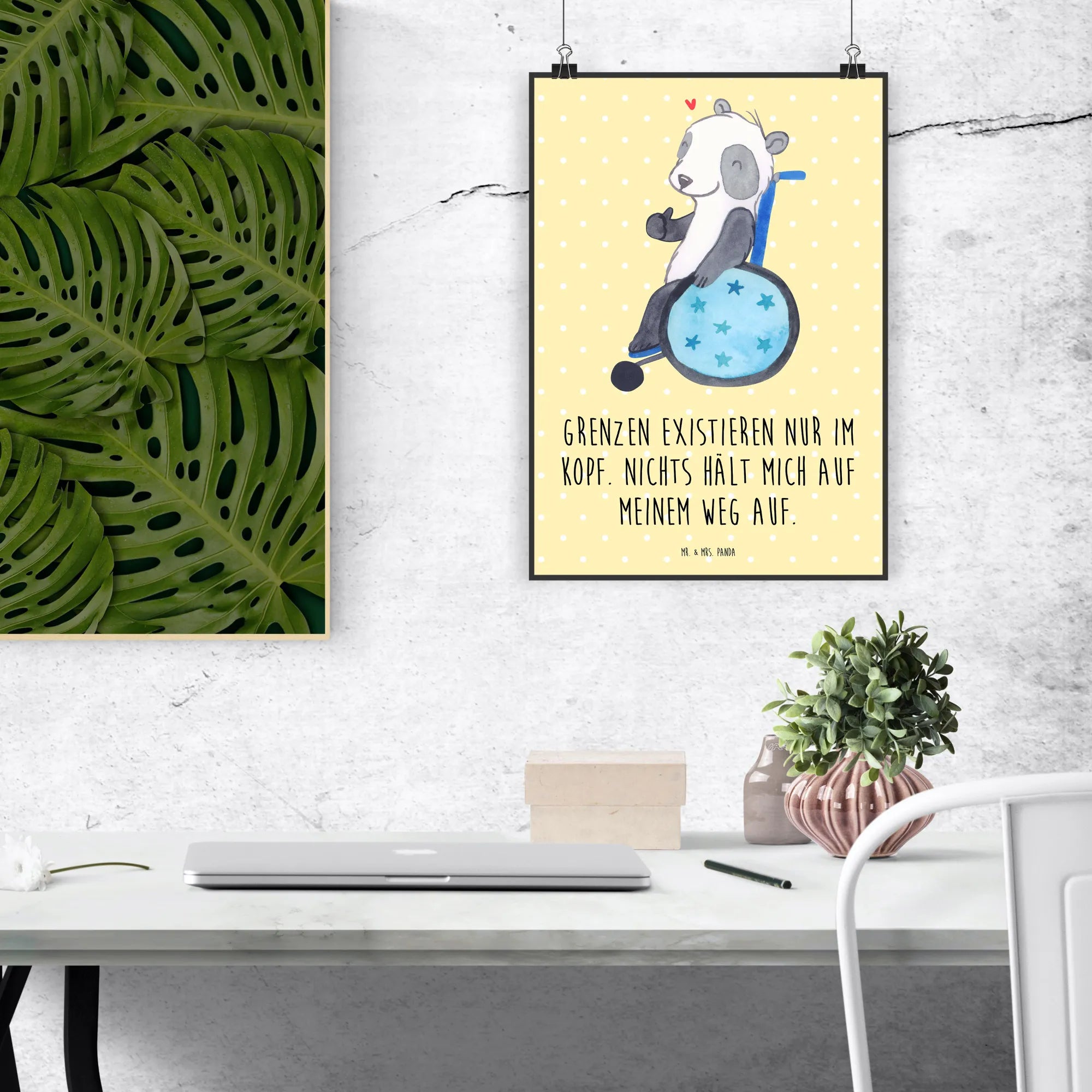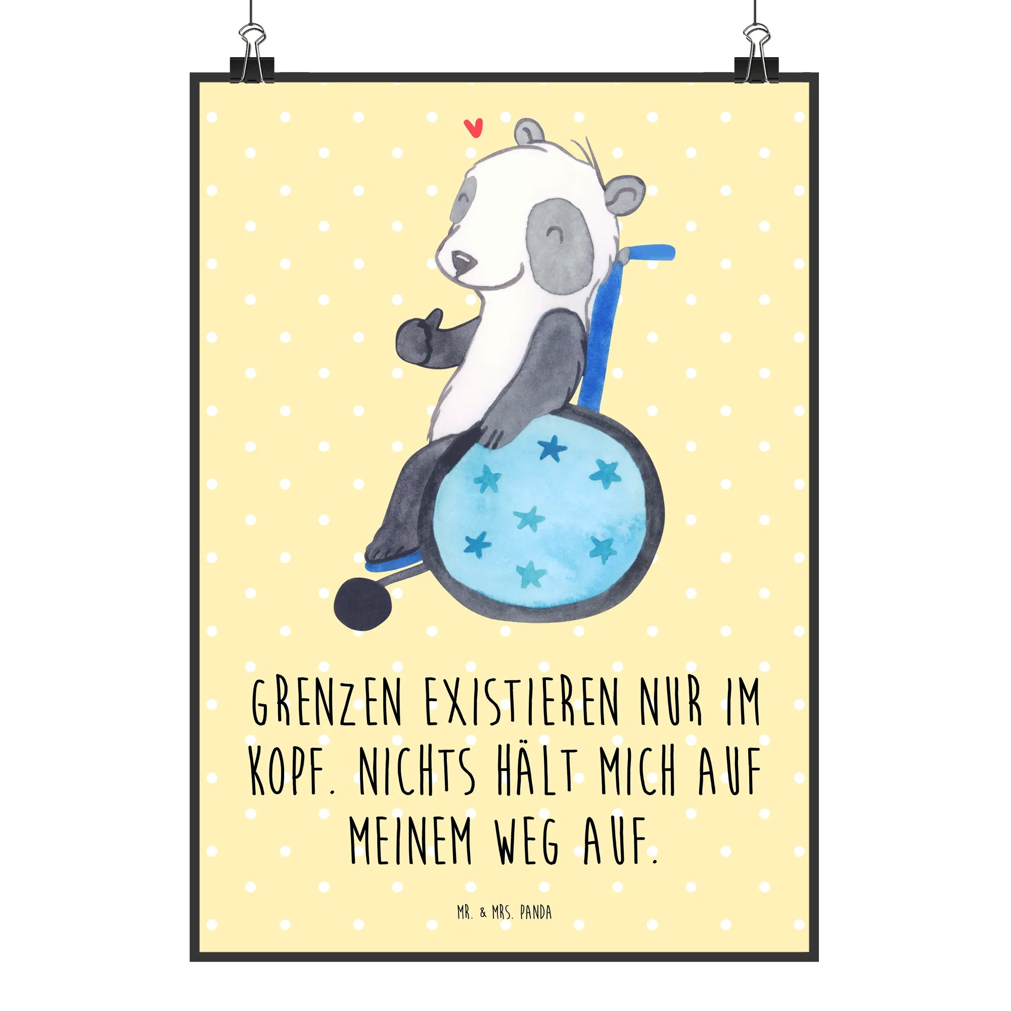 Entdecke das zauberhafte Mr. & Mrs. Panda Poster mit dem Motiv "Panda im Rollstuhl" aus unserer besonderen Kollektion "Tiere mit Superkräften". Dieses handgemalte Poster ist nicht nur ein Blickfang für jedes Kinderzimmer, sondern auch eine liebevolle Hommage an Menschen, die ihren Alltag mit einem Handicap meistern. Mit dem Slogan "Grenzen existieren nur im Kopf. Nichts hält mich auf meinem Weg auf." vermittelt es eine Botschaft der Stärke und Zuversicht.