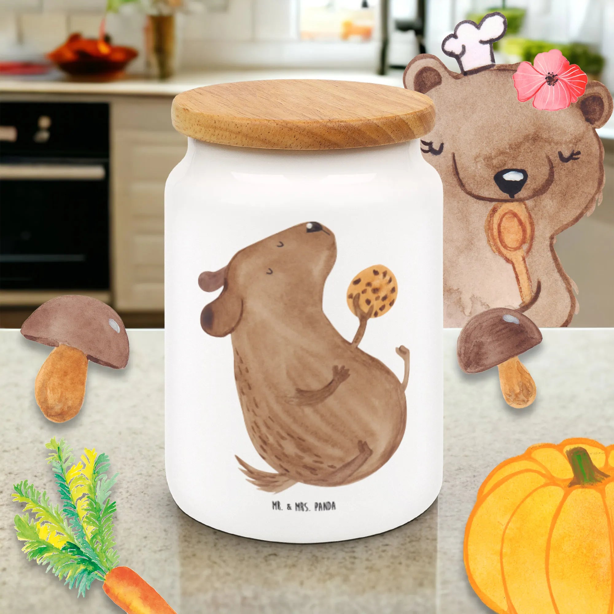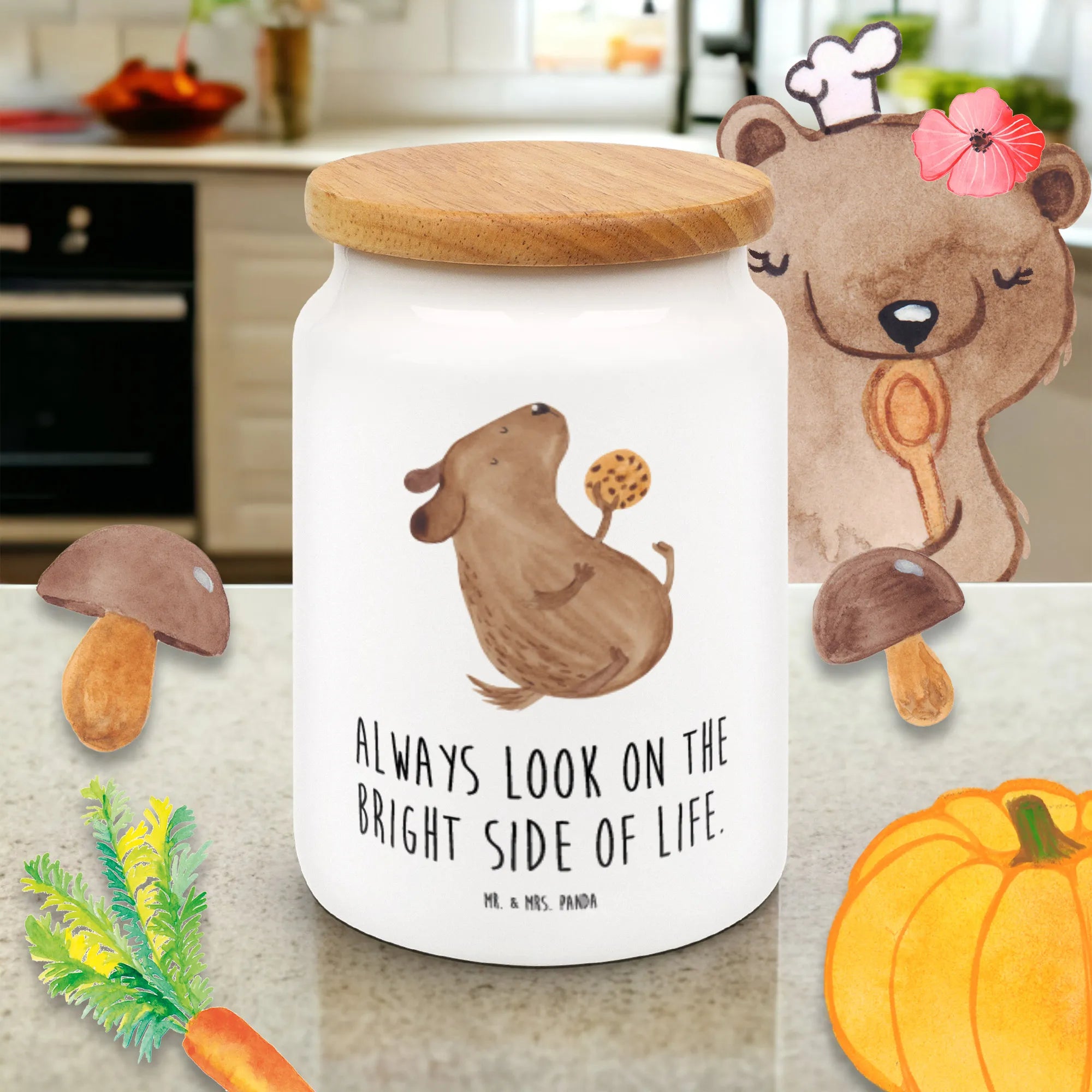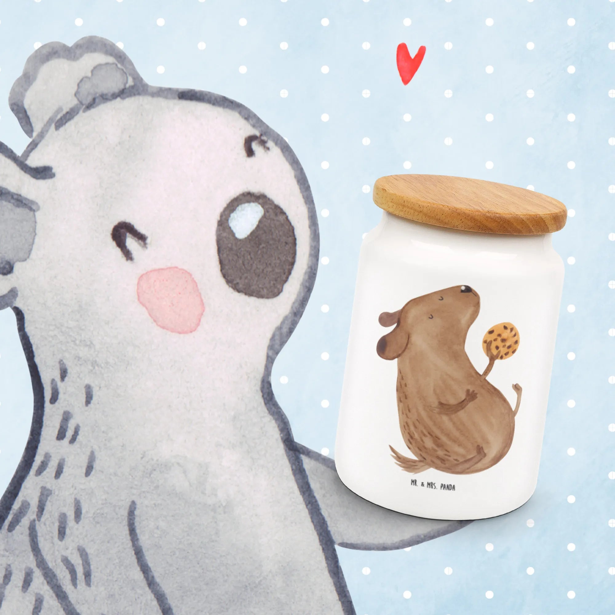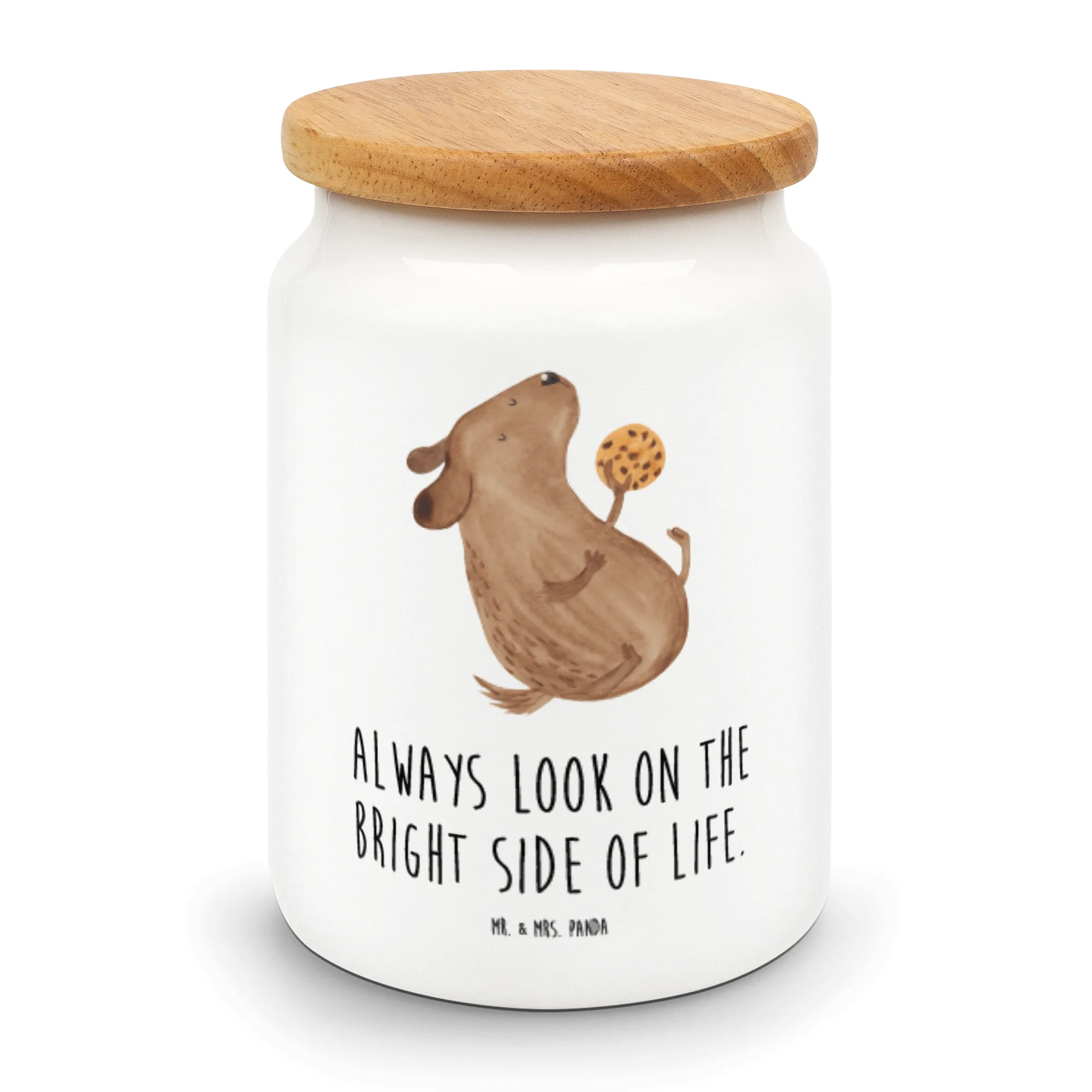 Wenn du auf der Suche nach einem perfekten Geschenk für einen Hundebesitzer bist, dann ist die liebevoll bedruckte Vorratsdose aus der Hunde Kollektion von Mr. & Mrs. Panda genau das Richtige! Diese Keksdose, die mit einem niedlichen Hundemotiv verziert ist, bringt Freude und Stil in jede Küche. Das charmante Motiv zeigt einen süßen Hund, der begeistert einen Keks isst und ist somit nicht nur praktisch, sondern auch ein echter Hingucker.