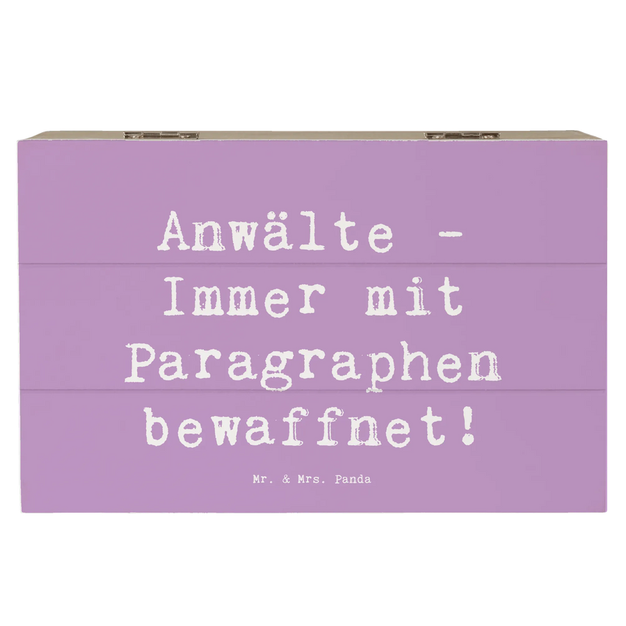 Die wunderschöne Holzkiste von Mr. & Mrs. Panda mit dem Motiv Anwalt - „Anwälte - Immer mit Paragraphen bewaffnet!“ ist das perfekte Geschenk für alle Juristen und Rechtsanwälte. Diese liebevoll gestaltete Erinnerungskiste bietet nicht nur einen stilvollen Aufbewahrungsort für persönliche Schätze, sondern ist auch ein ideales Geschenk für Anlässe wie Berufsabschiede oder Jubiläen.