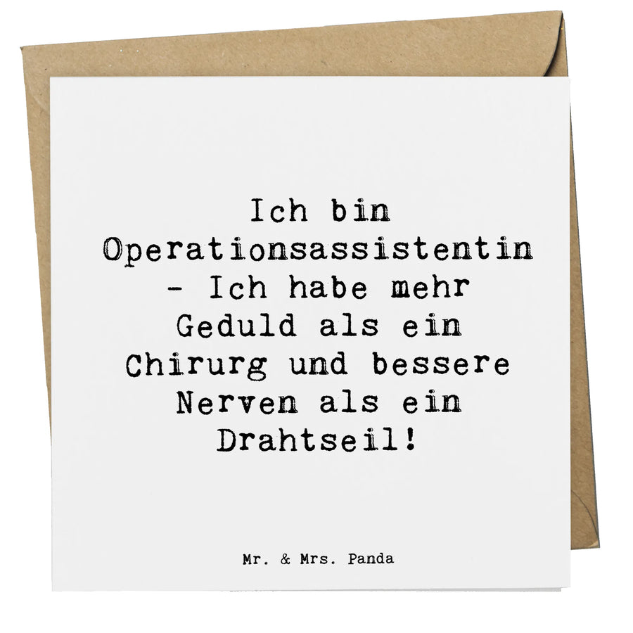 Diese wunderschöne und besonders hochwertige quadratische Karte von Mr. & Mrs. Panda, im Format 140 mm x 140 mm, verzaubert mit ihrem charmanten Design und dem Spruch: "Ich bin Operationsassistentin - Ich habe mehr Geduld als ein Chirurg und bessere Nerven als ein Drahtseil!" Die Karte ist aus hochwertigem 300 Gramm Karton gefertigt und hat eine hochglänzend veredelte Vorderseite, die sie besonders edel erscheinen lässt.