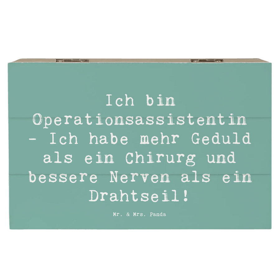 Bist du auf der Suche nach dem perfekten Geschenk für einen Operationsassistenten? Unsere wunderschöne Holzkiste von Mr. & Mrs. Panda ist nicht nur ein praktischer Aufbewahrungsort, sondern auch eine liebevolle Erinnerungskiste, die das Herz höher schlagen lässt! Diese Schatzkiste präsentiert das liebevoll handgezeichnete Motiv "Operationsassistentin" mit dem witzigen Slogan: "Ich bin Operationsassistentin - Ich habe mehr Geduld als ein Chirurg und bessere Nerven als ein Drahtseil!". Ob zur bestandenen Prüfung, zum Hochzeitstag oder einfach als nette Geste zwischendurch – diese Kiste ist ideal, um besondere Erinnerungen sicher aufzubewahren.