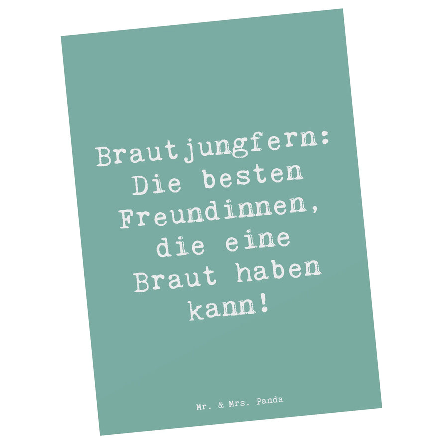Wer könnte der besten Freundin zur Hochzeit etwas Schöneres schenken als eine charmante Grußkarte? Mr. & Mrs. Panda haben dafür etwas ganz Besonderes in ihrer Hochzeitskollektion! Unsere Postkarte mit dem Spruch 'Brautjungfern: Die besten Freundinnen, die eine Braut haben kann!' ist die perfekte Geste für deine treuesten Begleiterinnen.