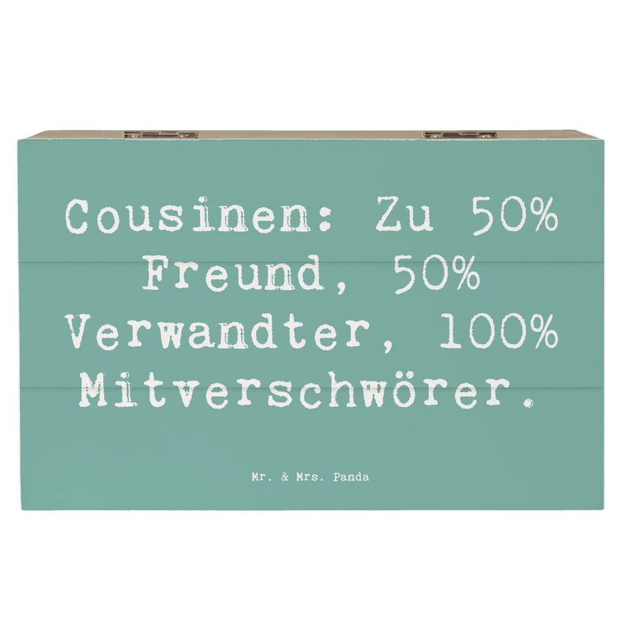 Entdecke die wunderbare Holzkiste für Deinen Cousin oder Deine Cousine von Mr. & Mrs. Panda! Diese wunderschöne Kiste ist nicht nur ein praktischer Aufbewahrungsort für die kleinen Schätze, die uns im Leben begleiten, sondern sie bringt auch die besondere Verbindung zu Deiner Familie zum Ausdruck. Mit einem liebevollen Spruch bedruckt – "Cousinen: Zu 50% Freund, 50% Verwandter, 100% Mitverschwörer." – ist diese Kiste ein persönliches Geschenk für jeden Anlass. Egal, ob Du sie zum Geburtstag, zu Weihnachten oder einfach als kleine Aufmerksamkeit schenkst, sie sagt mehr als tausend Worte.