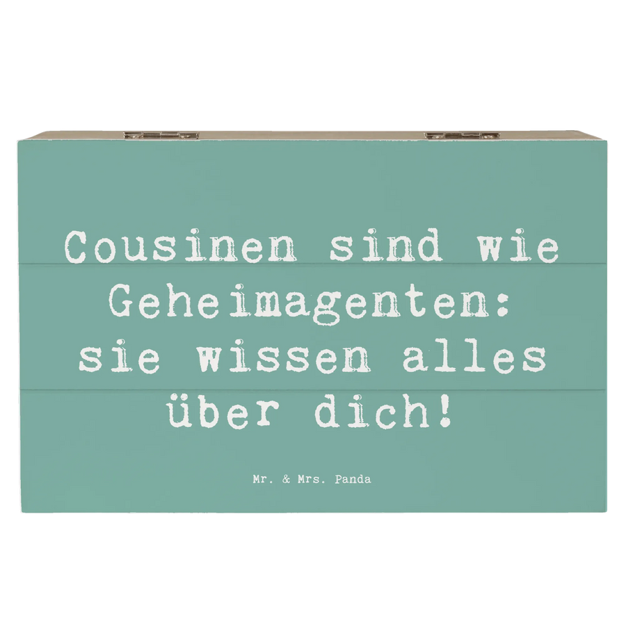 Die Holzkiste von Mr. & Mrs. Panda mit dem Spruch "Cousinen sind wie Geheimagenten: sie wissen alles über dich!" ist das perfekte Geschenk für deine Lieblingscousine oder deinen Lieblingscousin!