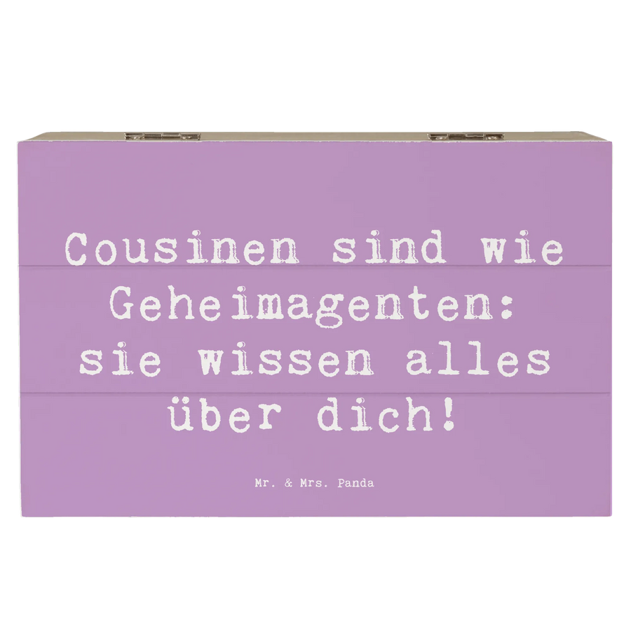 Die Holzkiste von Mr. & Mrs. Panda mit dem Spruch "Cousinen sind wie Geheimagenten: sie wissen alles über dich!" ist das perfekte Geschenk für deine Lieblingscousine oder deinen Lieblingscousin!