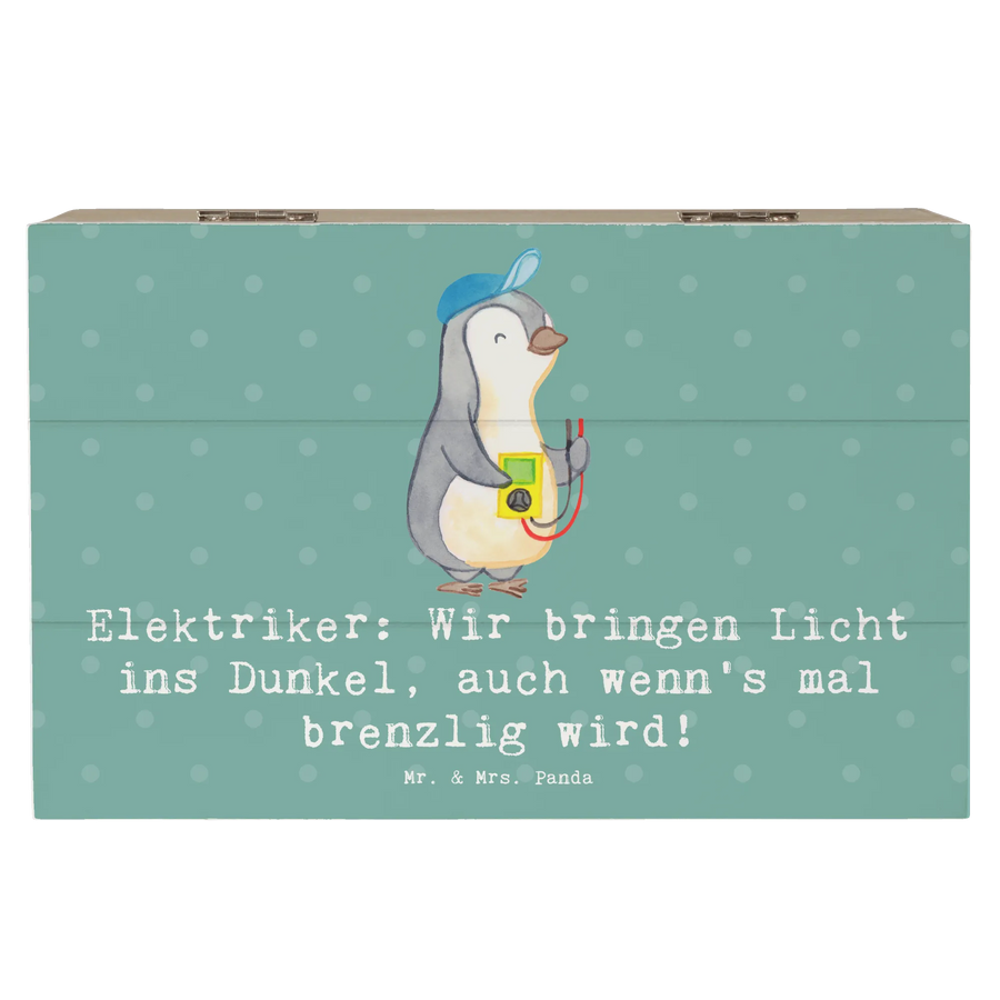 Die Holzkiste "Elektriker: Wir bringen Licht ins Dunkel, auch wenn's mal brenzlig wird!" von Mr. & Mrs. Panda ist der perfekte Begleiter für alle, die das Handwerk lieben und schätzen.