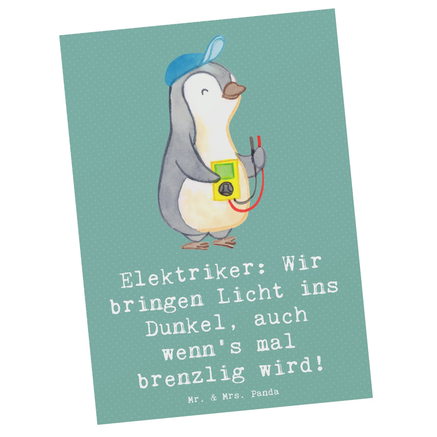 Die liebevoll gestaltete Postkarte "Elektriker: Wir bringen Licht ins Dunkel, auch wenn's mal brenzlig wird!" aus der Berufe Kollektion von Mr. & Mrs. Panda ist das perfekte Geschenk für all jene, die die Energie- und Elektrobranche repräsentieren.