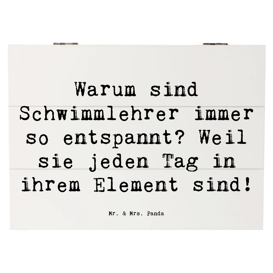 Die wunderschöne Holzkiste von Mr. & Mrs. Panda ist das perfekte Geschenk für Schwimmlehrer und alle, die das Element Wasser lieben! Mit einem liebevoll gestalteten Motiv und dem Spruch "Warum sind Schwimmlehrer immer so entspannt? Weil sie jeden Tag in ihrem Element sind!" bringst Du ein Stück Entspannung und Freude in jeden Raum.