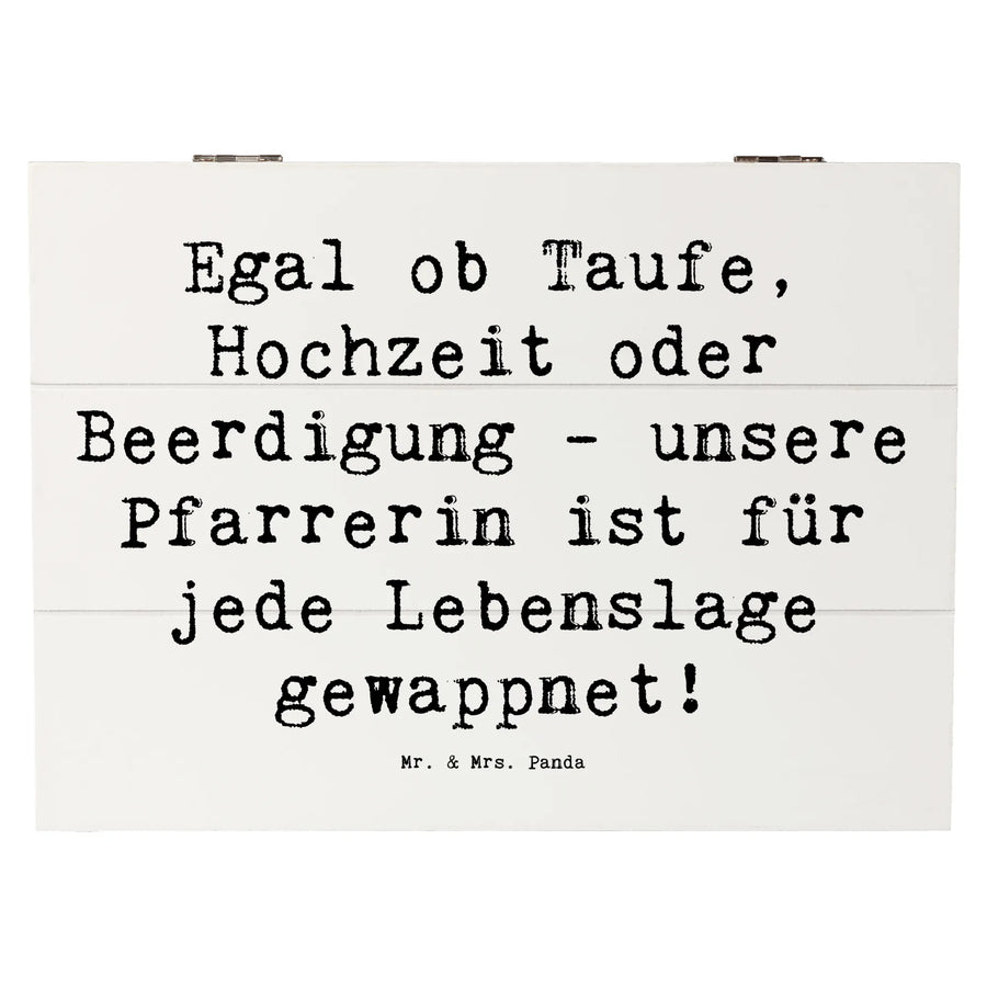Die wunderschöne Holzkiste von Mr. & Mrs. Panda ist mehr als nur eine Aufbewahrungsbox – sie ist ein Herzstück für besondere Erinnerungen. Diese einzigartige Kiste ist perfekt für alle, die einen besonderen Ort suchen, um ihre Schätze aufzubewahren. Mit dem liebevoll gestalteten Motiv der Pfarrerin, das mit dem Spruch "Egal ob Taufe, Hochzeit oder Beerdigung - unsere Pfarrerin ist für jede Lebenslage gewappnet!" verziert ist, spricht diese Kiste nicht nur Herz und Verstand an, sondern ist auch ein toller Blickfang für jeden Raum.