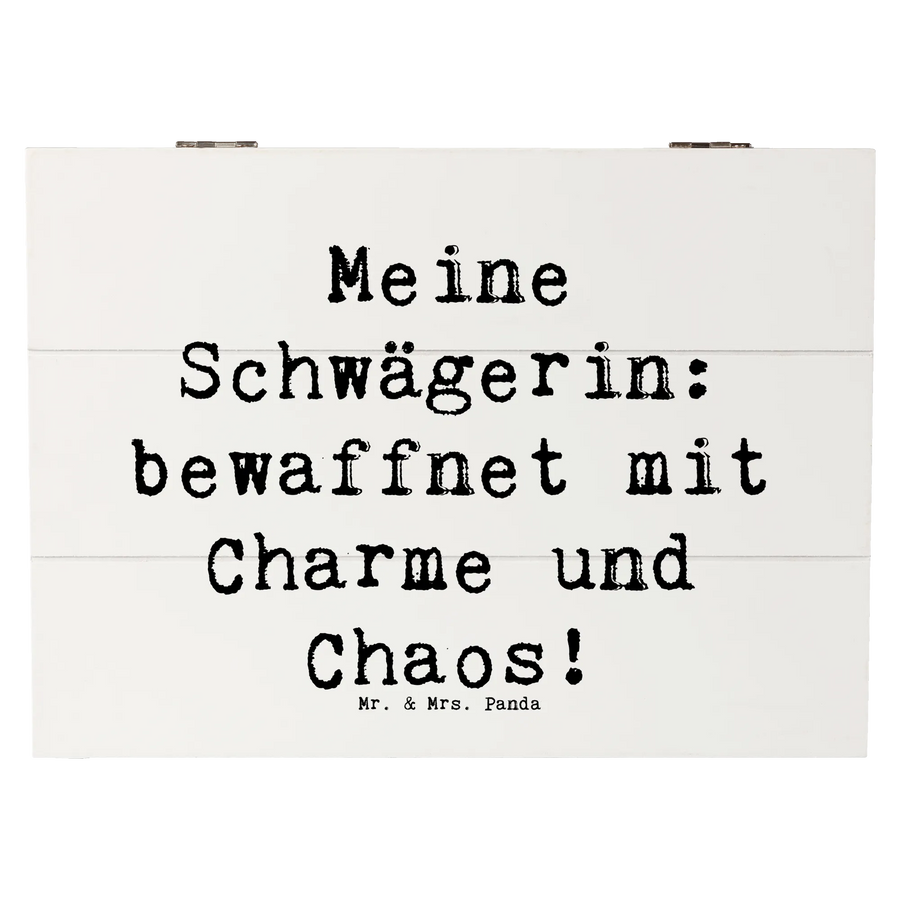 Suchst Du das perfekte Geschenk für Deine Schwägerin? Dann ist die wunderschöne Holzkiste von Mr. & Mrs. Panda genau das Richtige! Mit ihrem charmanten Spruch "Meine Schwägerin: bewaffnet mit Charme und Chaos!" feiert diese Kiste die besondere Beziehung, die Du zu Deiner Schwägerin hast. Sie ist nicht nur eine Verwandte durch Heirat, sondern auch oft eine Freundin, Vertraute, ja sogar wie eine Schwester.