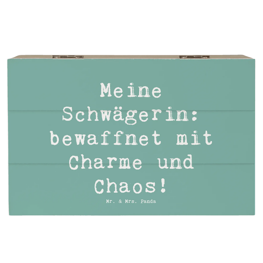 Suchst Du das perfekte Geschenk für Deine Schwägerin? Dann ist die wunderschöne Holzkiste von Mr. & Mrs. Panda genau das Richtige! Mit ihrem charmanten Spruch "Meine Schwägerin: bewaffnet mit Charme und Chaos!" feiert diese Kiste die besondere Beziehung, die Du zu Deiner Schwägerin hast. Sie ist nicht nur eine Verwandte durch Heirat, sondern auch oft eine Freundin, Vertraute, ja sogar wie eine Schwester.