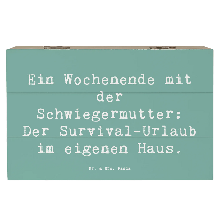 Die wunderschöne Holzkiste von Mr. & Mrs. Panda ist das perfekte Geschenk für Deine Schwiegermutter! Mit ihrem liebevollen Design und dem charmanten Motiv "Ein Wochenende mit der Schwiegermutter: Der Survival-Urlaub im eigenen Haus" wird diese Kiste nicht nur ein praktischer Aufbewahrungsort für all ihre besonderen Schätze, sondern auch ein echter Hingucker in jedem Zuhause. Ob für persönliche Erinnerungen, Familientreffen oder besondere Anlässe, diese Schatzkiste bietet Plenty of Platz für alles, was ihr wichtig ist.