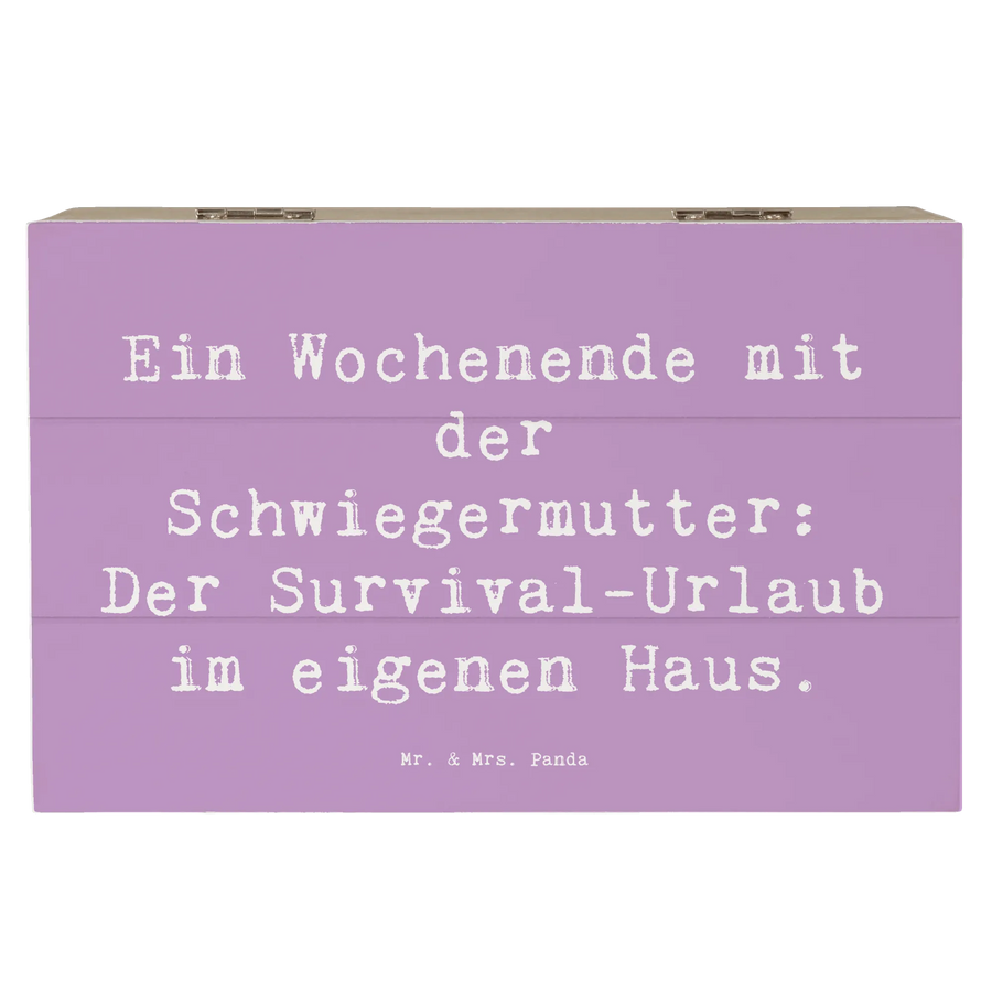 Die charmante Holzkiste von Mr. & Mrs. Panda ist das perfekte Geschenk für Deine Schwiegermutter! Sie wurde liebevoll mit dem Spruch "Ein Wochenende mit der Schwiegermutter: Der Survival-Urlaub im eigenen Haus." versehen und gehört zur exklusiven Kollektion Familie & Verwandte. Diese wunderschöne Erinnerungskiste ist nicht nur besonders stabil, sondern bietet auch einen idealen Aufbewahrungsort für all die wertvollen Schätze, die man im Laufe der Jahre gesammelt hat. Ob Fotos, kleine Geschenkideen oder andere Erinnerungsstücke – hier ist alles gut geschützt und immer griffbereit.