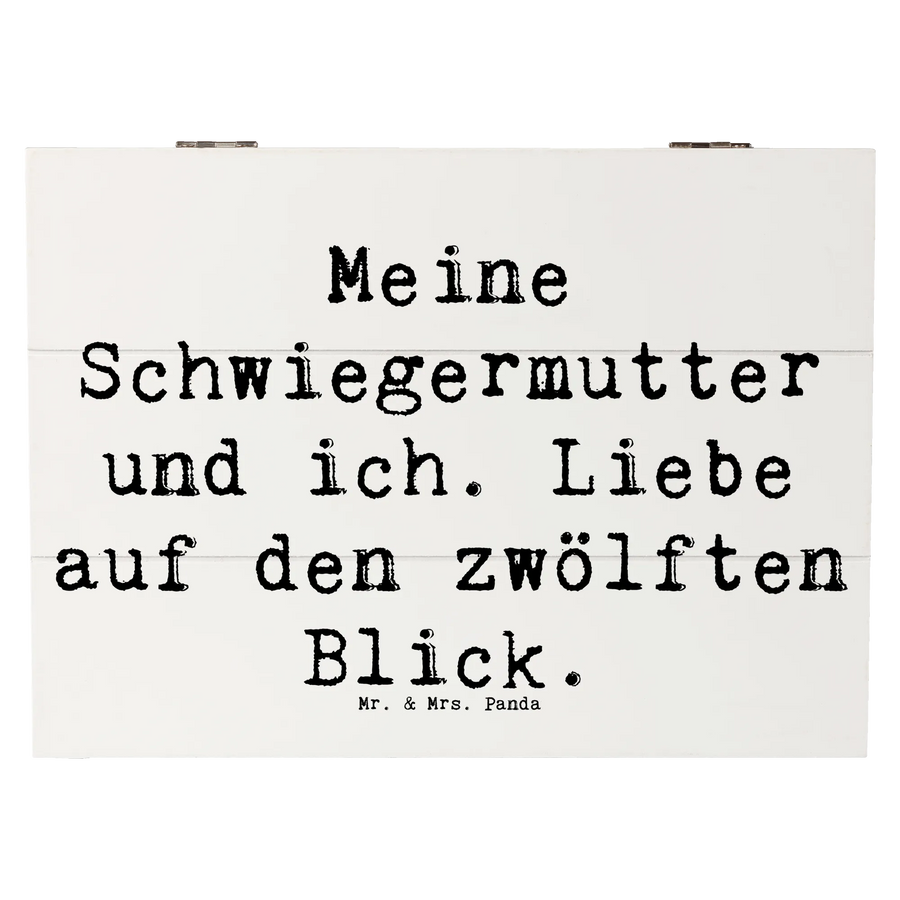 Eine Holzkiste voller Gefühle: Diese Erinnerungskiste von Mr. & Mrs. Panda aus der Kollektion Familie & Verwandte trägt den liebevollen Spruch „Meine Schwiegermutter und ich. Liebe auf den zwölften Blick.“ und ist das perfekte Geschenk, um Nähe, Dankbarkeit und ein Lächeln zu verschenken.