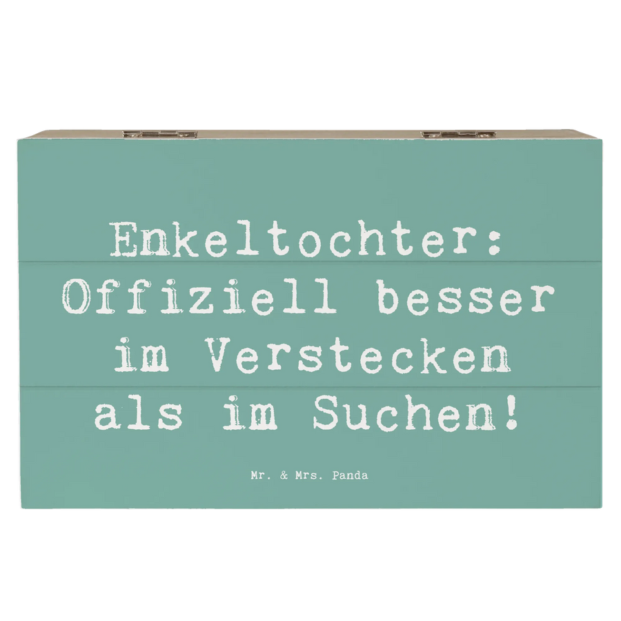 Suchst du das perfekte Geschenk für deine geliebte Enkeltochter? Diese wunderschöne Holzkiste von Mr. & Mrs. Panda ist nicht nur ein echter Hingucker, sondern auch eine ganz besondere Erinnerungskiste. Mit einem liebevollen Spruch, der sagt: "Enkeltochter: Offiziell besser im Verstecken als im Suchen!", feiert sie die einzigartige Verbindung zwischen Großeltern und Enkeltöchtern.