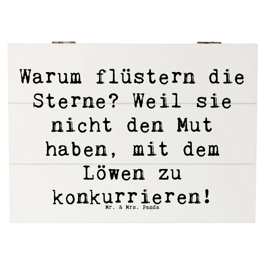 Die Holzkiste aus robuster Holzfaser ist nicht nur besonders stabil, sondern auch nachhaltig und wiederverwendbar. Ideal als Geschenkbox, ist sie perfekt, um originelle Geschenke für Freunde und Familie stilvoll zu verpacken. Mit einem liebevollen Spruch von Mr. & Mrs. Panda, "Warum flüstern die Sterne? Weil sie nicht den Mut haben, mit dem Löwen zu konkurrieren!", wird jede Kiste zu etwas ganz Besonderem.