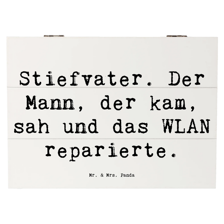 Die Holzkiste "Stiefvater" von Mr. & Mrs. Panda ist das perfekte Geschenk für alle, die das Besondere schätzen. Mit ihrem charmanten Design und dem liebevollen Spruch "Stiefvater. Der Mann, der kam, sah und das WLAN reparierte." verkörpert diese Kiste die wichtige Rolle, die Stiefväter in Patchwork-Familien einnehmen.
