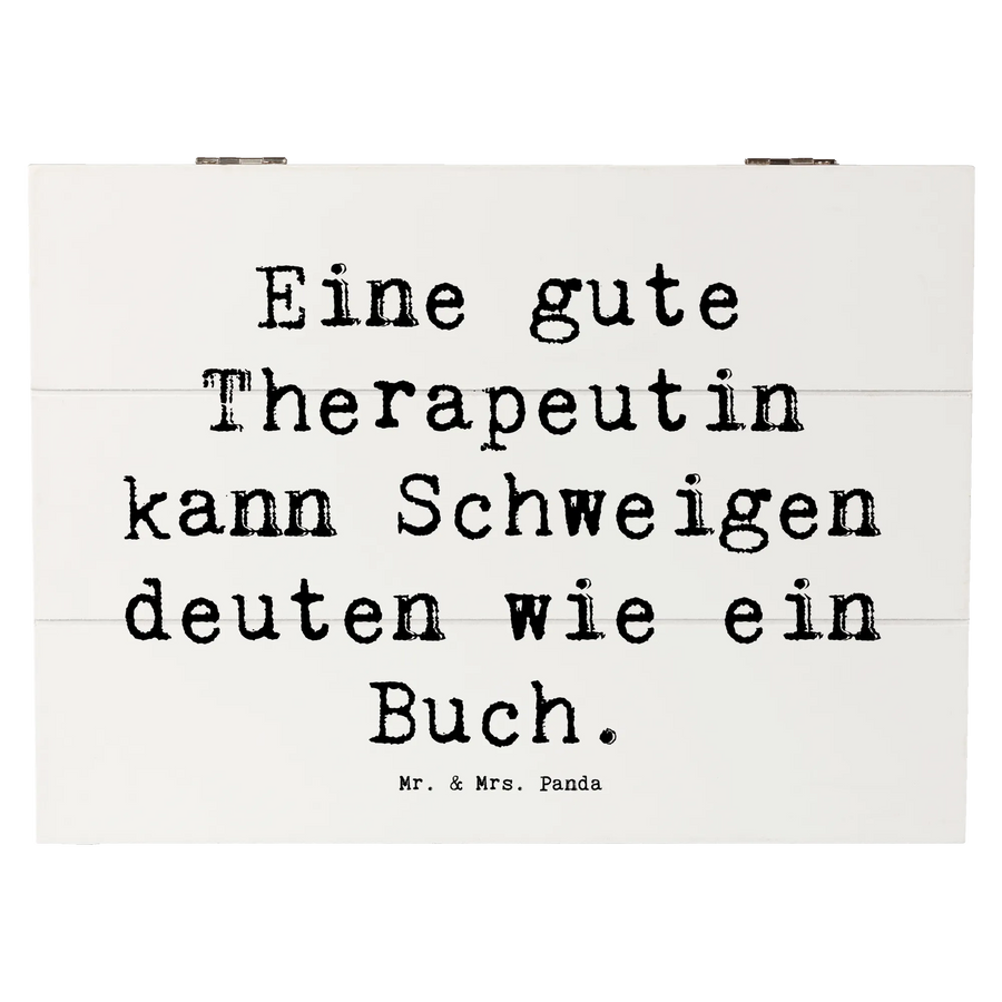 Entdecke die bezaubernde Holzkiste von Mr. & Mrs. Panda, die perfekt für alle Therapeuten und Therapeutinnen ist! Mit dem liebevoll gestalteten Motiv und dem tiefgründigen Spruch "Eine gute Therapeutin kann Schweigen deuten wie ein Buch" ist diese Kiste nicht nur ein praktischer Aufbewahrungsort für Deine wertvollen Erinnerungen, sondern auch ein wunderschönes Dekoelement, das jeden Raum verschönert.