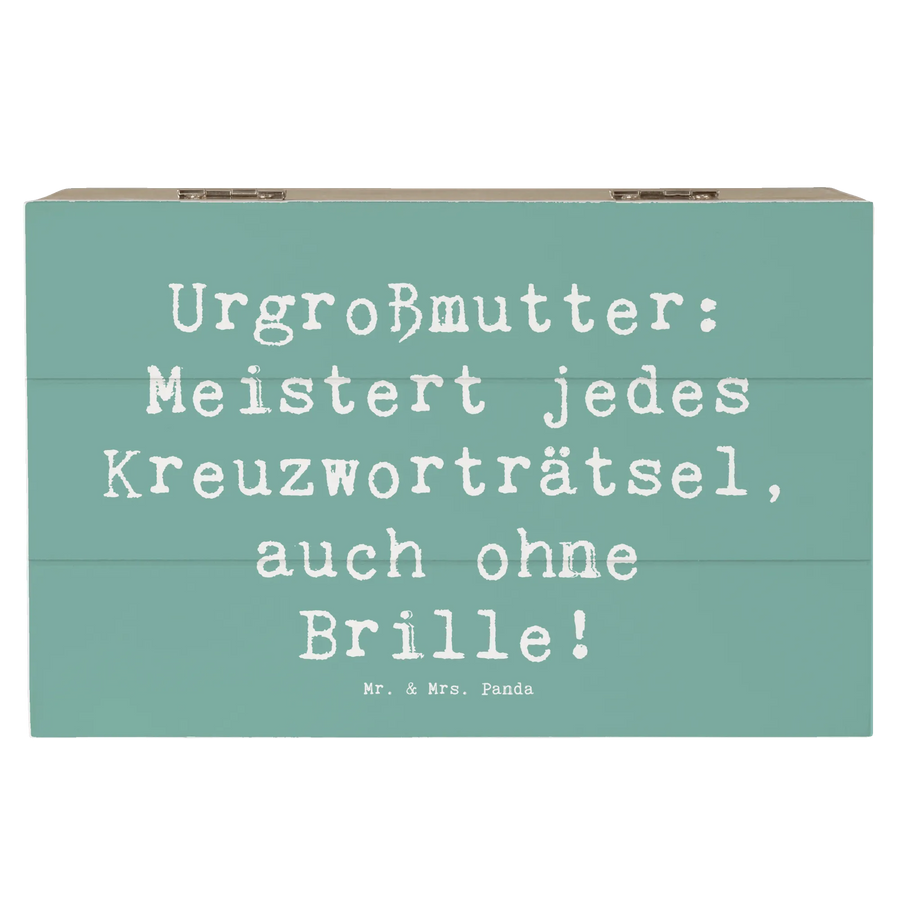 Du suchst das perfekte Geschenk für die Urgroßmutter oder möchtest eine besondere Erinnerung an sie bewahren? Unsere wunderschöne Holzkiste von Mr. & Mrs. Panda ist die ideale Wahl! Mit dem bezaubernden Spruch "Urgroßmutter: Meistert jedes Kreuzworträtsel, auch ohne Brille!" bringt sie die warmen Erinnerungen an die Zeit mit der Urgroßmutter zurück.