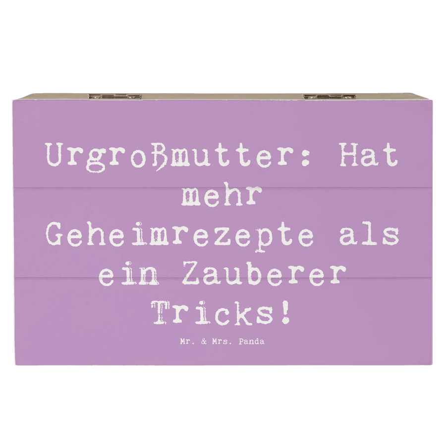 Entdecke die liebevoll gestaltete Holzkiste von Mr. & Mrs. Panda mit dem zauberhaften Motiv "Urgroßmutter: Hat mehr Geheimrezepte als ein Zauberer Tricks!" Diese wunderschöne Holzkiste ist nicht nur ein einzigartiges Deko-Element, sondern auch ein praktischer Aufbewahrungsort für all Deine wertvollen Schätze und Erinnerungen.