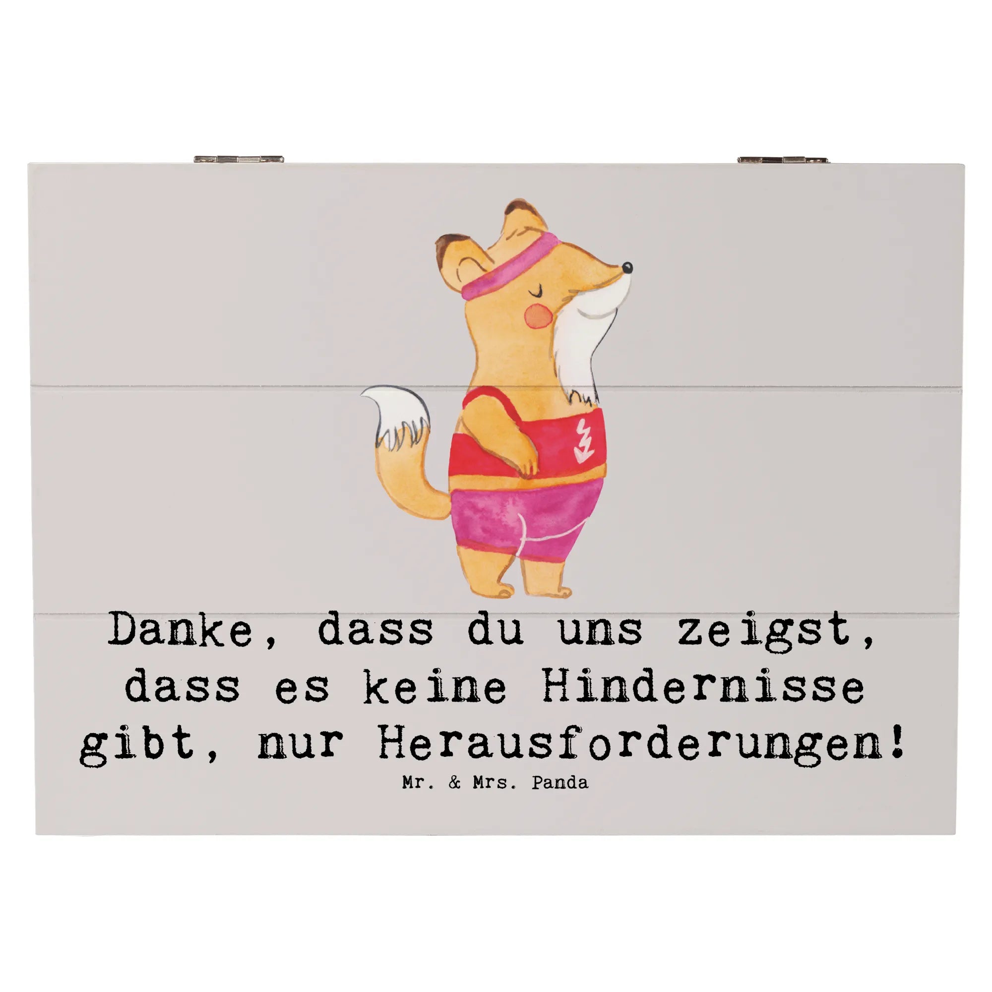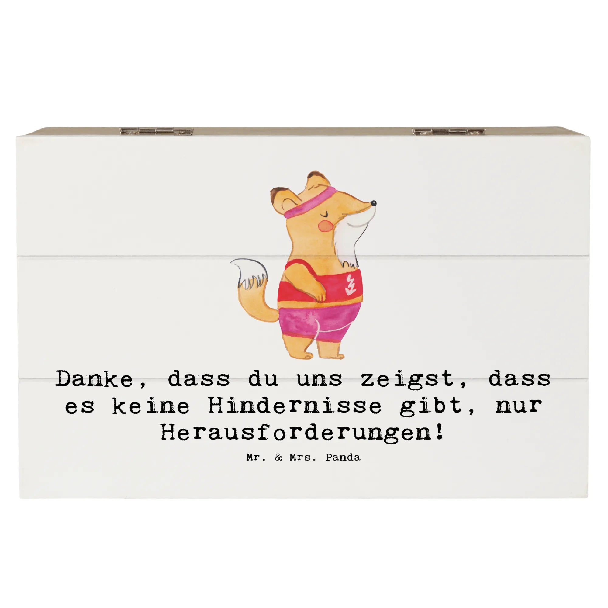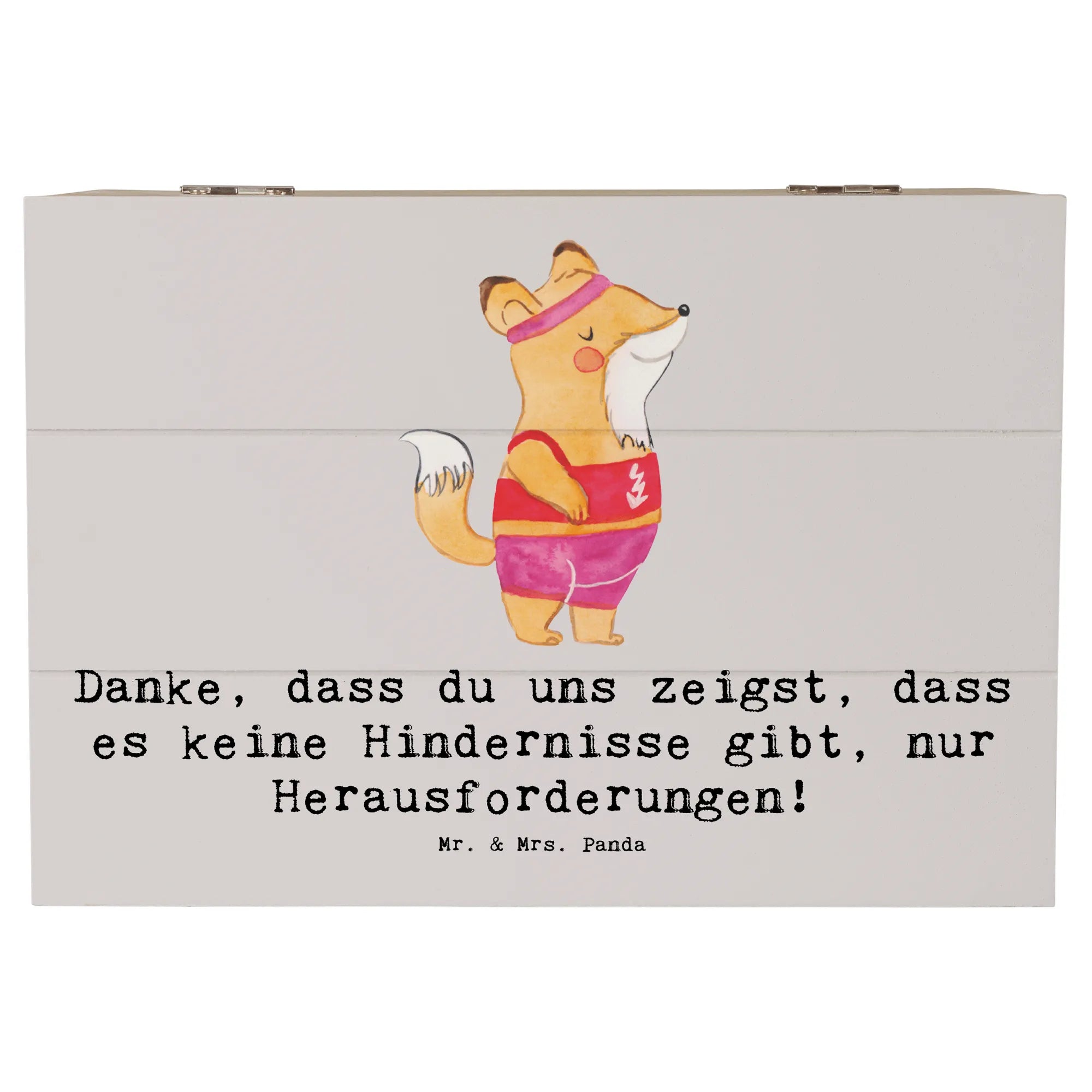 Entdecke die perfekte Erinnerungskiste für die Trainerin in deinem Leben! Diese wunderschöne Holzkiste von Mr. & Mrs. Panda ist mehr als nur ein Aufbewahrungsort für Schätze – sie ist ein echter Hingucker. Mit ihrem einzigartigen Design und dem inspirierenden Slogan "Danke, dass du uns zeigst, dass es keine Hindernisse gibt, nur Herausforderungen!" wird sie jeden Sportler und jede Sportlerin begeistern.