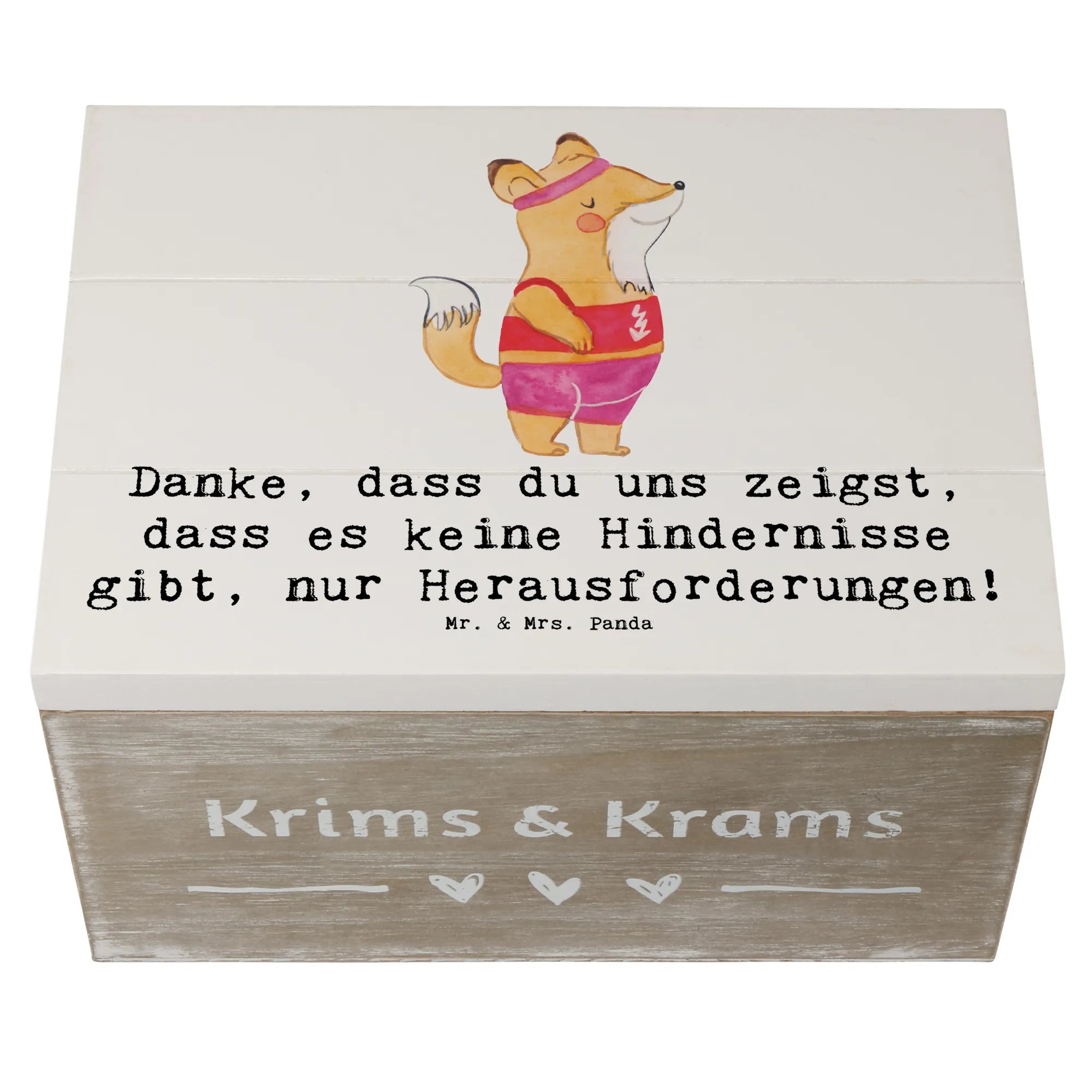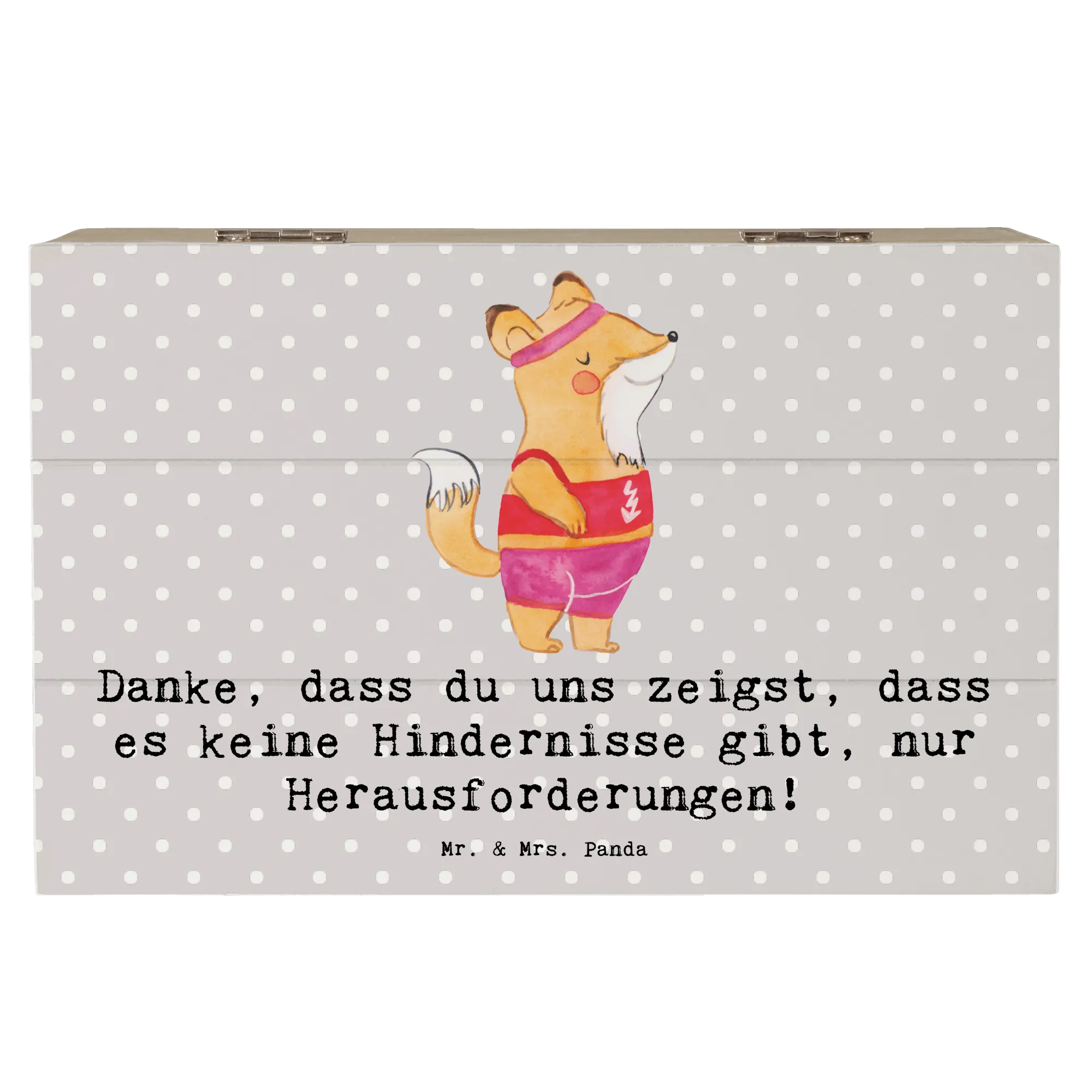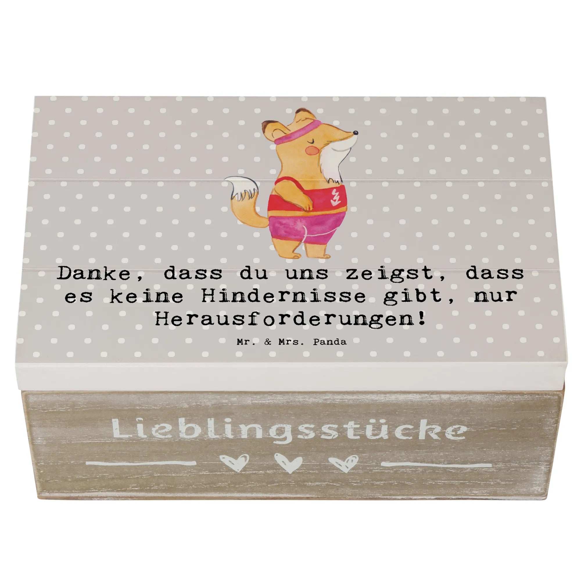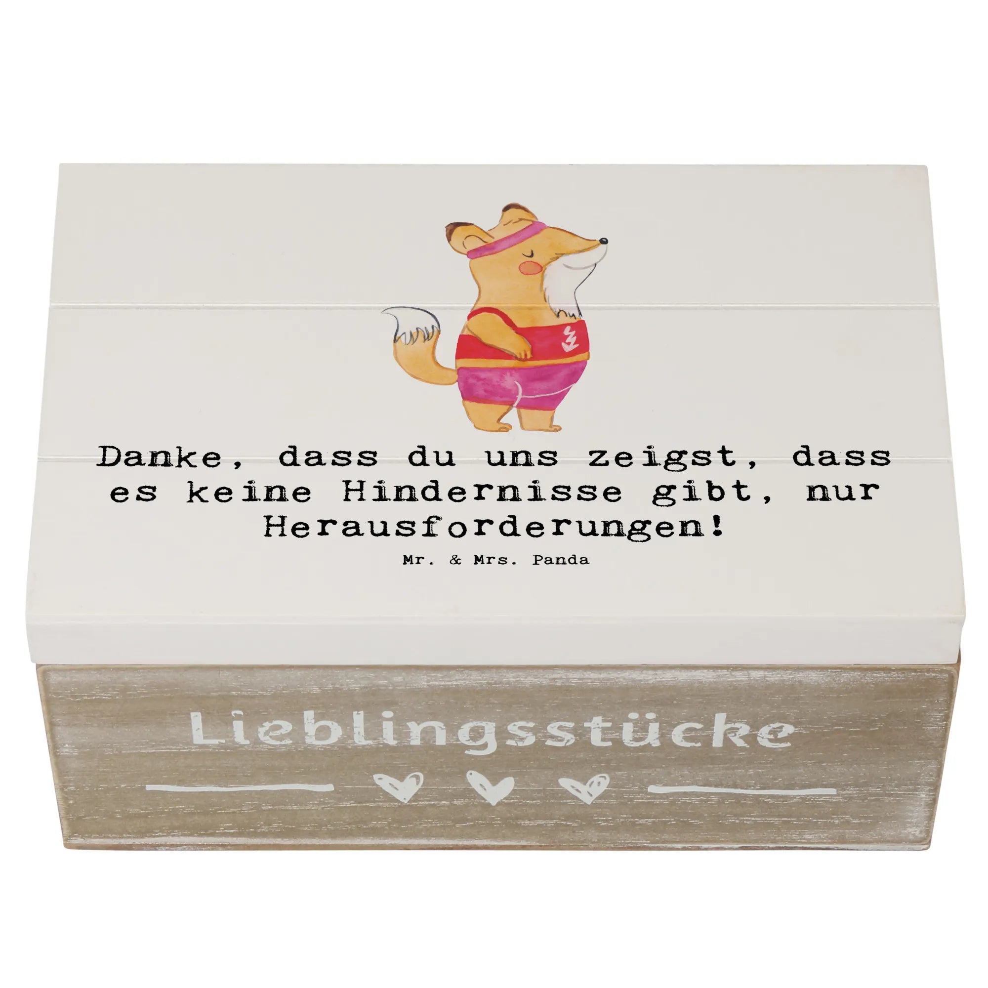 Entdecke die perfekte Erinnerungskiste für die Trainerin in deinem Leben! Diese wunderschöne Holzkiste von Mr. & Mrs. Panda ist mehr als nur ein Aufbewahrungsort für Schätze – sie ist ein echter Hingucker. Mit ihrem einzigartigen Design und dem inspirierenden Slogan "Danke, dass du uns zeigst, dass es keine Hindernisse gibt, nur Herausforderungen!" wird sie jeden Sportler und jede Sportlerin begeistern.