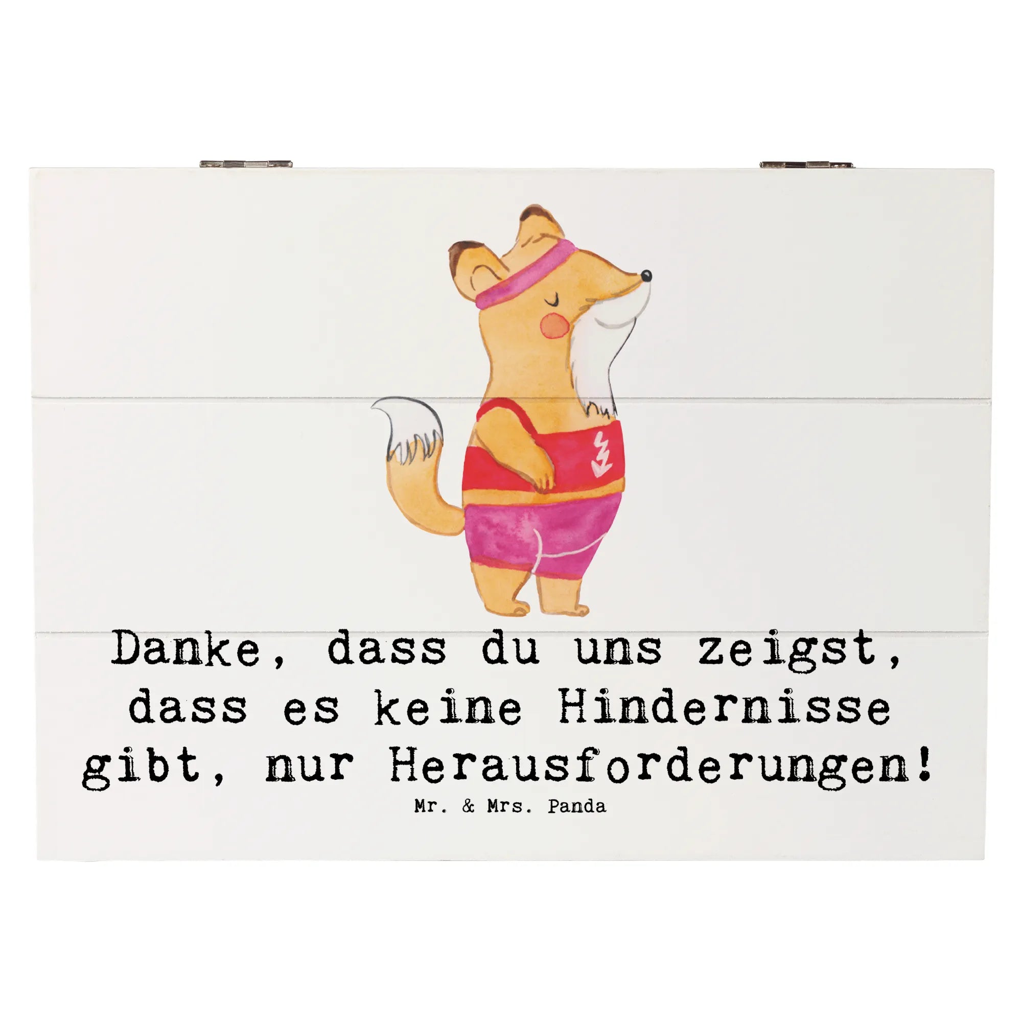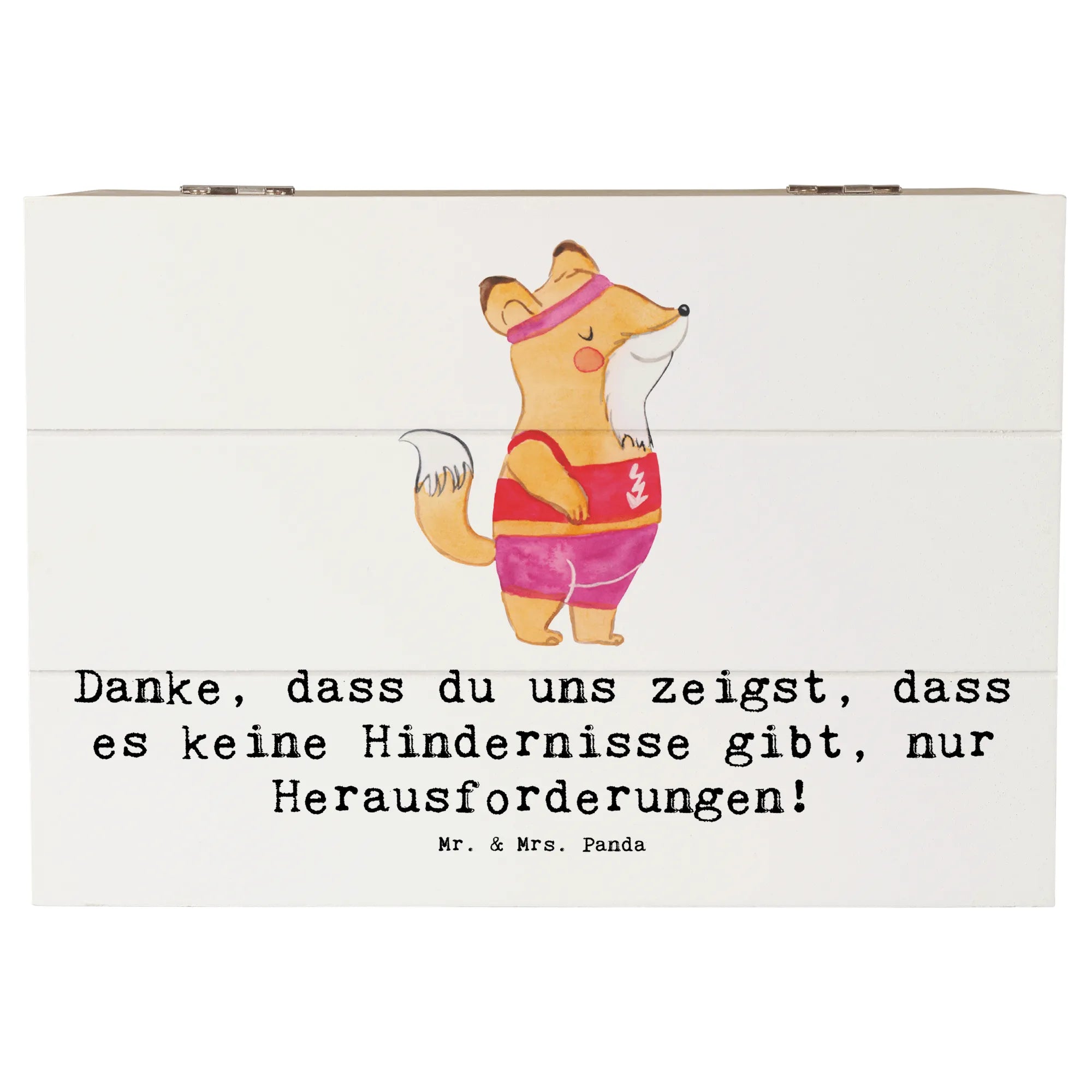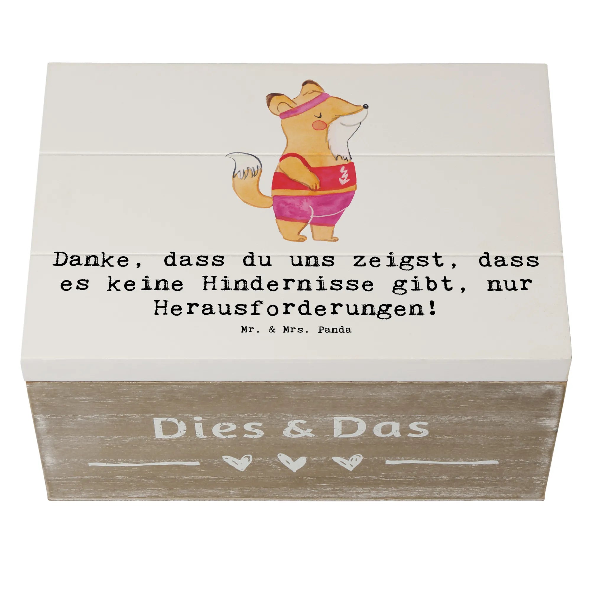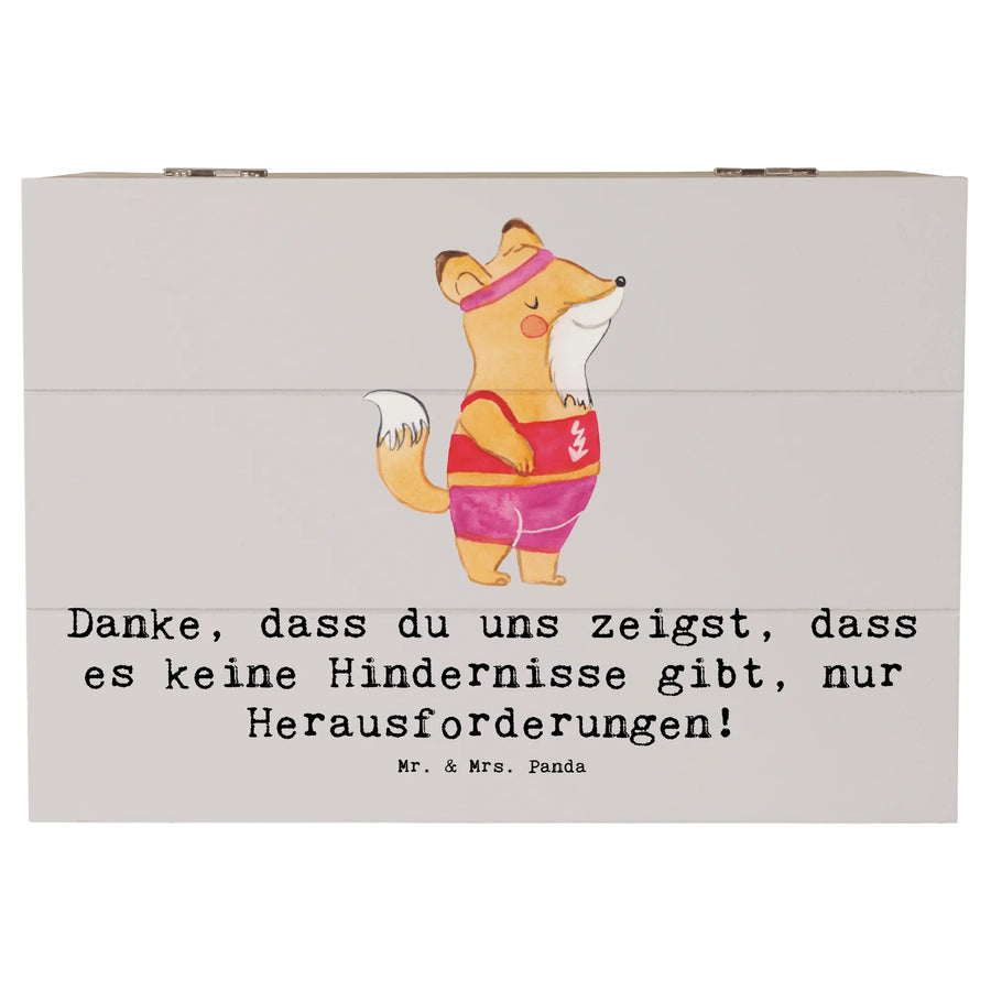 Eine liebevolle Holzkiste von Mr. & Mrs. Panda – das ideale Geschenk für Deine Leichtathletik-Trainerin! Die Holzkiste mit Deckel trägt das zauberhafte Motiv „Leichtathletik Trainerin" und den warmen Spruch: „Danke, dass du uns zeigst, dass es keine Hindernisse gibt, nur Herausforderungen!" 🎁