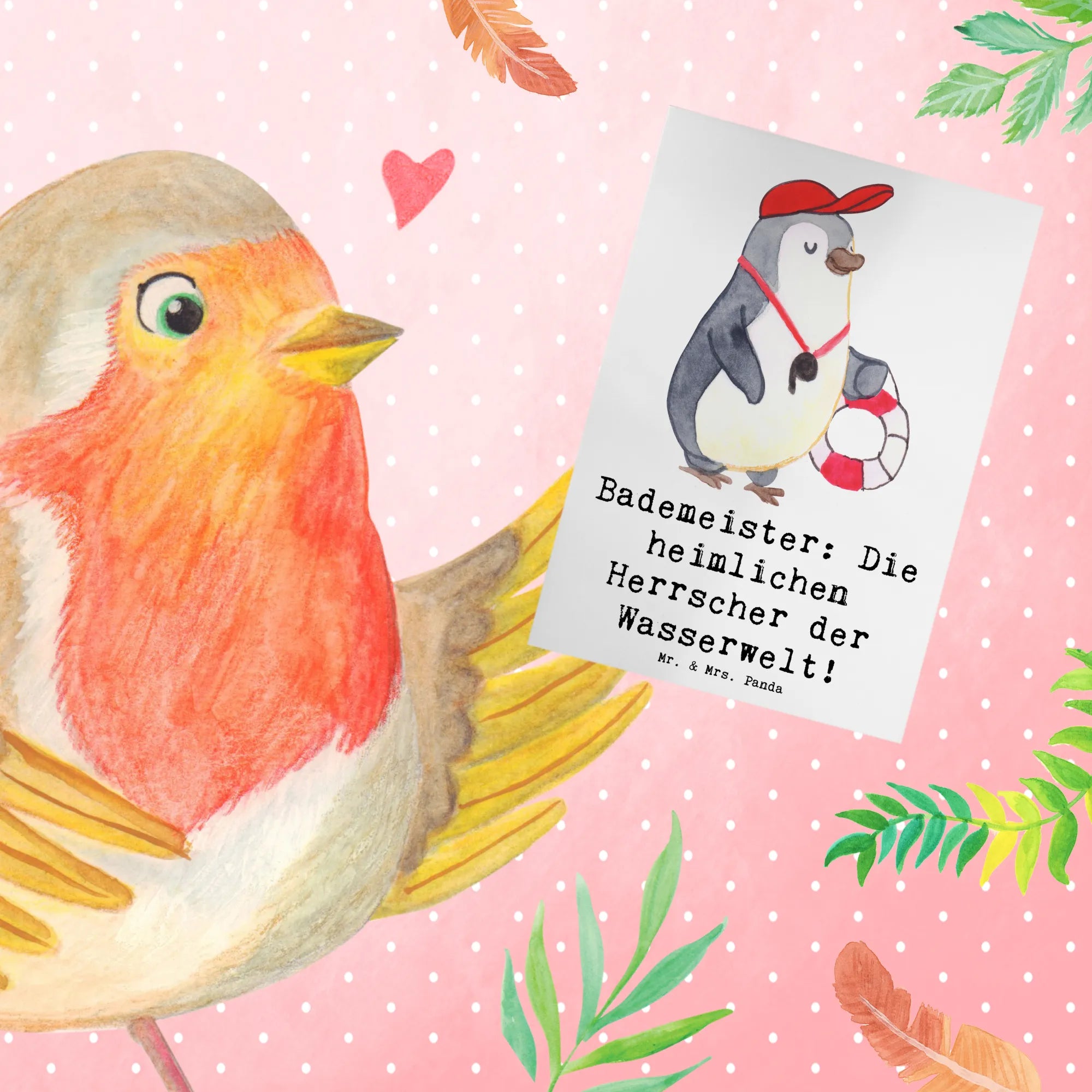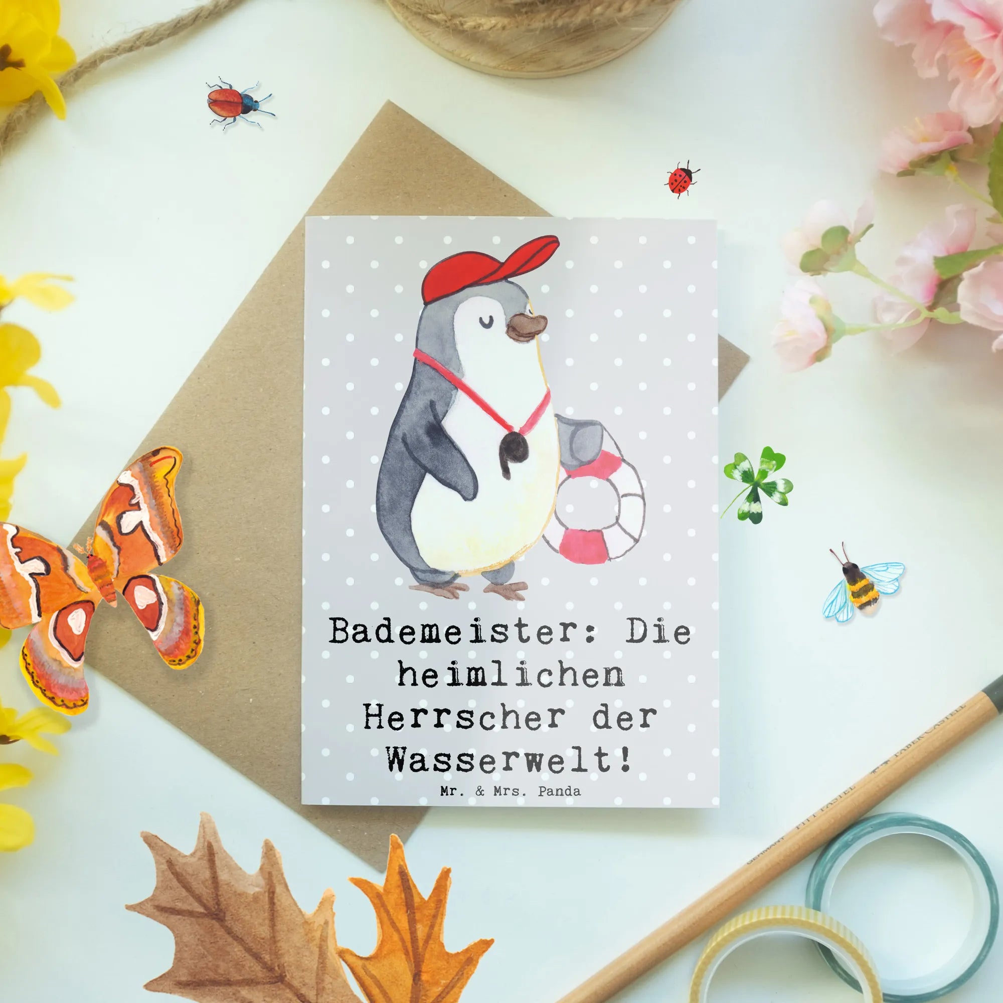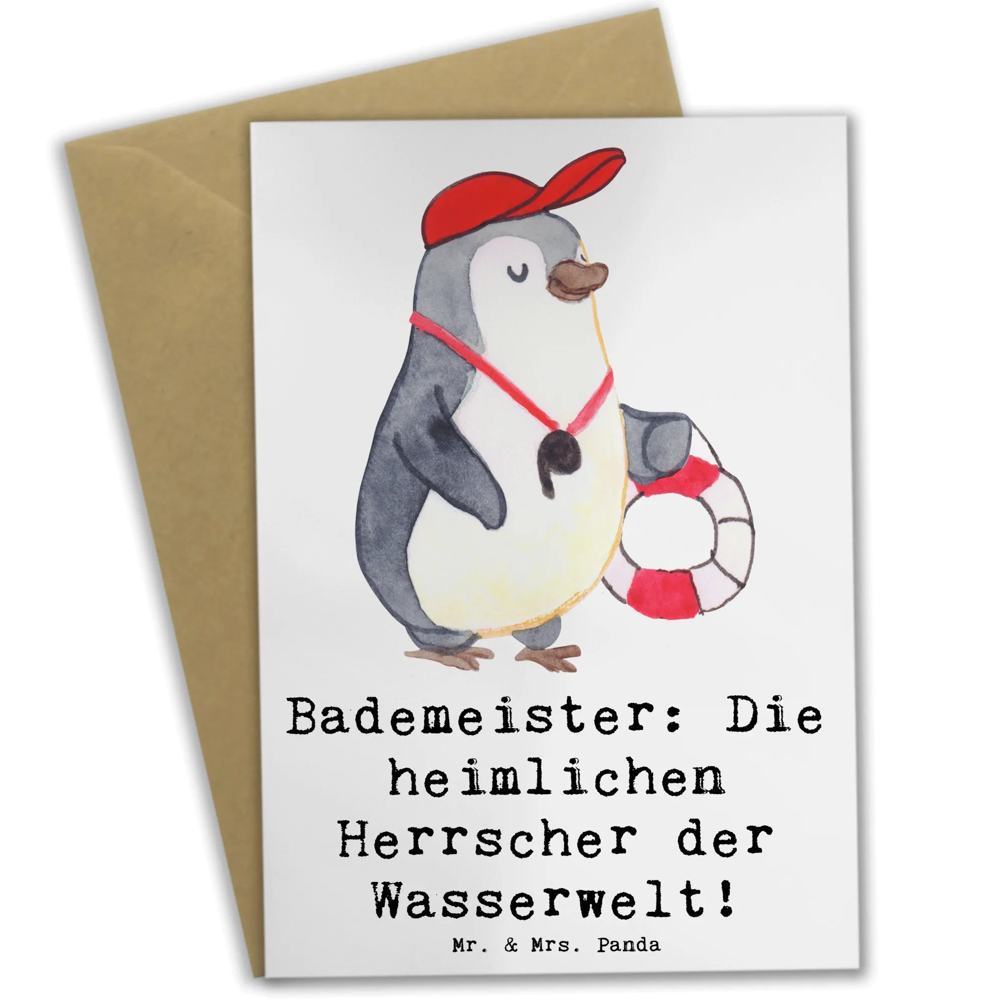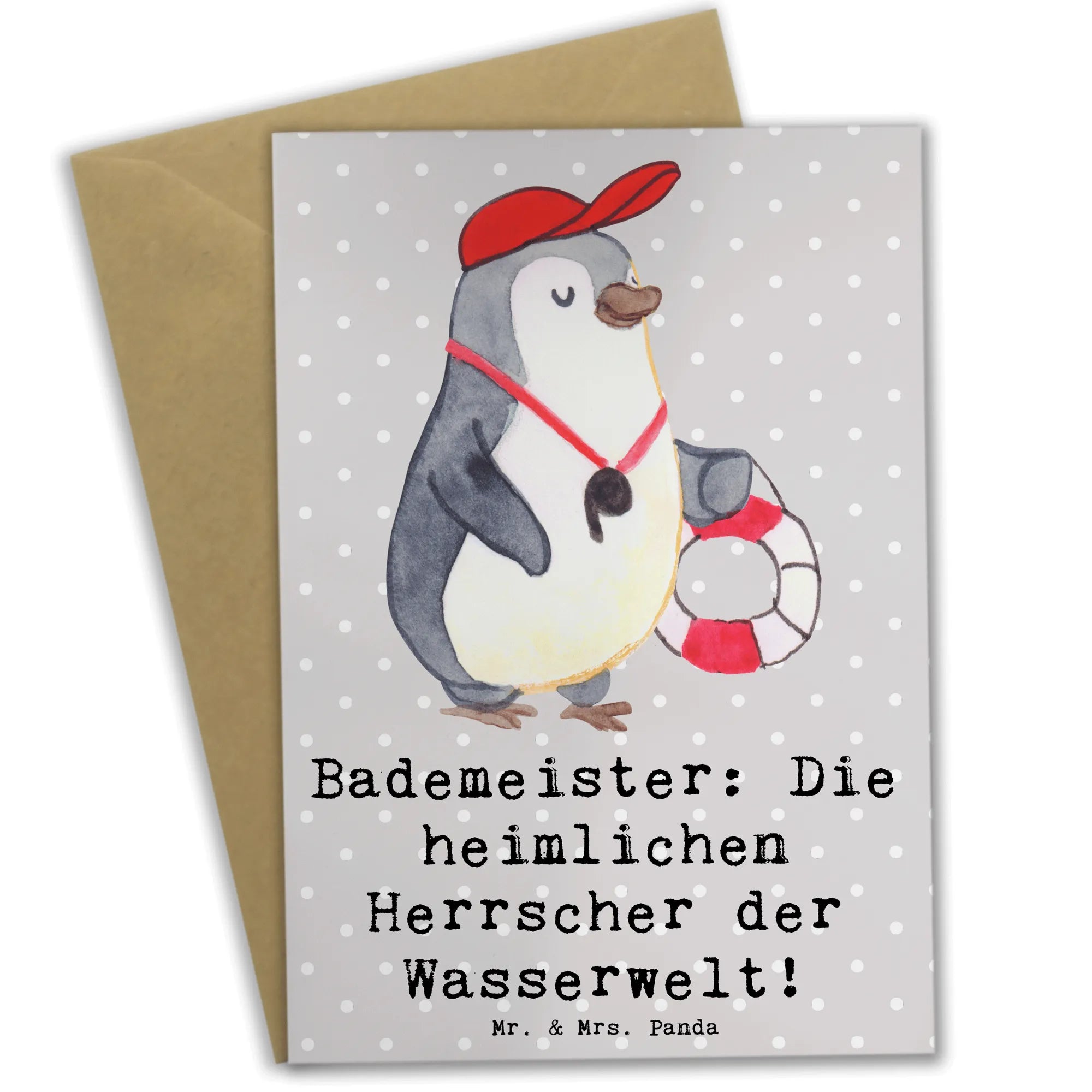 Die Grußkarte "Bademeister: Die heimlichen Herrscher der Wasserwelt!" aus der Berufe-Kollektion von Mr. & Mrs. Panda ist das perfekte Geschenk für alle, die die Welt des Wassers lieben! Egal ob für Familie, Freunde oder Kollegen – diese Karte bringt ein Lächeln auf jedes Gesicht.
