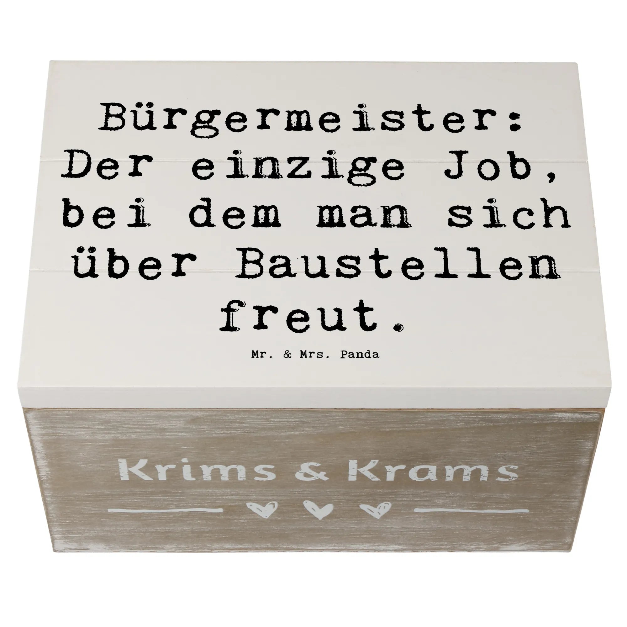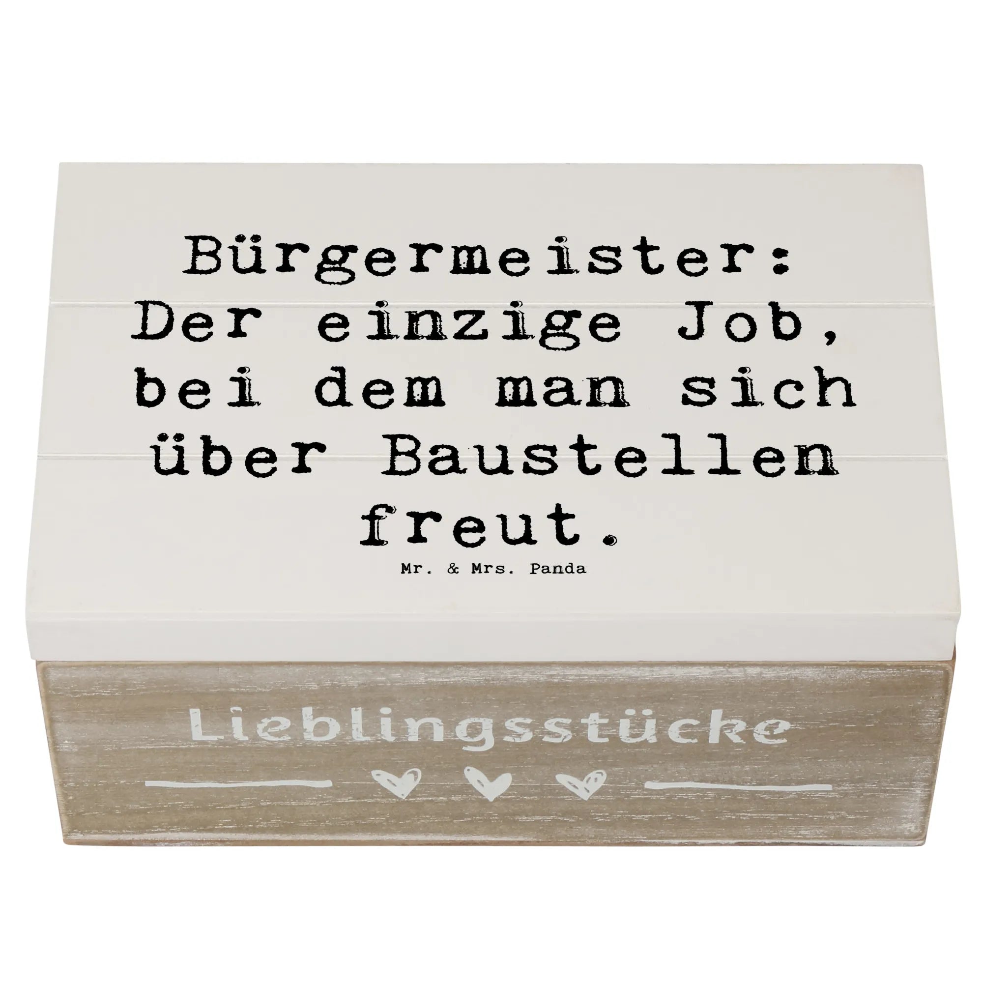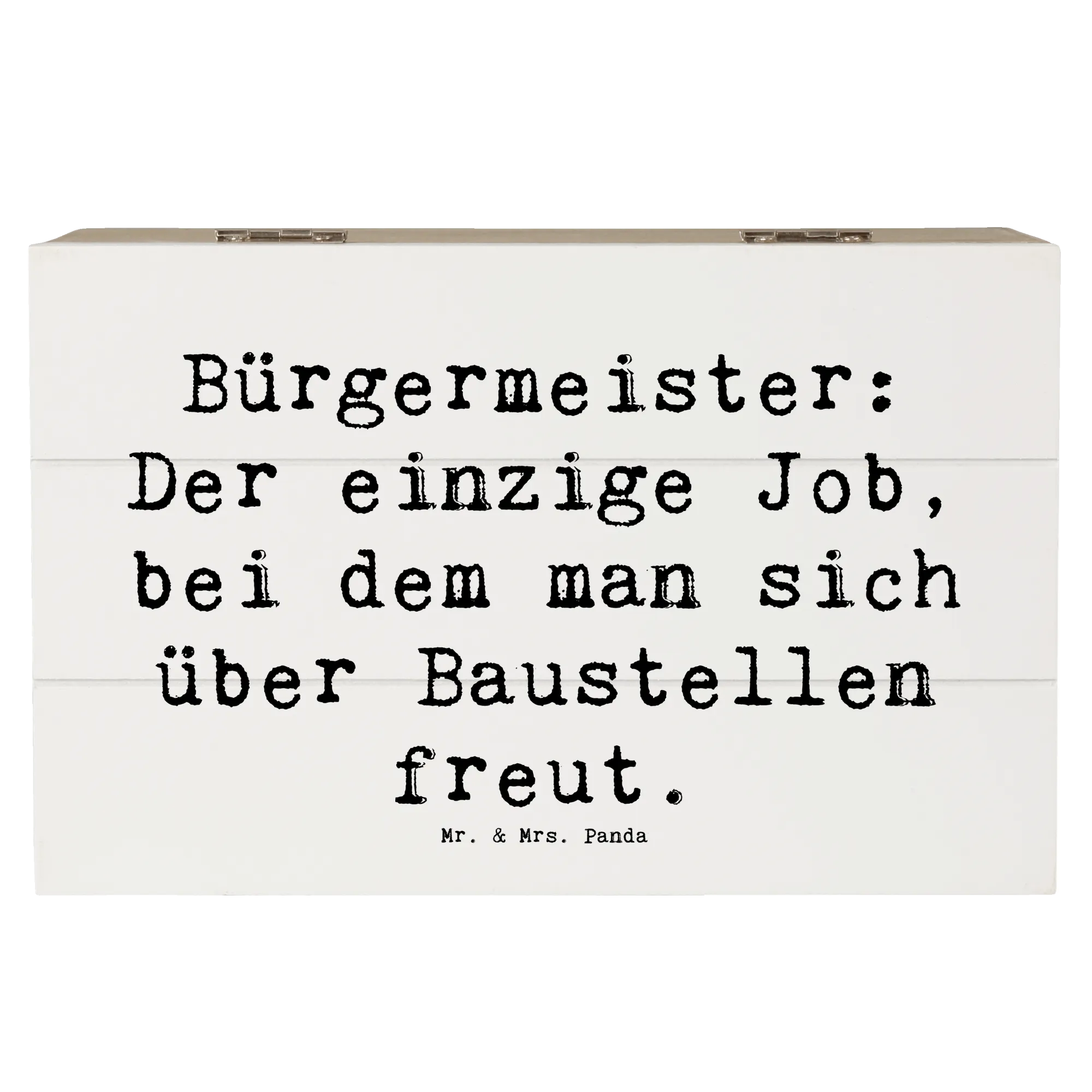 Auf der Kiste prangt der lustige Spruch "Bürgermeister: Der einzige Job, bei dem man sich über Baustellen freut." – perfekt für den humorvollen Bürgermeister oder einen angehenden Politiker in deinem Leben. Egal, ob zum Geburtstag, zu einem Berufsabschluss oder einfach nur so – diese Erinnerungskiste ist ein ganz besonderes Geschenk, das Freude bereitet!
