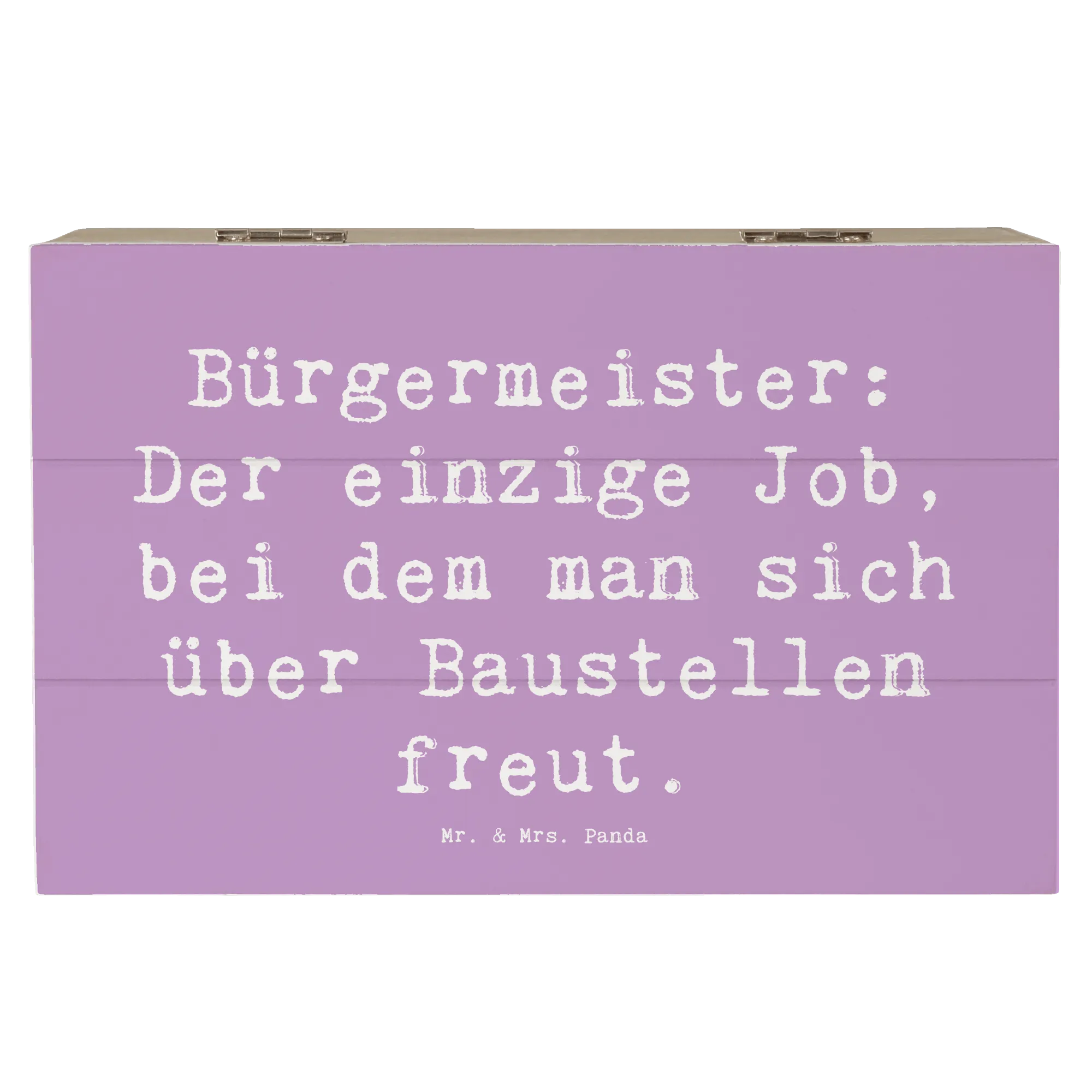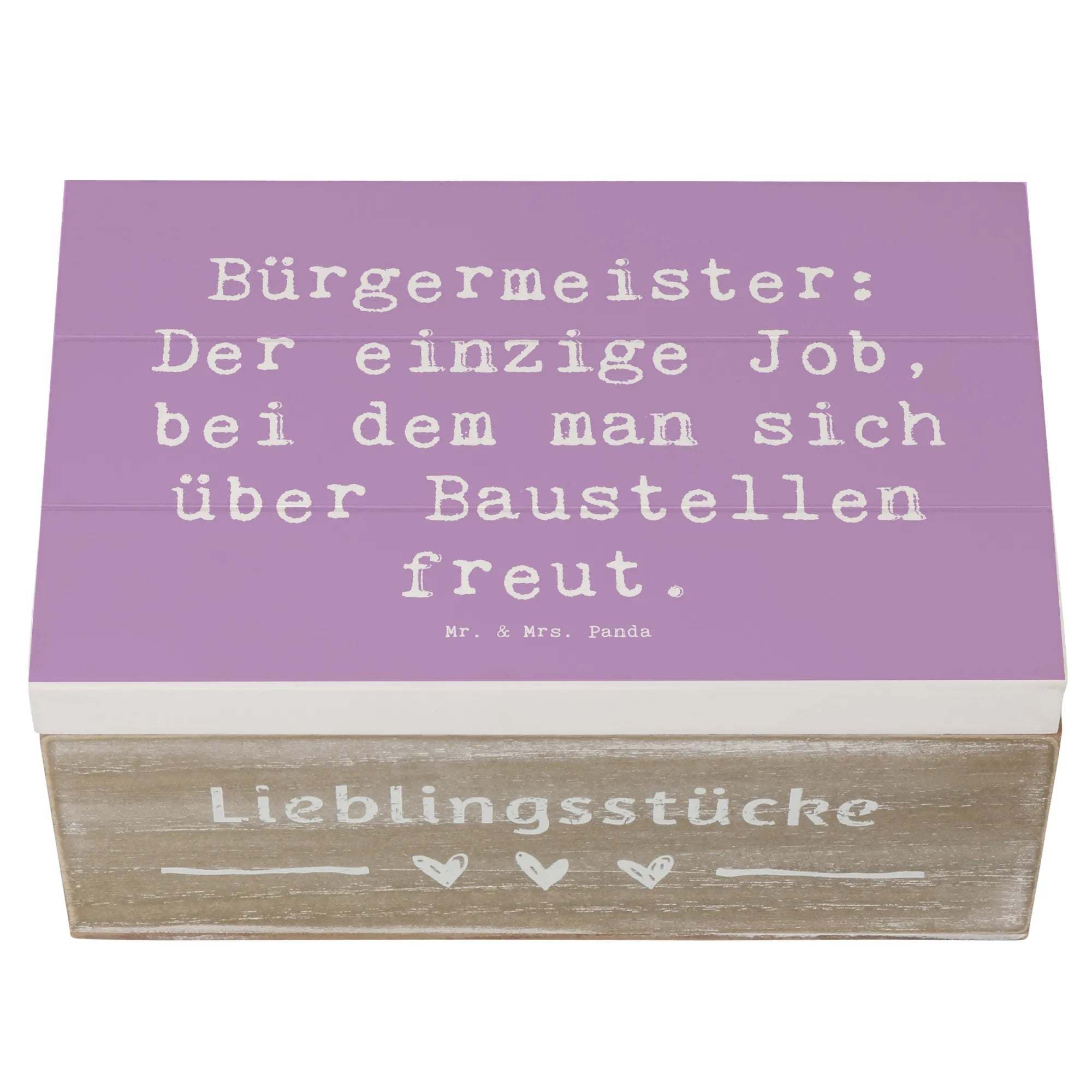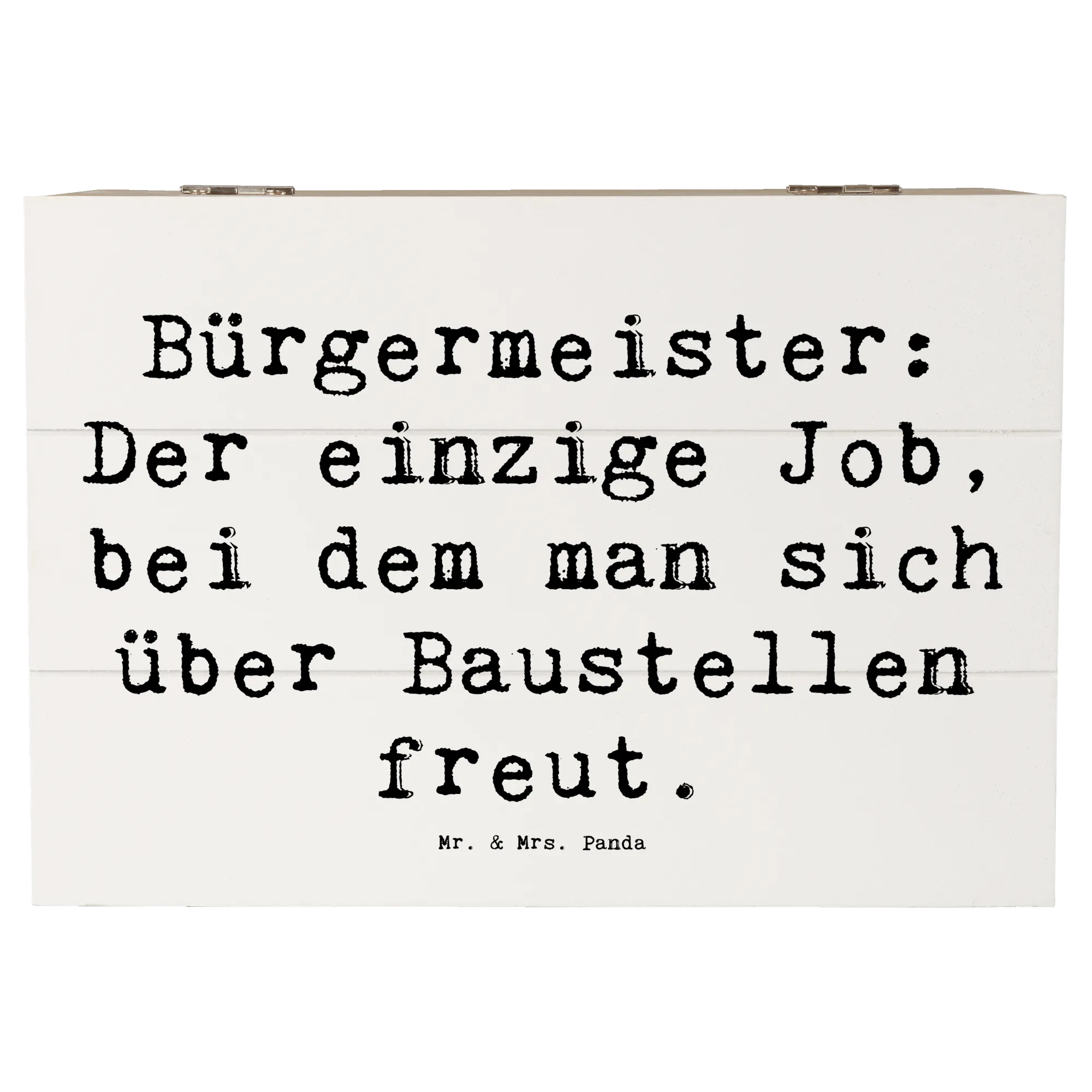 Auf der Kiste prangt der lustige Spruch "Bürgermeister: Der einzige Job, bei dem man sich über Baustellen freut." – perfekt für den humorvollen Bürgermeister oder einen angehenden Politiker in deinem Leben. Egal, ob zum Geburtstag, zu einem Berufsabschluss oder einfach nur so – diese Erinnerungskiste ist ein ganz besonderes Geschenk, das Freude bereitet!