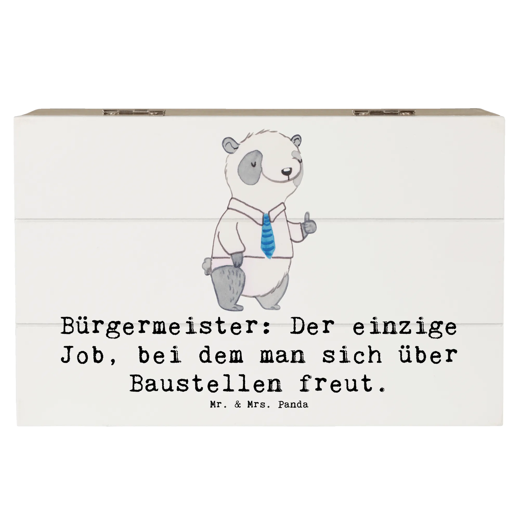Die liebevoll gestaltete Holzkiste hat die Maße 19 cm x 12 cm x 10 cm und ist aus robuster Holzfaser gefertigt, die zusätzlich wasserabweisend ist. Das Design stammt aus der kreativen Berufe-Kollektion von Mr. & Mrs. Panda und steht unter dem Motto: 'Bürgermeister: Der einzige Job, bei dem man sich über Baustellen freut.' Diese charmante Botschaft wird jeden Freund und Kollegen zum Schmunzeln bringen und dafür sorgen, dass die Kiste ein echtes Highlight in jedem Raum wird.