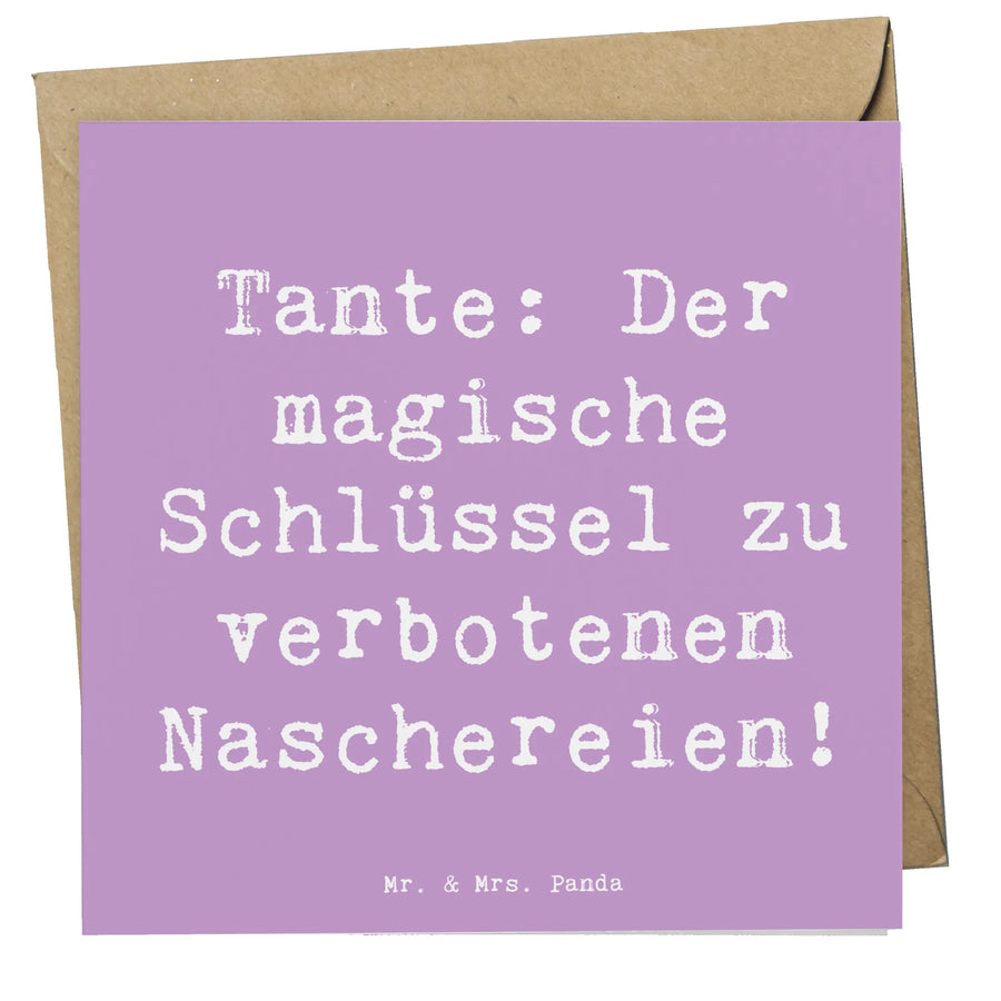Auf der Vorderseite der Karte findest Du unseren charmanten Spruch: 'Tante: Der magische Schlüssel zu verbotenen Naschereien!', der nicht nur ein Lächeln auf das Gesicht Deiner Tante zaubert, sondern auch zeigt, wie besonders und einzigartig die Bindung zwischen Tanten und ihren Nichten oder Neffen ist.