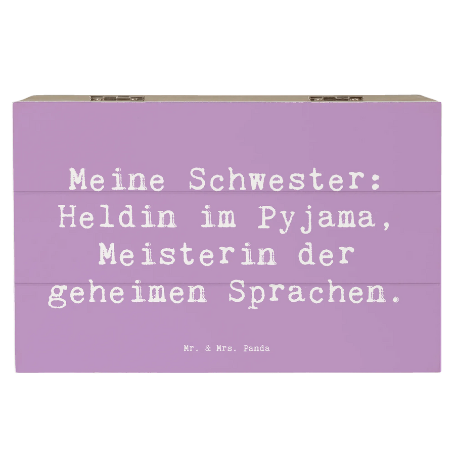 Die wunderschöne Holzkiste von Mr. & Mrs. Panda mit dem Motiv "Meine Schwester: Heldin im Pyjama, Meisterin der geheimen Sprachen" ist das perfekte Geschenk für jede Schwester!