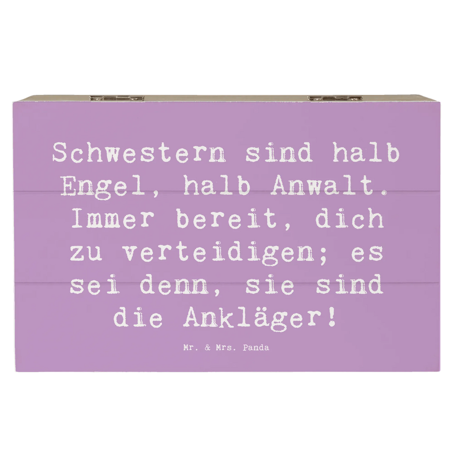 Wenn du nach einem persönlichen und liebevollen Familiengeschenk suchst, dann ist diese Holzkiste genau das Richtige. Mit einem zauberhaften Spruch, der besagt: "Schwestern sind halb Engel, halb Anwalt. Immer bereit, dich zu verteidigen; es sei denn, sie sind die Ankläger!" zaubert sie nicht nur ein Lächeln auf die Lippen, sondern fängt auch die gemeinsamen Erinnerungen und das enge Band zwischen Schwestern ein.