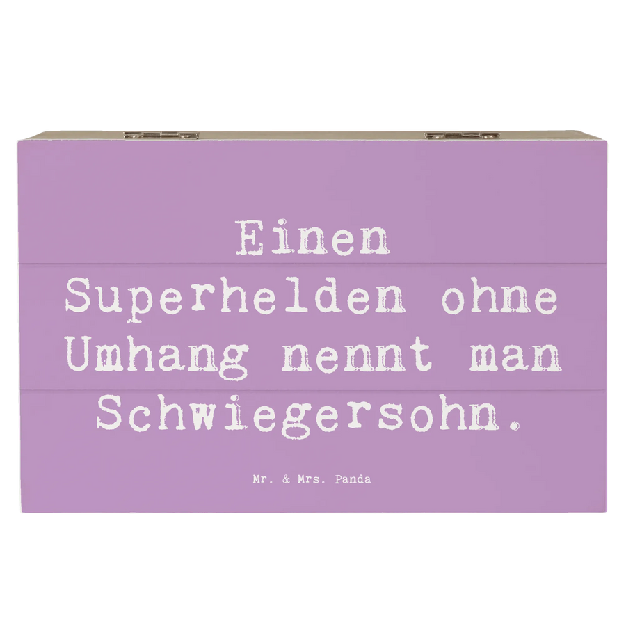 Entdecke die bezaubernde Holzkiste für den Schwiegersohn von Mr. & Mrs. Panda. Diese wundervolle Kiste ist nicht nur ein praktischer Aufbewahrungsort für all die kleinen Schätze, die du in dein Herz geschlossen hast, sondern auch ein herzliches Geschenk für den besonderen Menschen in der Familie. Mit einem liebevoll gestalteten Motiv, das den Spruch "Einen Superhelden ohne Umhang nennt man Schwiegersohn" zeigt, wird dieser Schatztruhen-Style jedem Schwiegersohn ein Lächeln ins Gesicht zaubern.