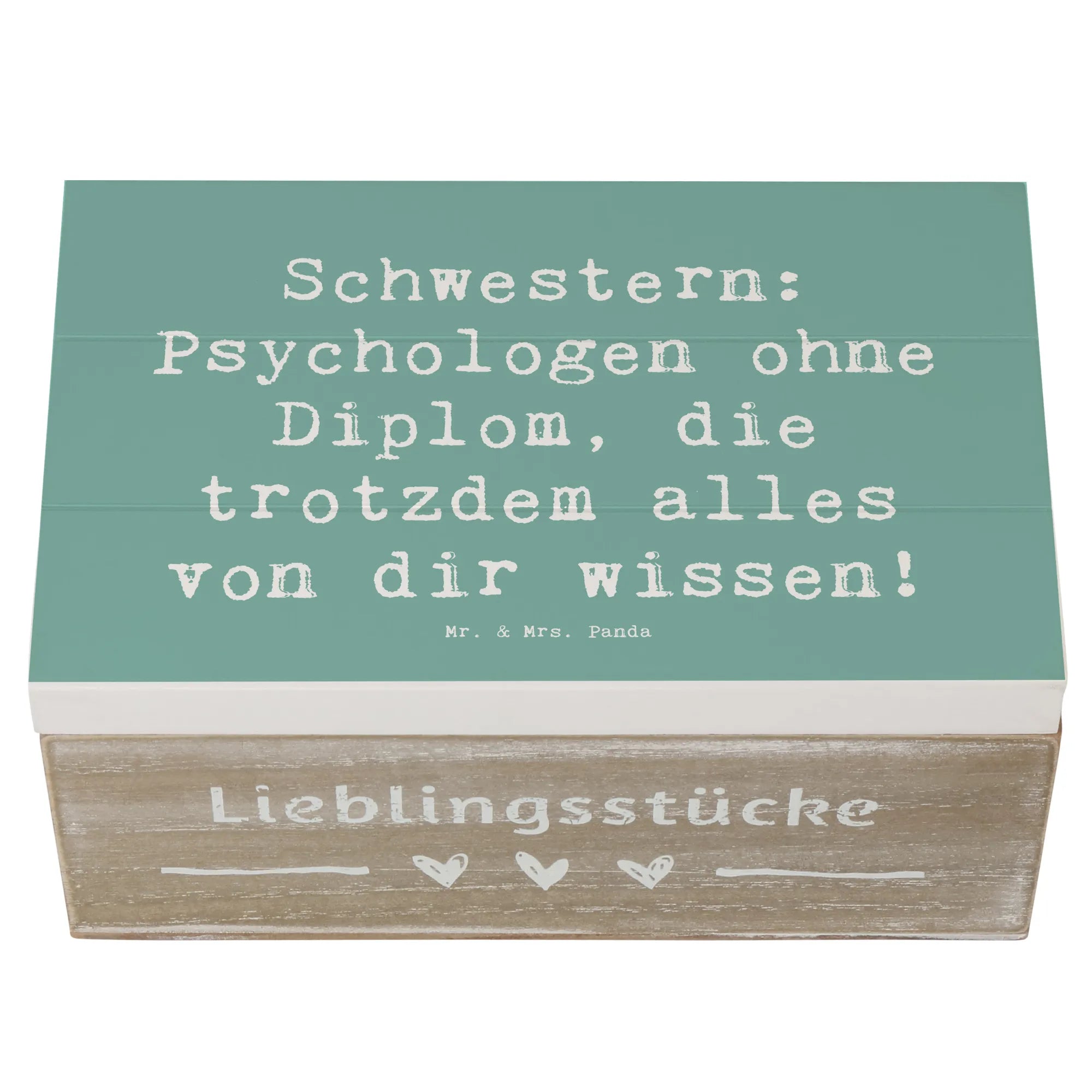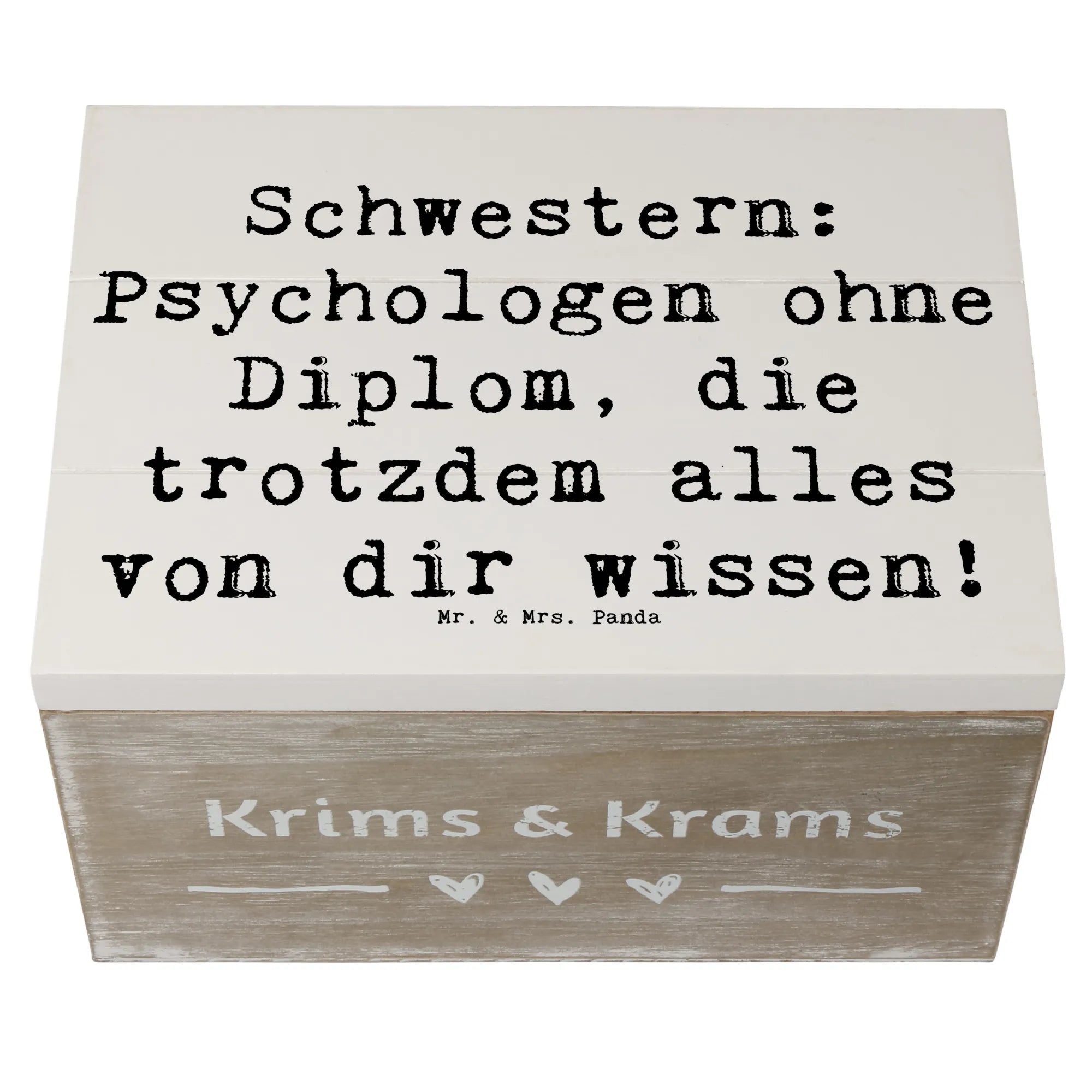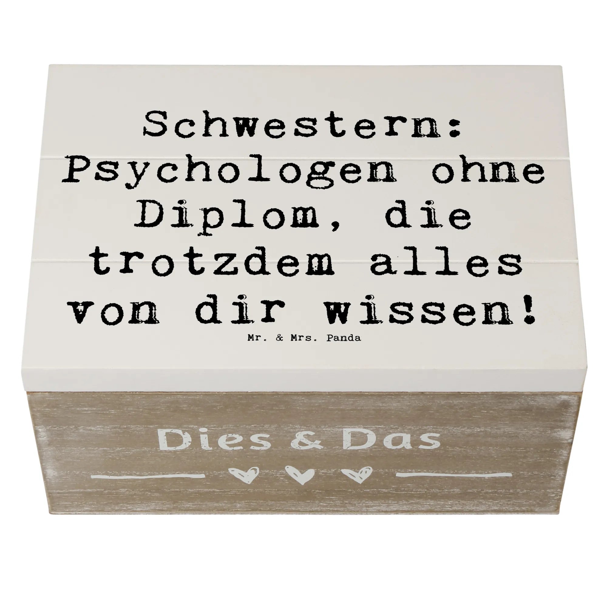 Die Beziehung zu einer Schwester ist einzigartig. Schwestern sind nicht nur Geschwister - sie sind auch beste Freundinnen, Vertraute und oft sogar Seelentröster. Mit dem Spruch „Schwestern: Psychologen ohne Diplom, die trotzdem alles von dir wissen!“ wird diese besondere Verbindung auf wunderbare Weise festgehalten. Egal, ob du die Kiste für Deine ältere Schwester oder Deine kleine Schwester kaufst, sie wird sich über dieses durchdachte Geschenk einfach freuen.