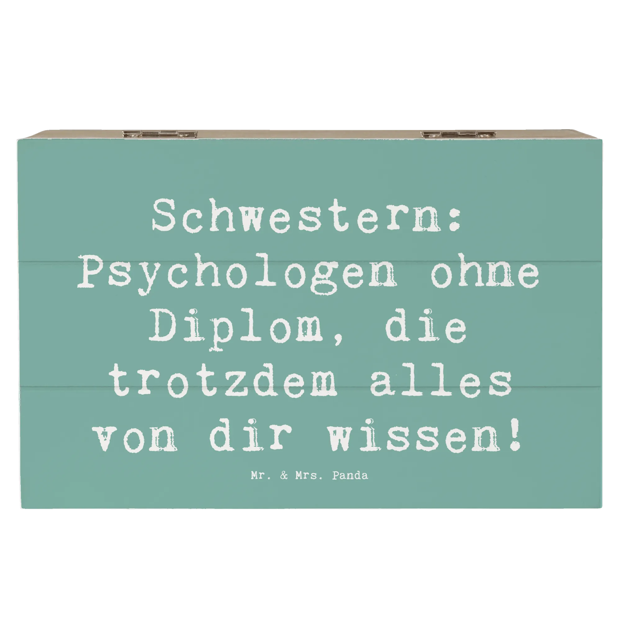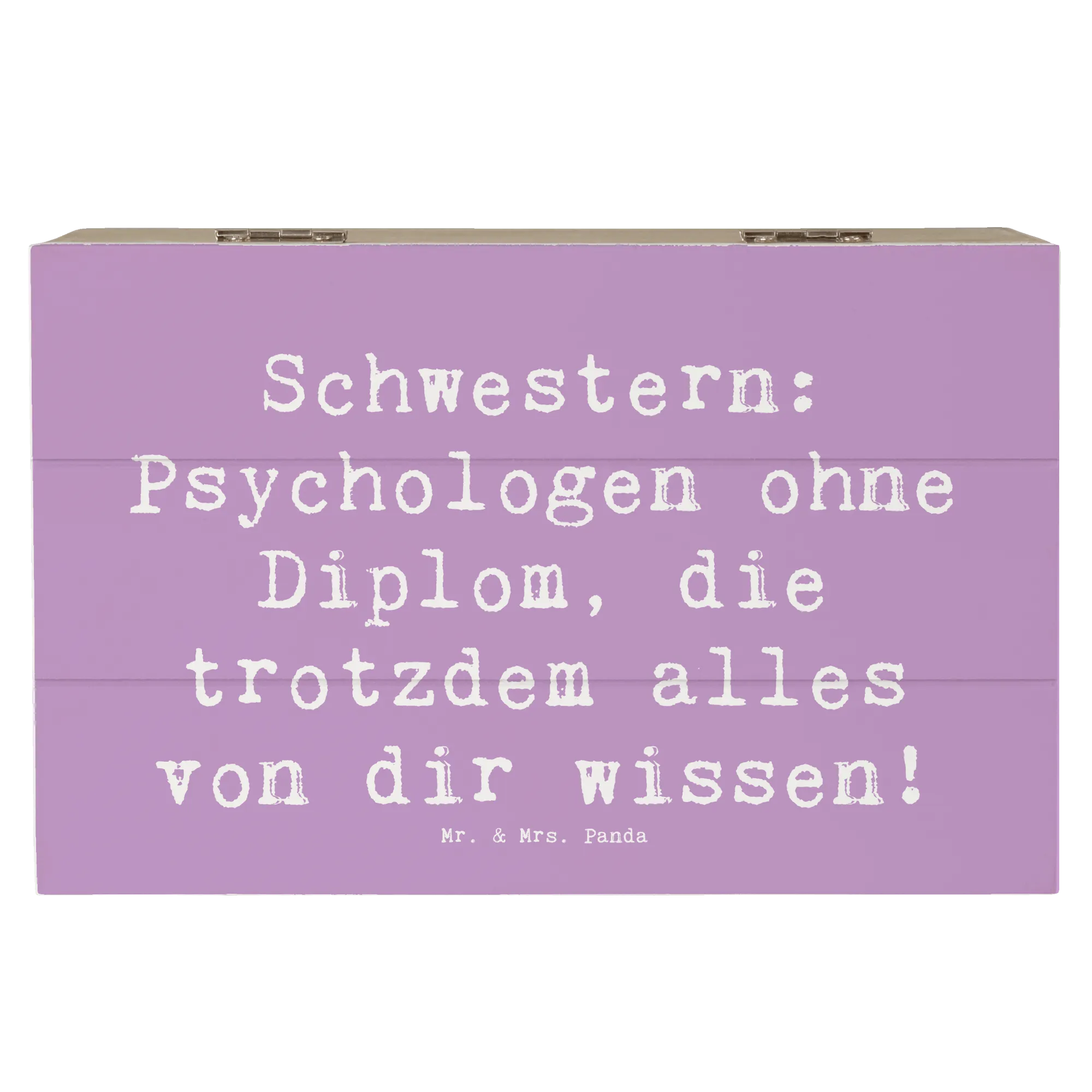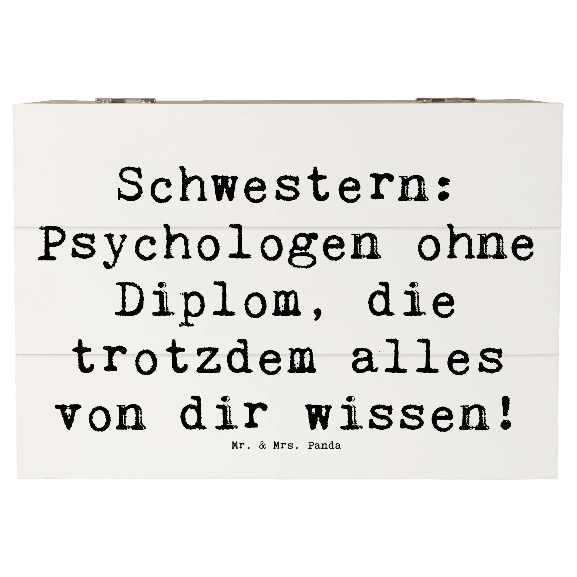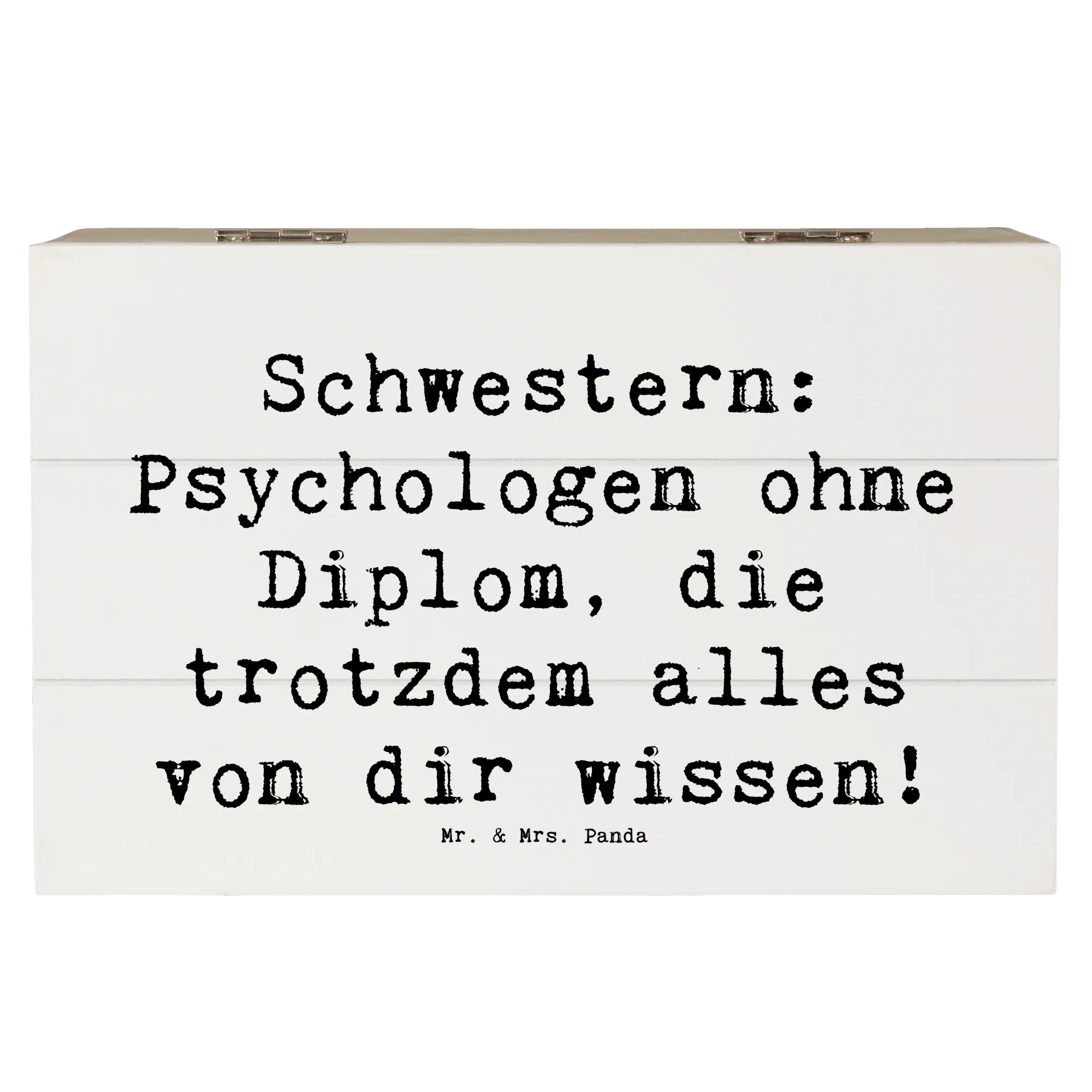 Die Beziehung zu einer Schwester ist einzigartig. Schwestern sind nicht nur Geschwister - sie sind auch beste Freundinnen, Vertraute und oft sogar Seelentröster. Mit dem Spruch „Schwestern: Psychologen ohne Diplom, die trotzdem alles von dir wissen!“ wird diese besondere Verbindung auf wunderbare Weise festgehalten. Egal, ob du die Kiste für Deine ältere Schwester oder Deine kleine Schwester kaufst, sie wird sich über dieses durchdachte Geschenk einfach freuen.