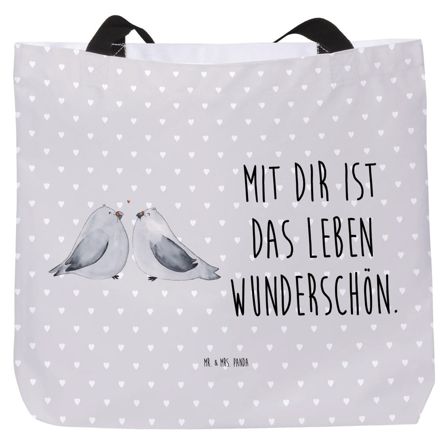 Ein wunderschöner Shopper von Mr. & Mrs. Panda: Die Turteltauben aus der Liebe-Kollektion schmiegen sich zärtlich aneinander und bringen Romantik in Deinen Alltag. Auf hellem Hintergrund zeigen zwei stilisierte Vögel in Grau- und Weißtönen ihre Zuneigung — ein kleines rotes Herz schwebt zwischen ihren Schnäbeln und symbolisiert Verbundenheit und Liebe.